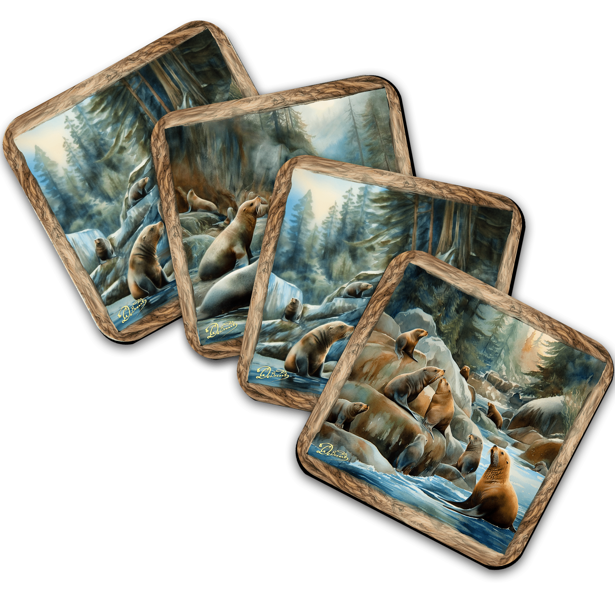 Charming Sea Lions Wooden Cork Coasters Gift Set of 4