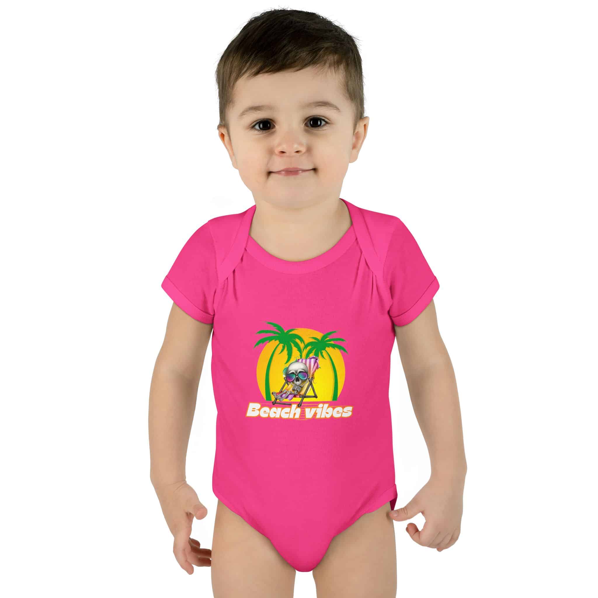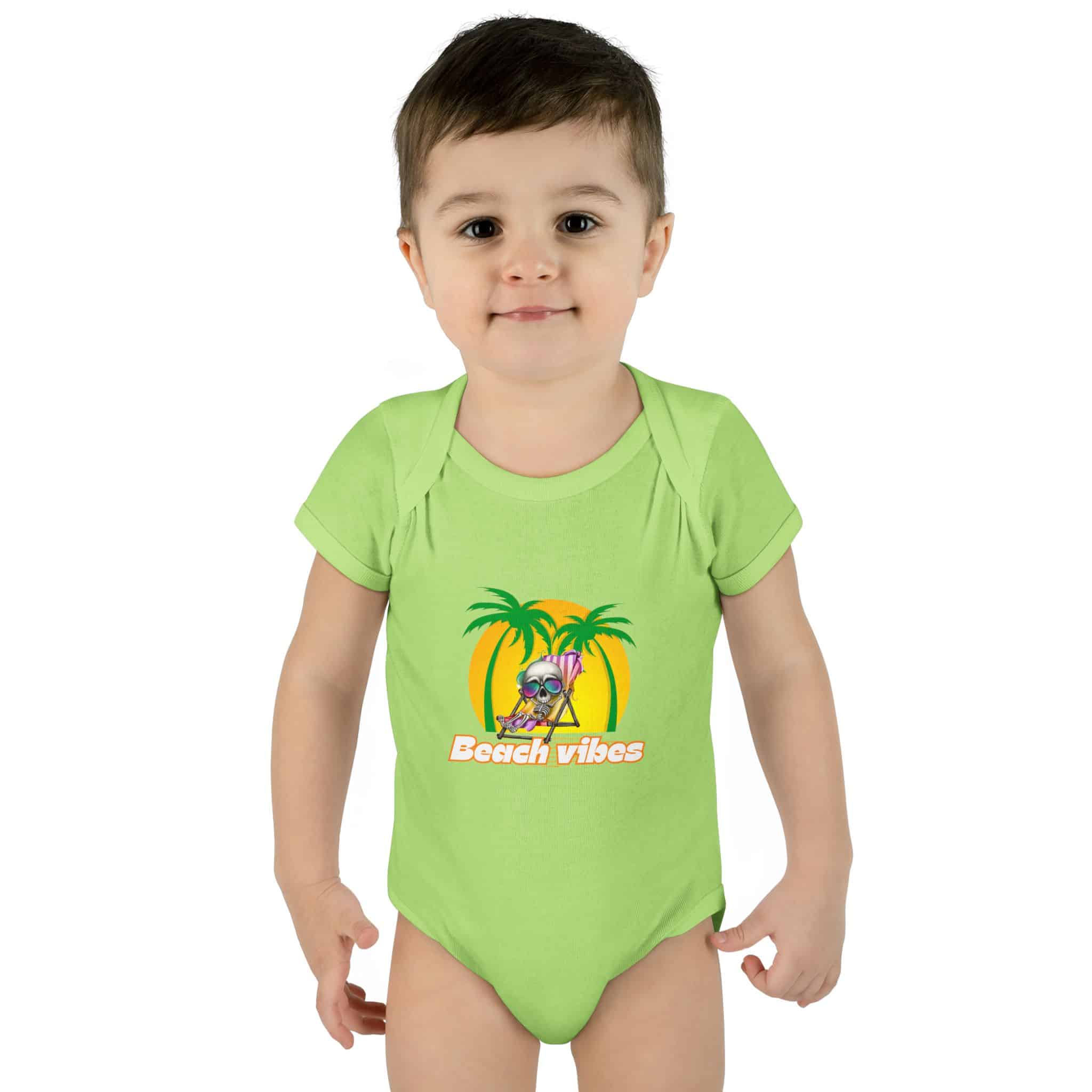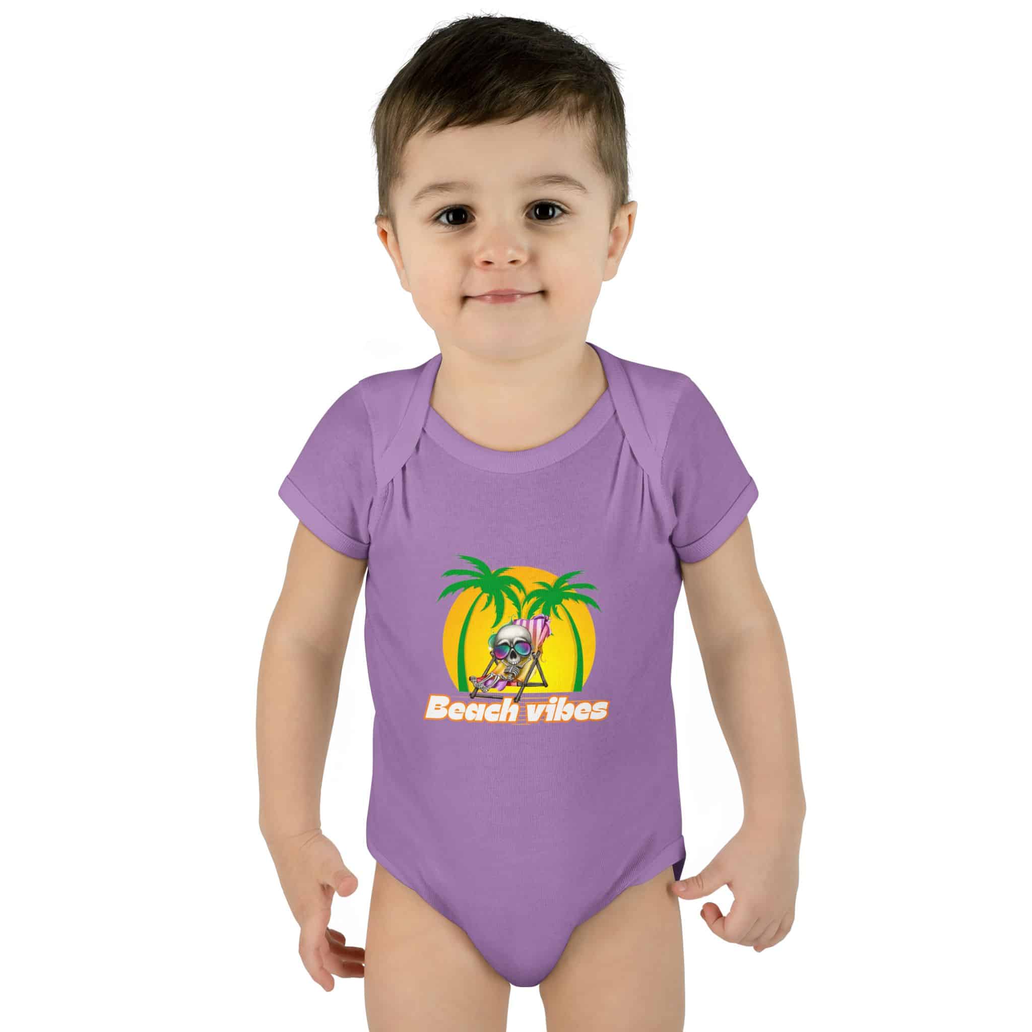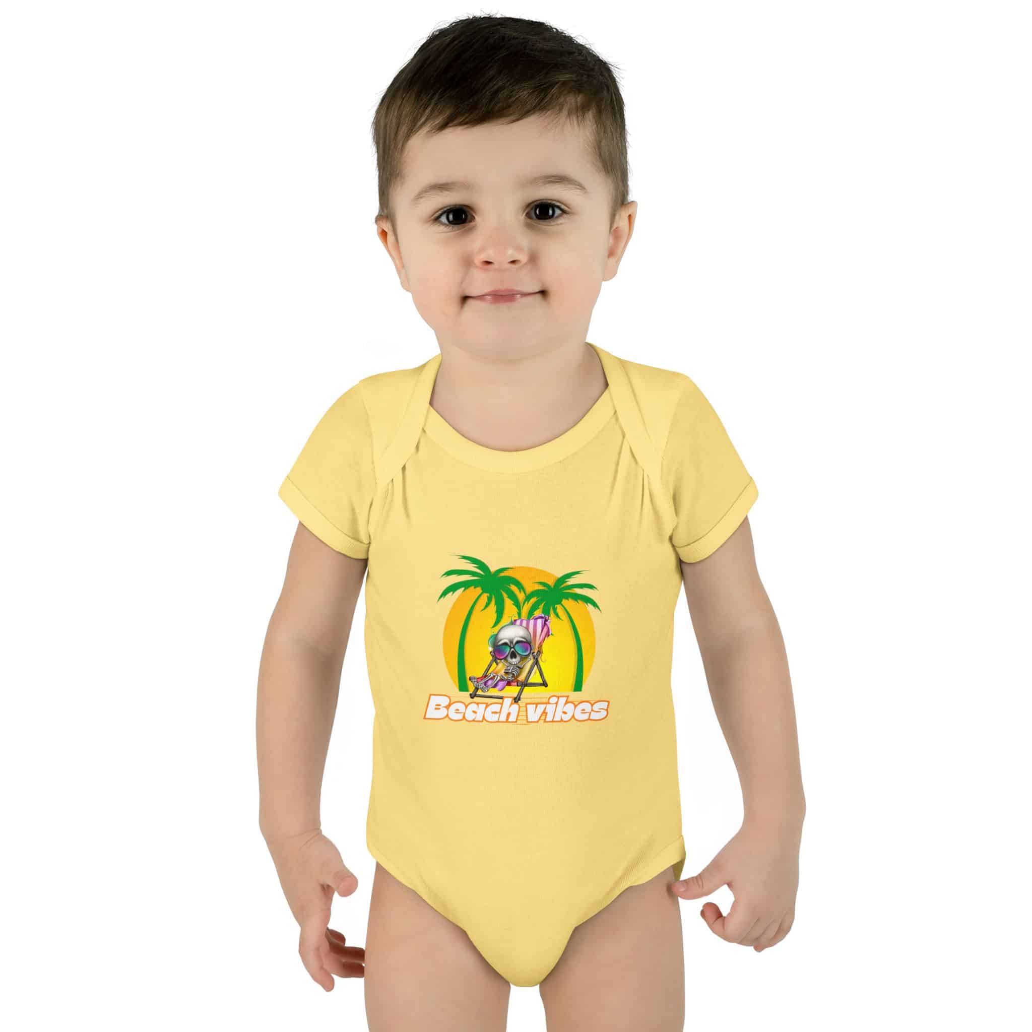 Embrace the Beach Vibes with this adorable bodysuit for infants. Made with double-needle ribbed binding and lap shoulder design for easy dressing. Perfect for little ones to wear during summer vacations or beach trips, or as a cute gift for baby showers or birthdays.