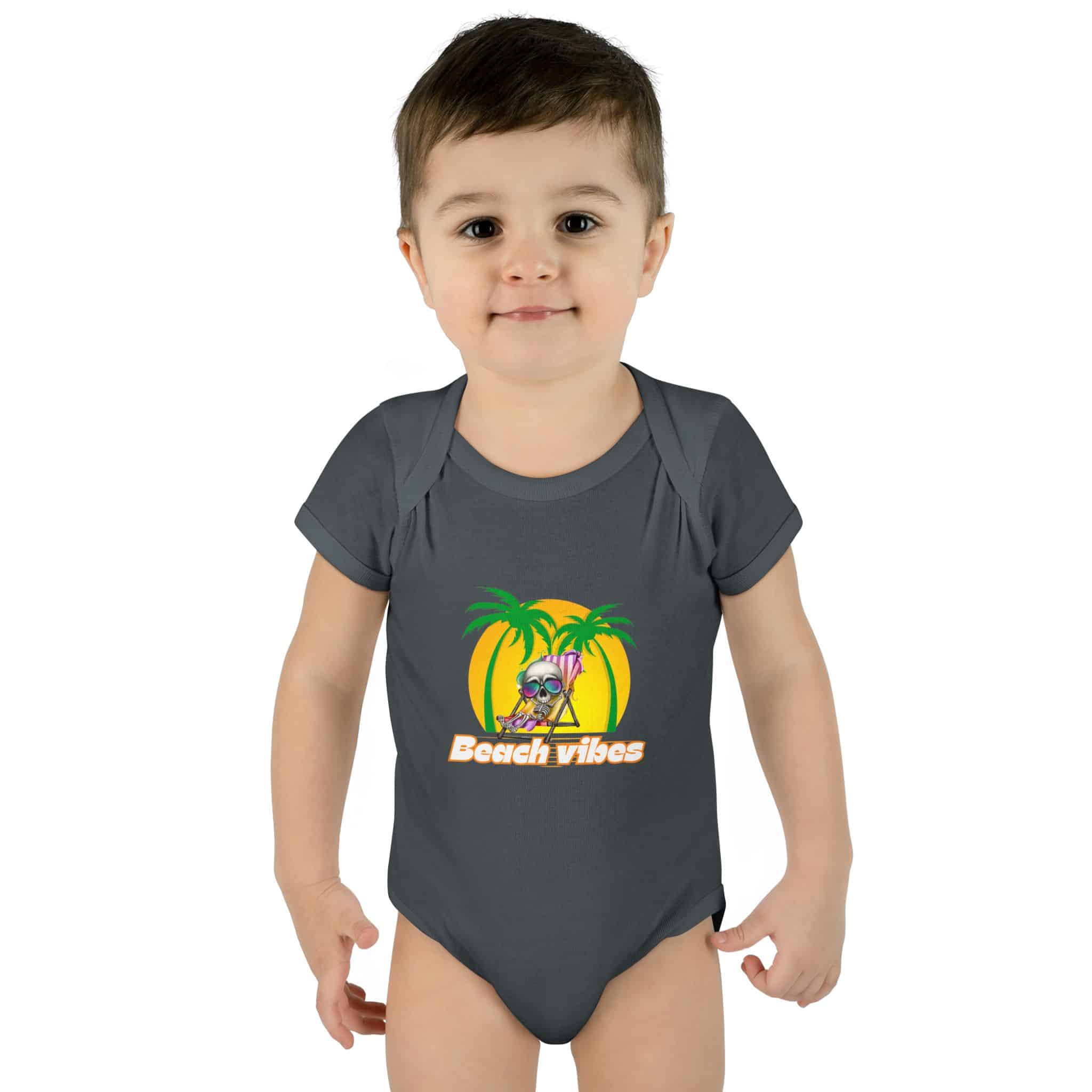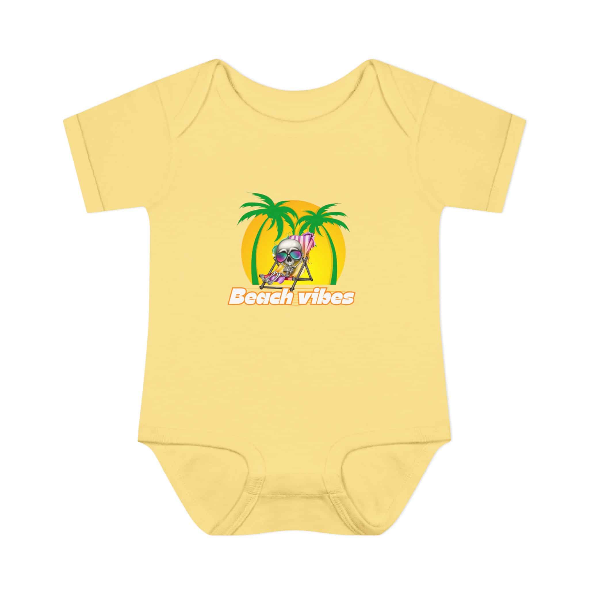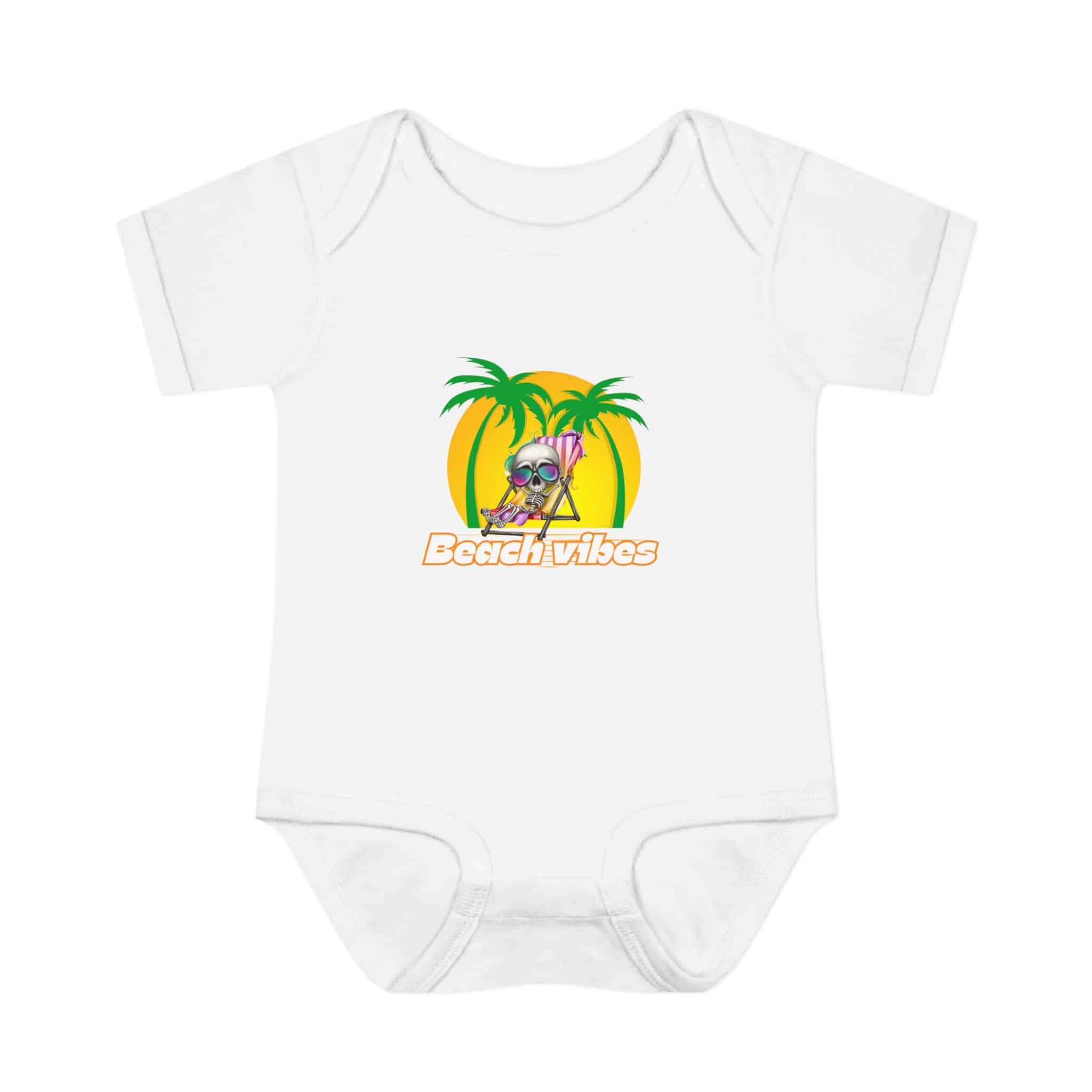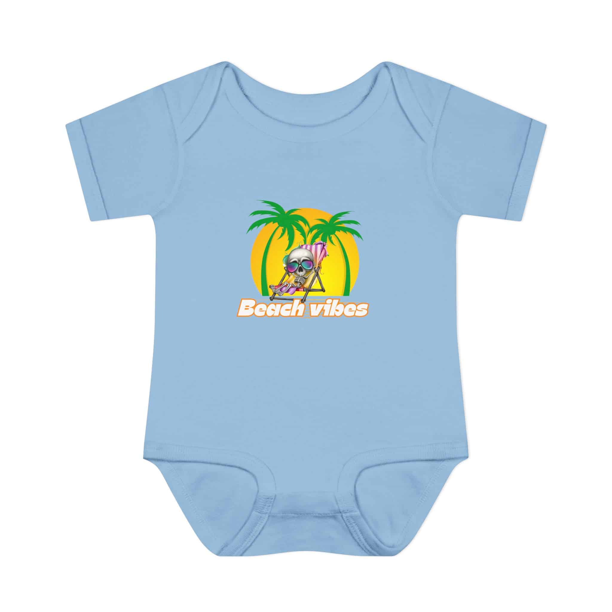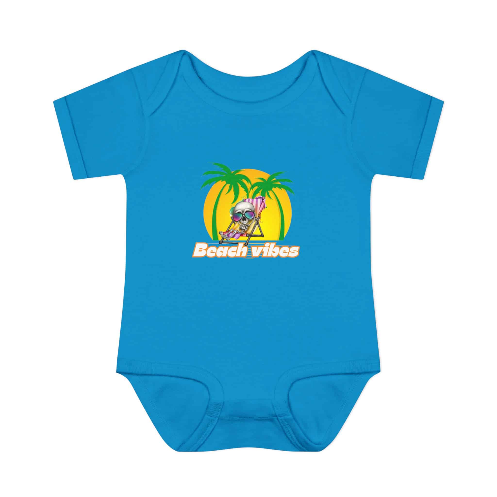 Embrace the Beach Vibes with this adorable bodysuit for infants. Made with double-needle ribbed binding and lap shoulder design for easy dressing. Perfect for little ones to wear during summer vacations or beach trips, or as a cute gift for baby showers or birthdays.