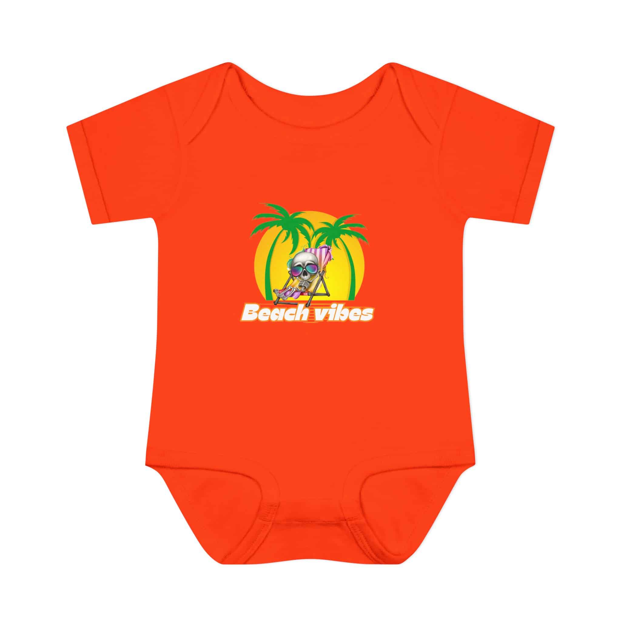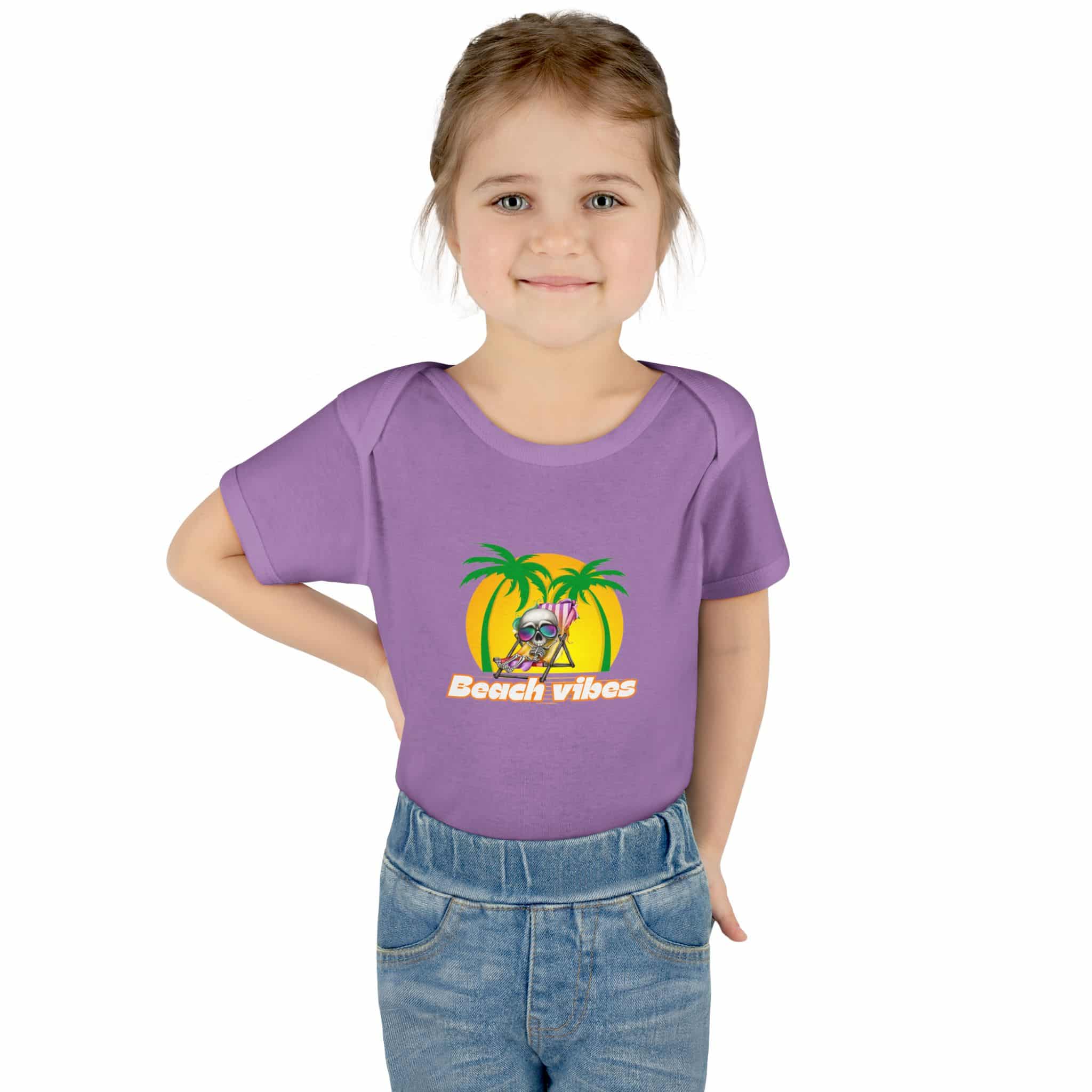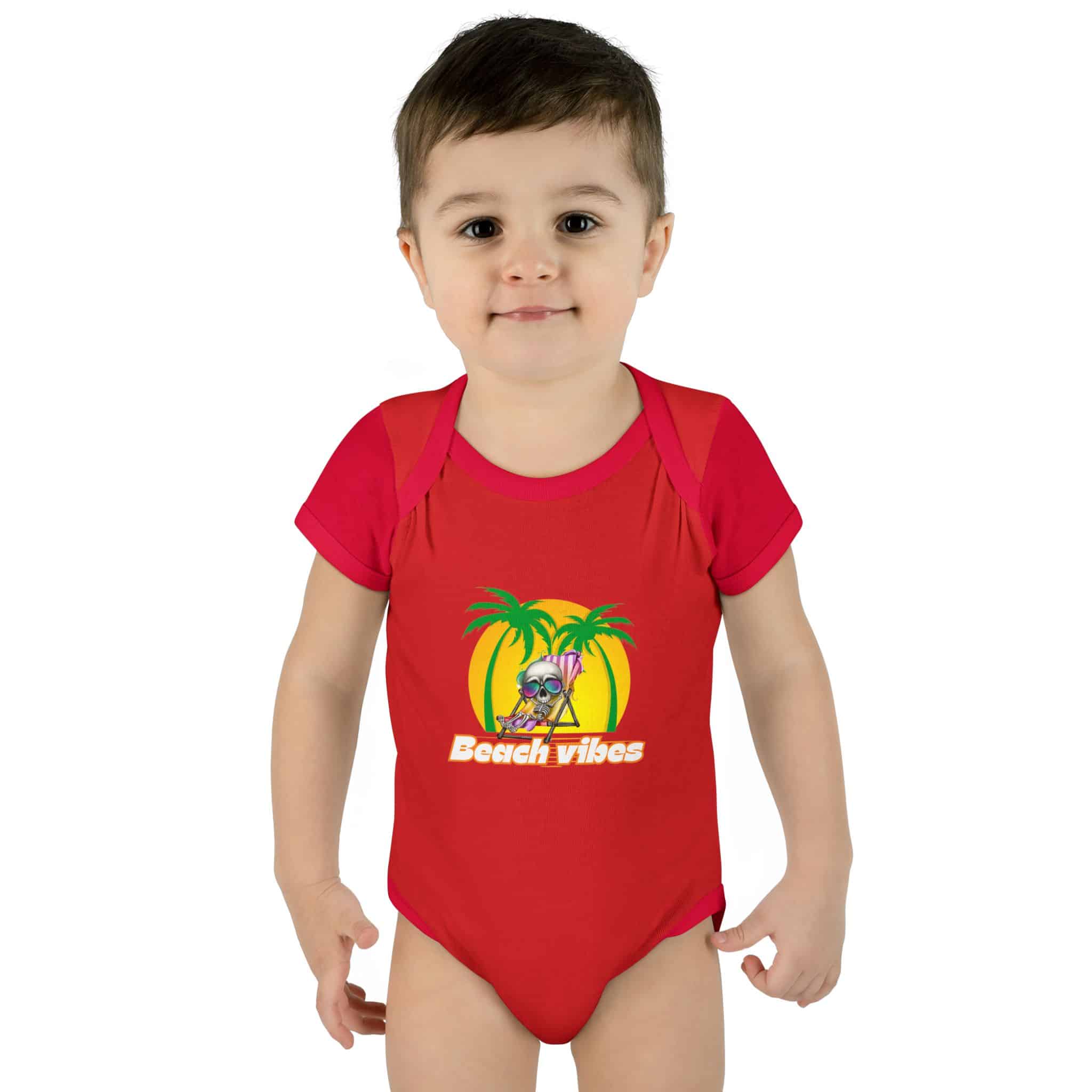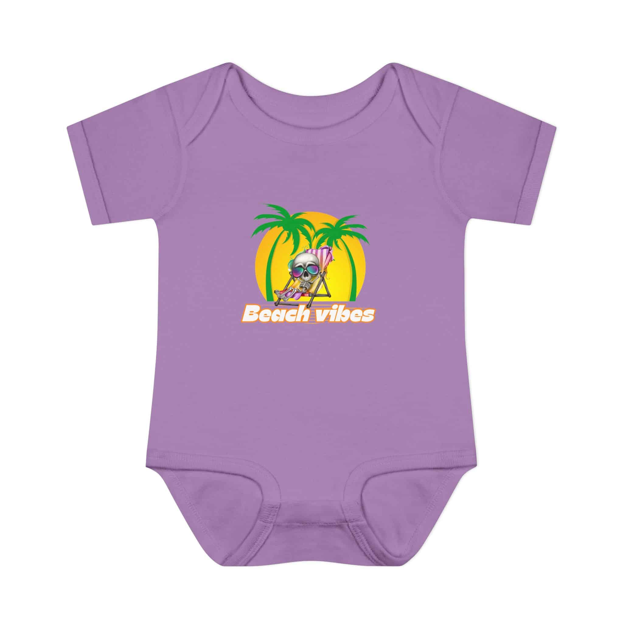 Embrace the Beach Vibes with this adorable bodysuit for infants. Made with double-needle ribbed binding and lap shoulder design for easy dressing. Perfect for little ones to wear during summer vacations or beach trips, or as a cute gift for baby showers or birthdays.