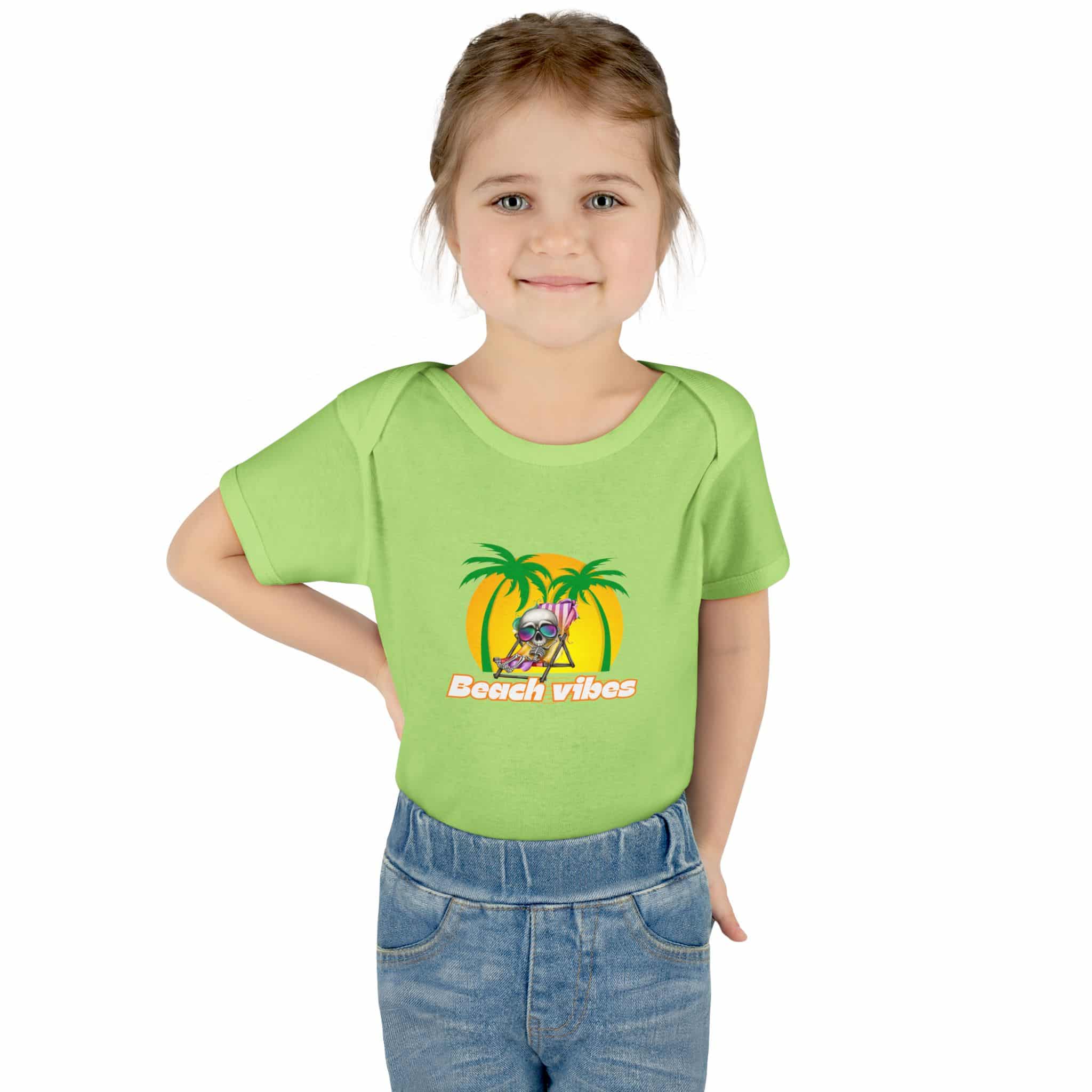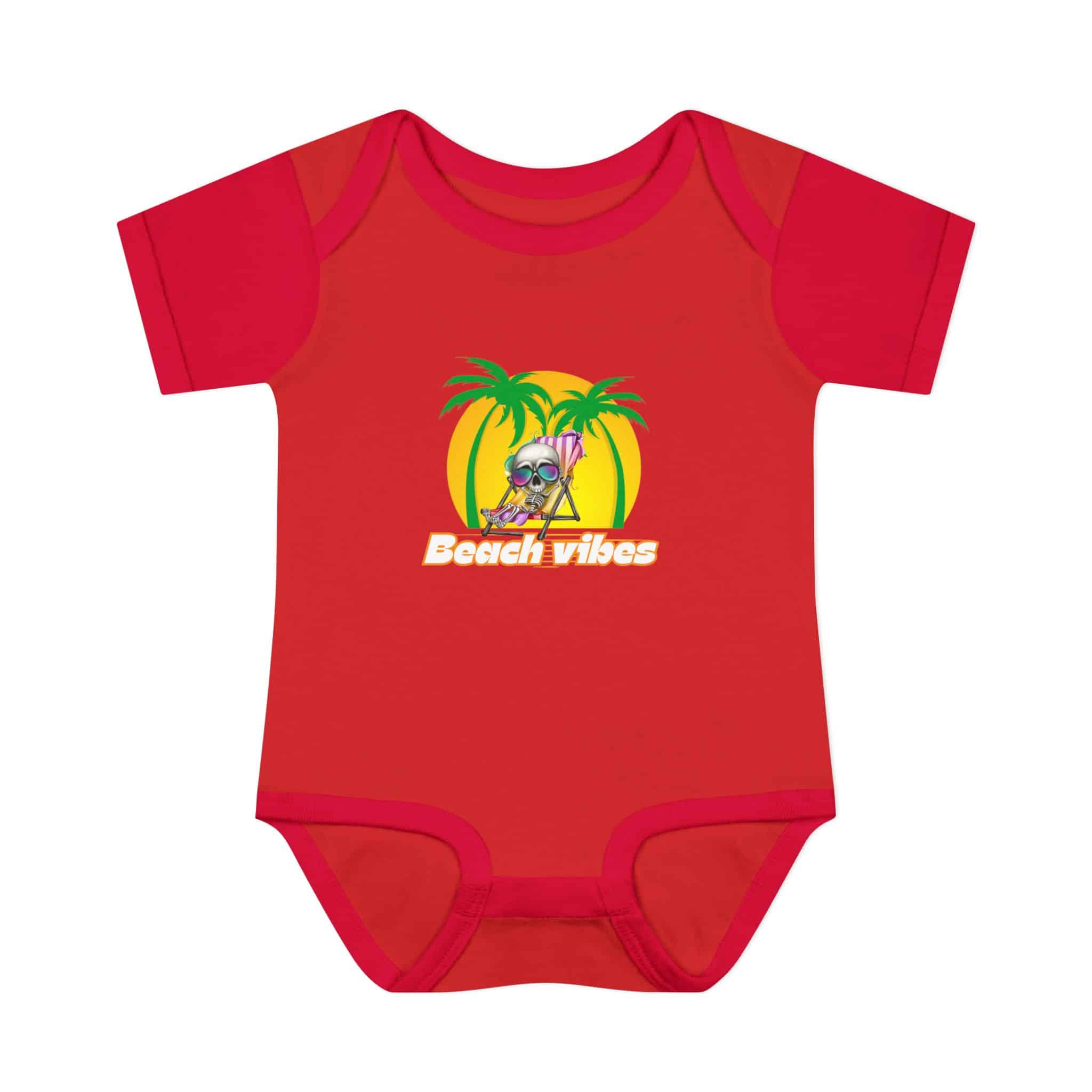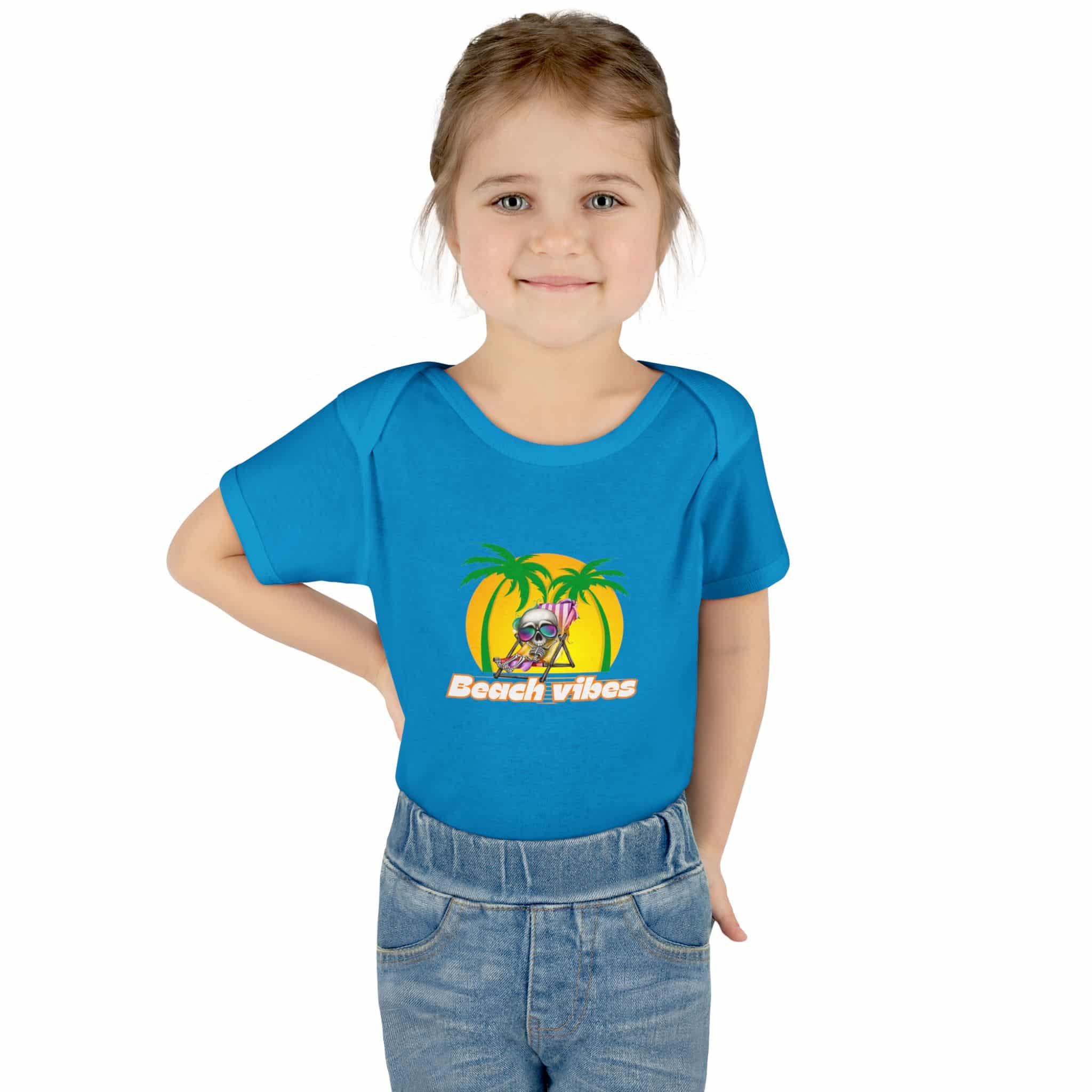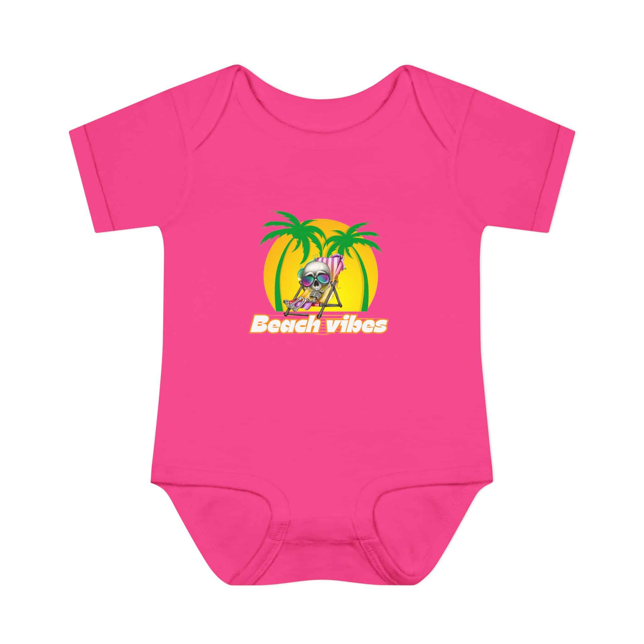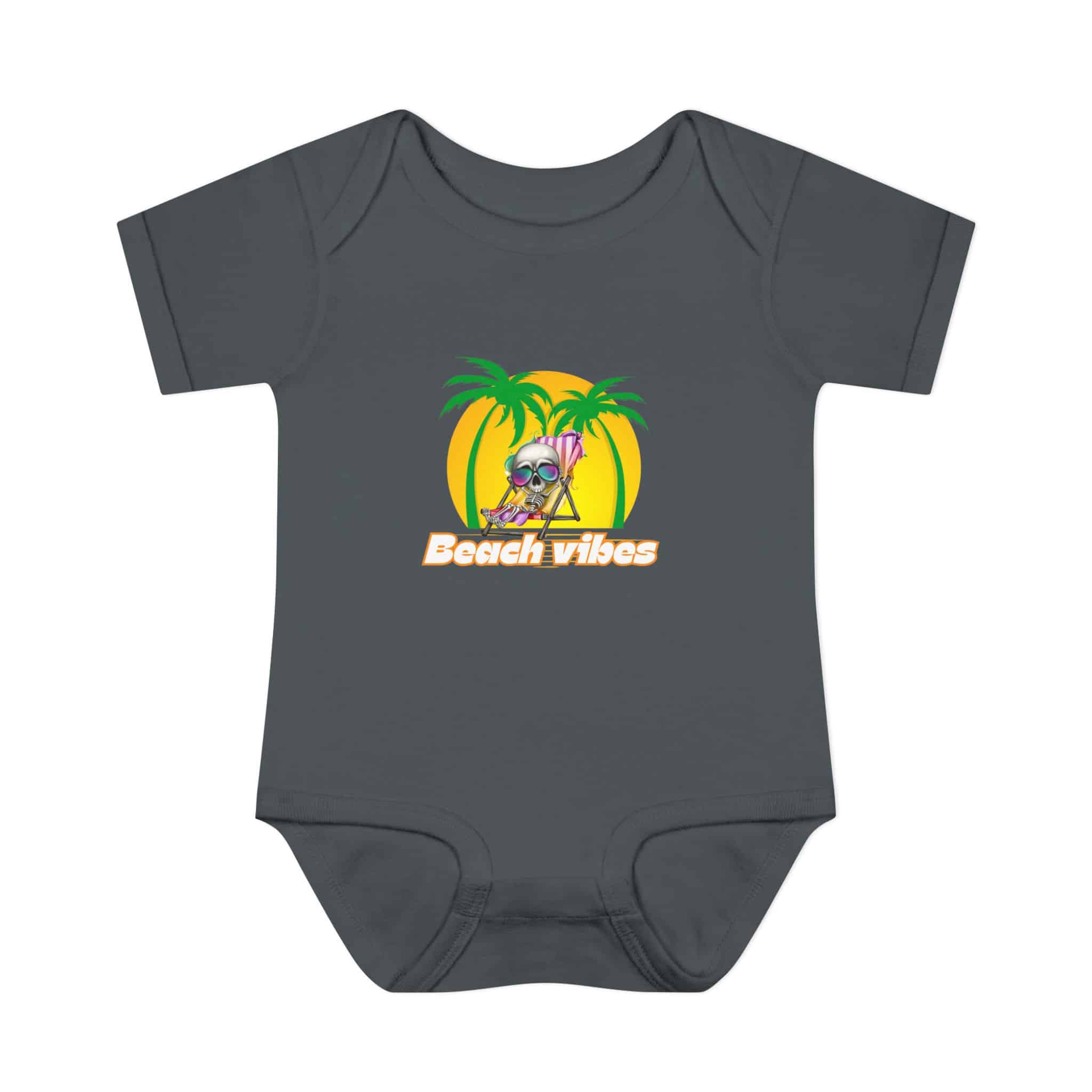 Embrace the Beach Vibes with this adorable bodysuit for infants. Made with double-needle ribbed binding and lap shoulder design for easy dressing. Perfect for little ones to wear during summer vacations or beach trips, or as a cute gift for baby showers or birthdays.