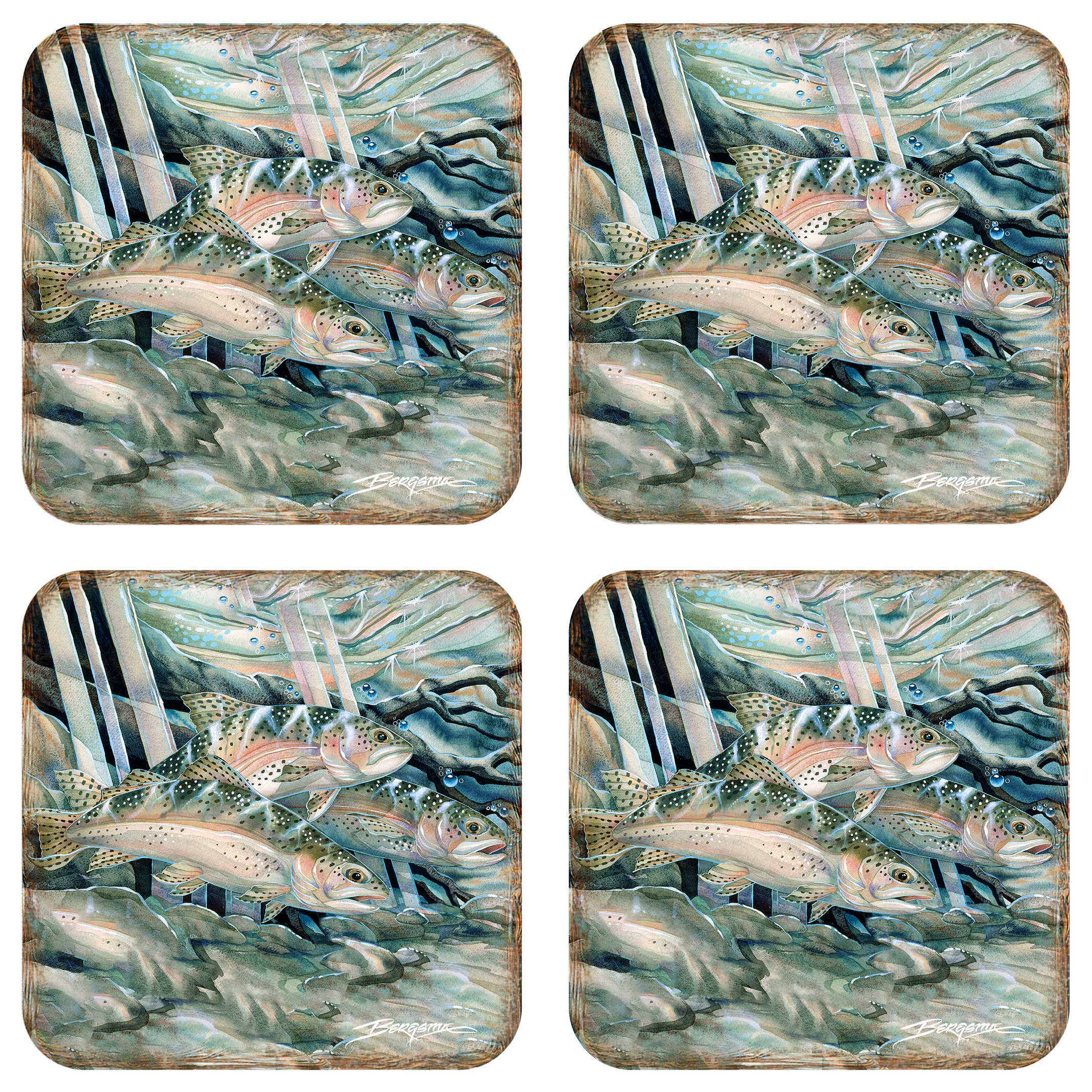 Protect your furniture in style with this Catch the Rainbow Trout Wooden Cork Coasters Gift Set by J. Bergsma. Each set includes 4 coasters featuring stunning wildlife artwork. Made of durable cork, these coasters not only preserve your surfaces, but also add a touch of nature to your home decor. A perfect gift for any wildlife enthusiast.