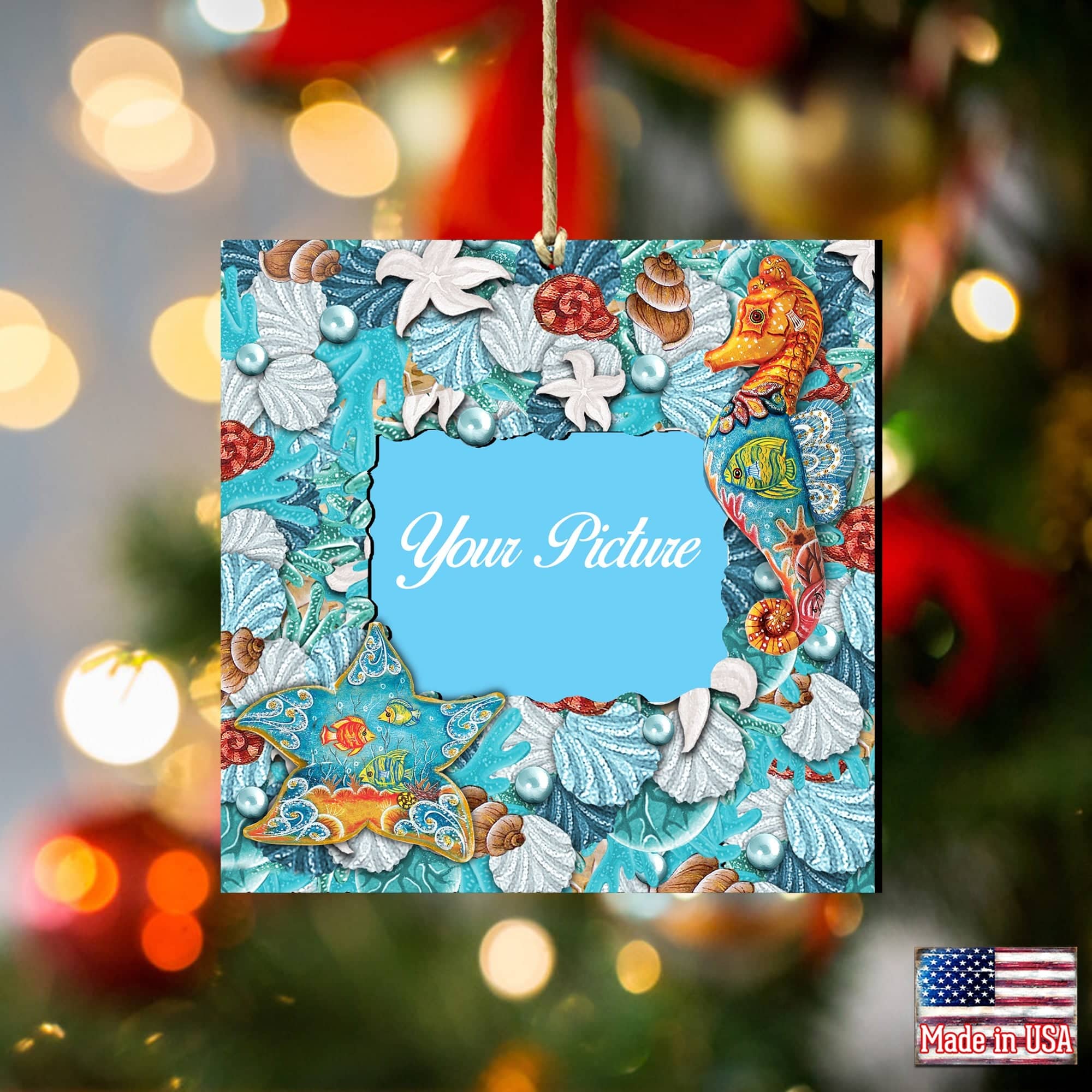 Festive holiday ornaments, Picture frame design – displays a photo with our Coastal Ornament. Shop today and discover unique styles for your home, office, Christmas tree, and more from G. Debrekht Ornaments Store.