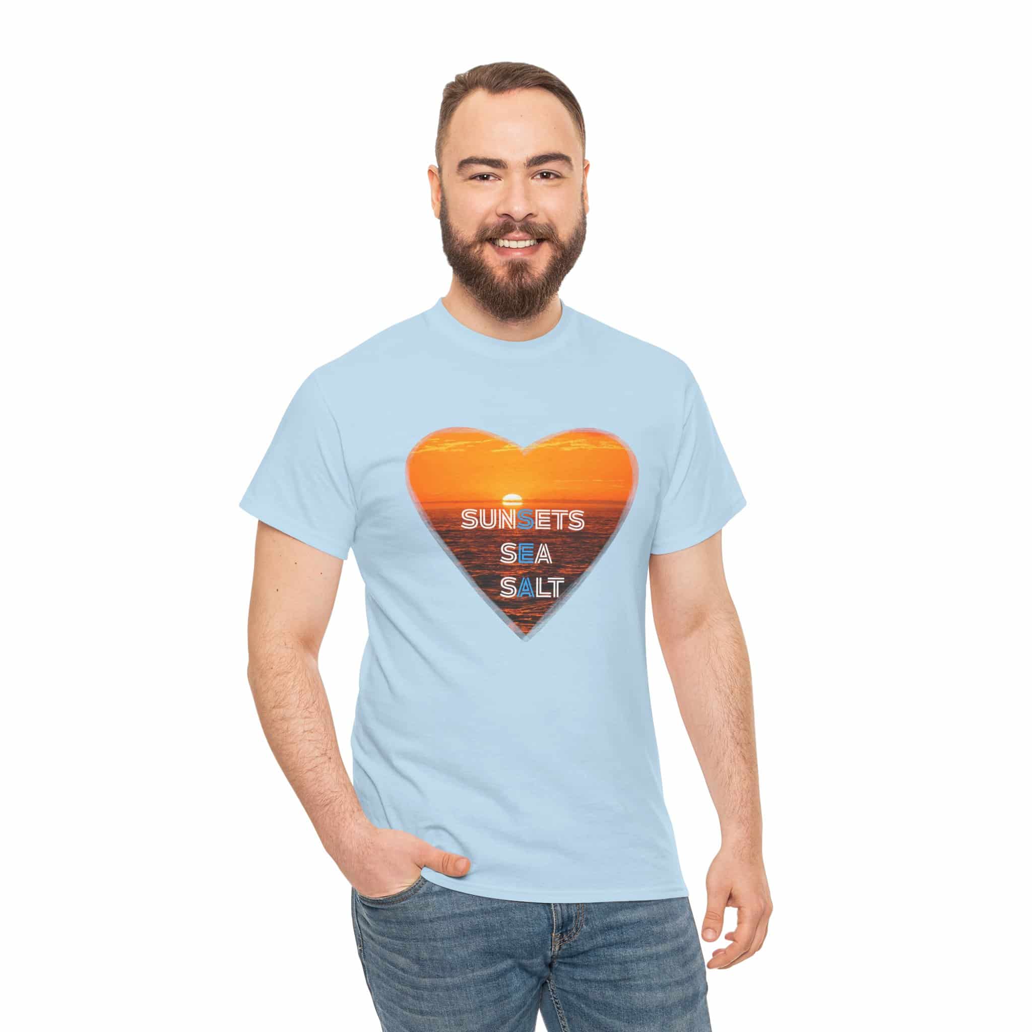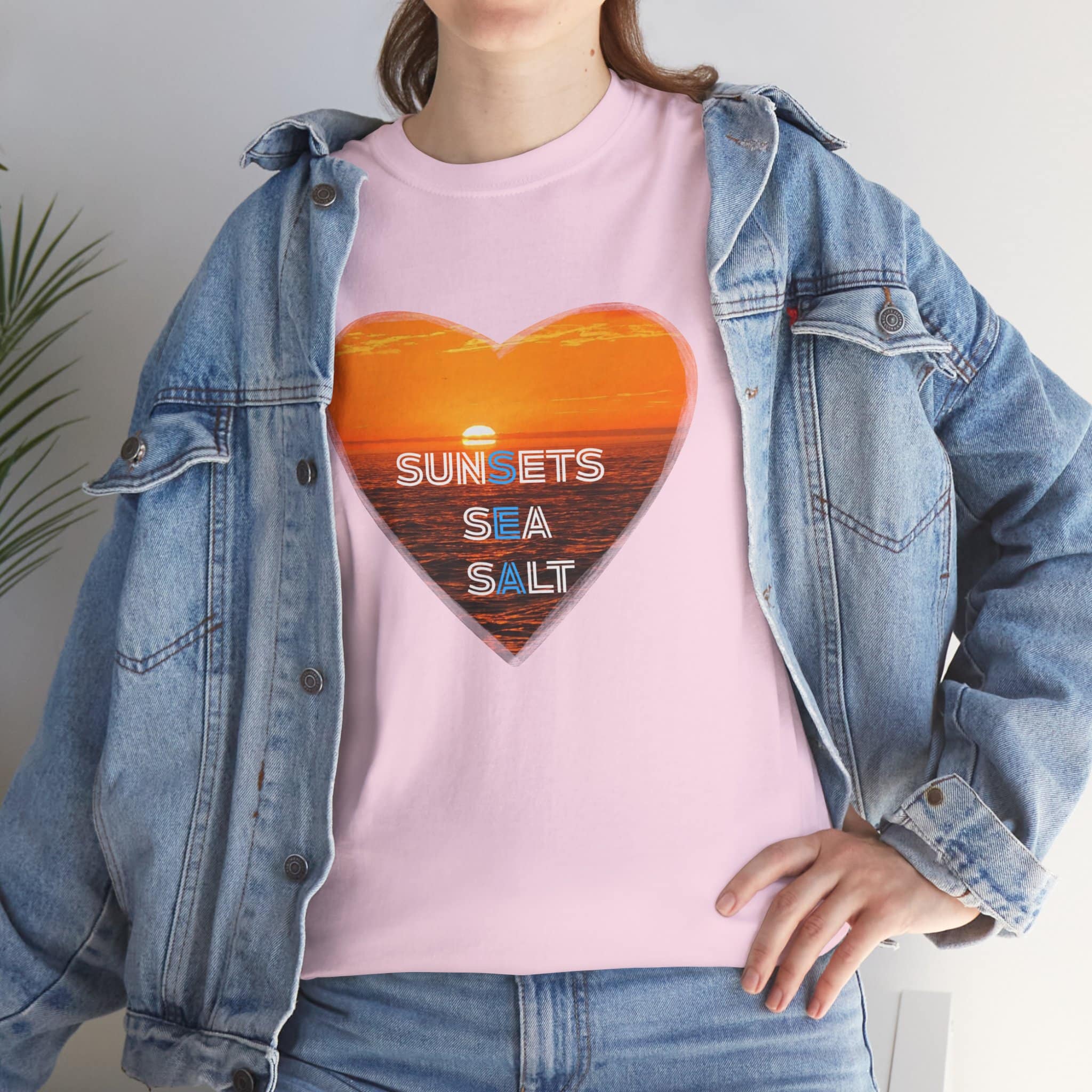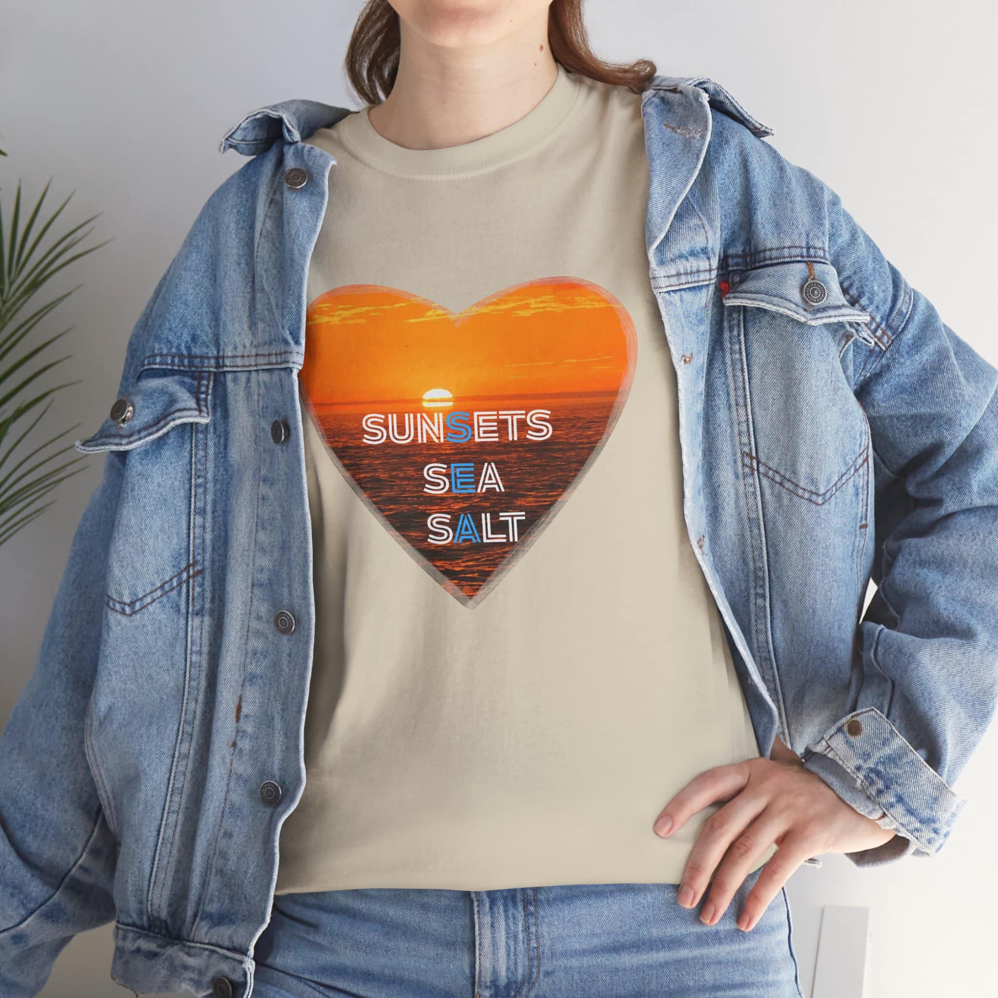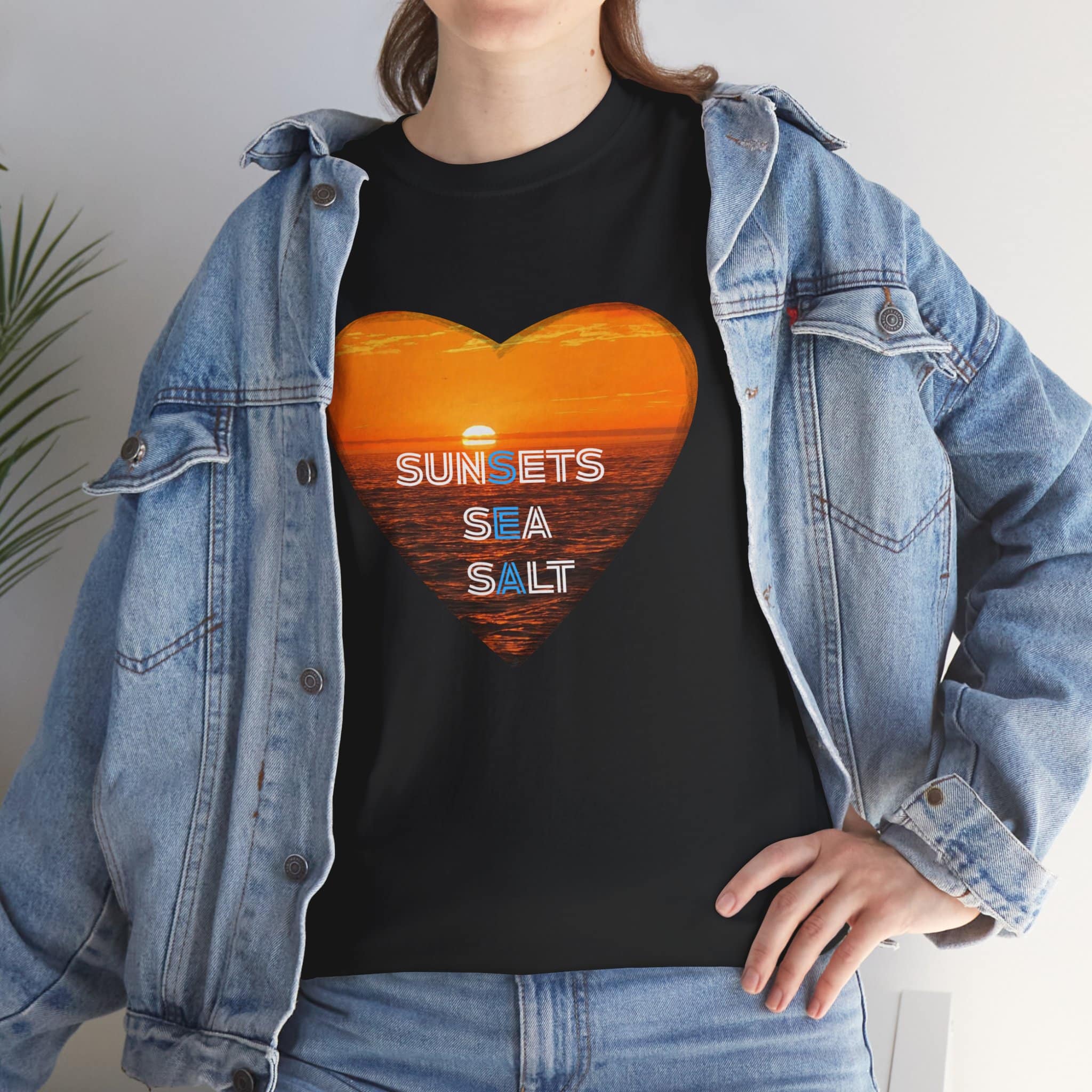 A romantic and serene Tee featuring a sunset over the ocean photo in the shape of a heart with the words Sunsets, Sea, Salt. Perfect for those who love nature and peaceful vibes. Ideal for beach lovers and sunset enthusiasts. Great for Valentine’s Day, beach vacations, or casual everyday wear.