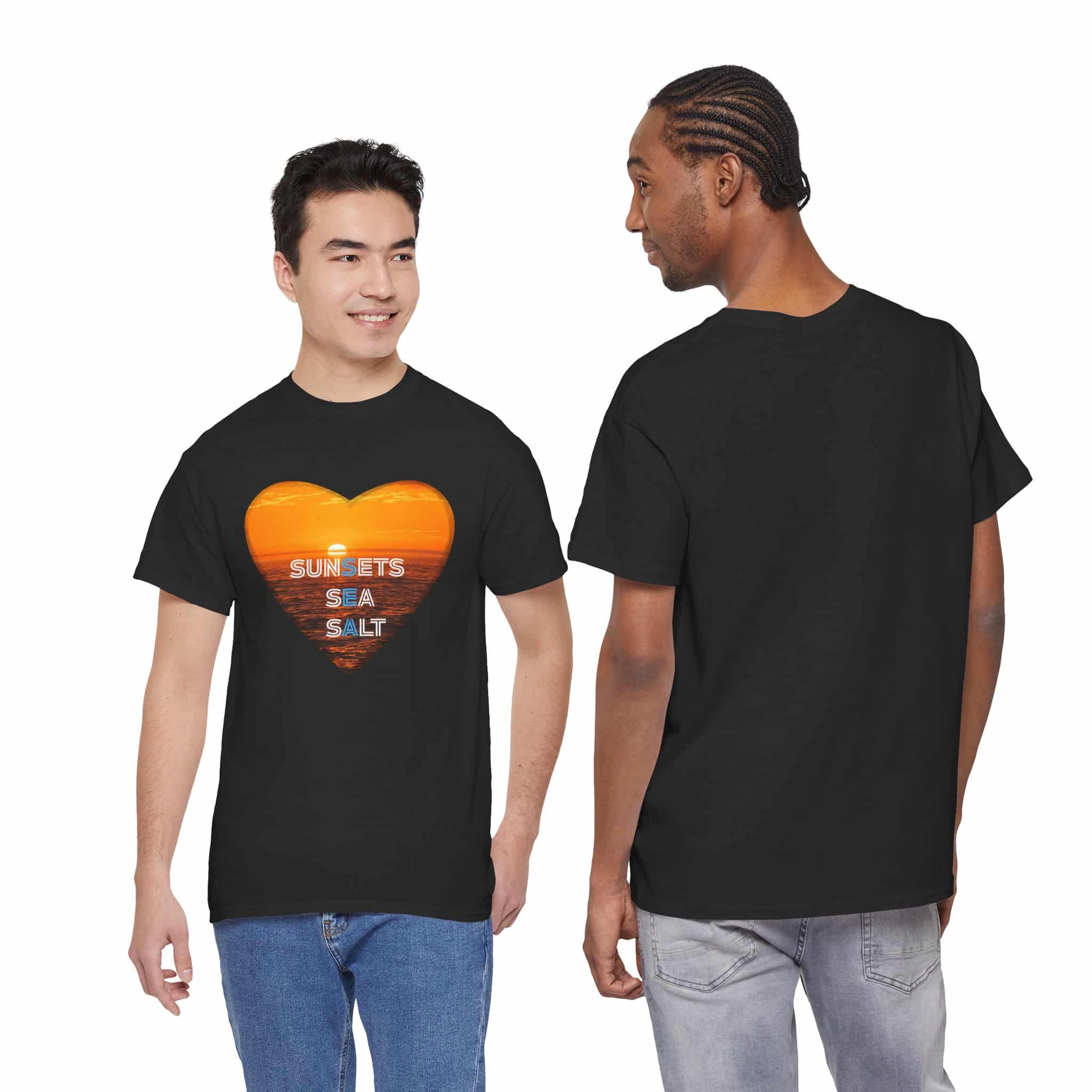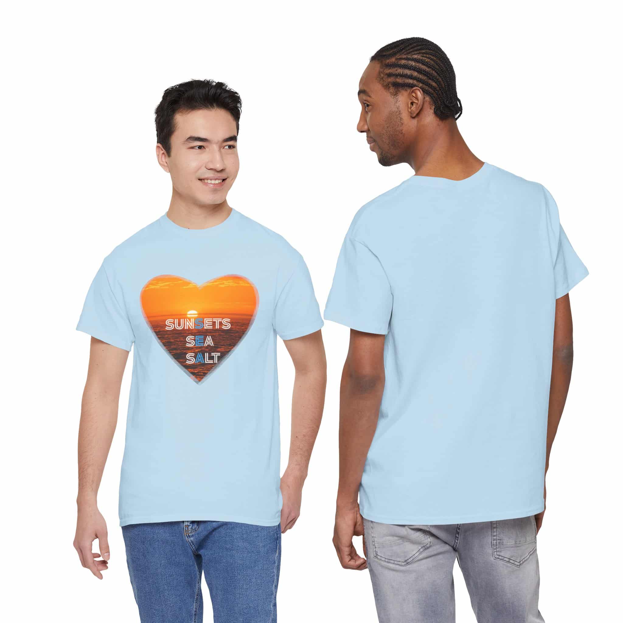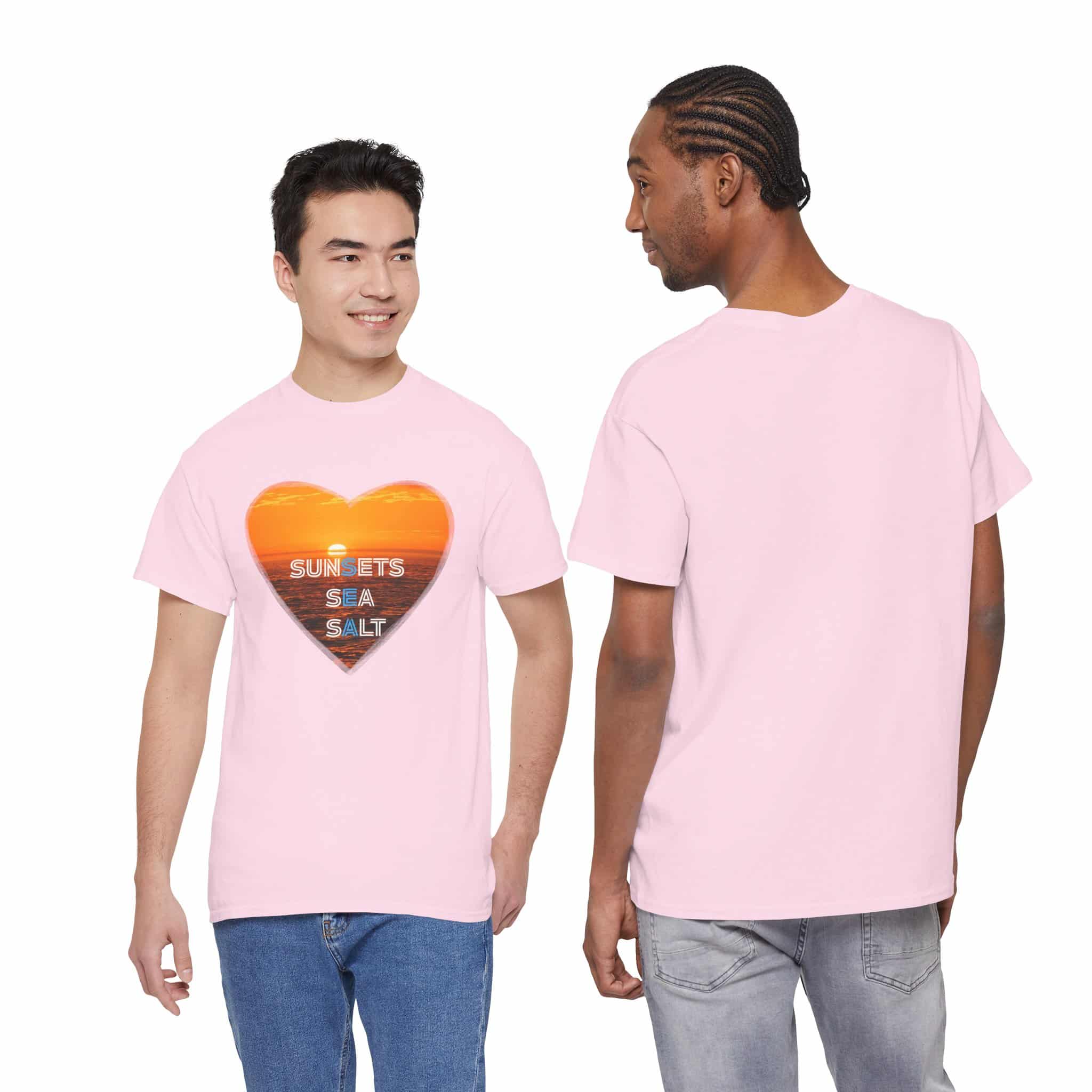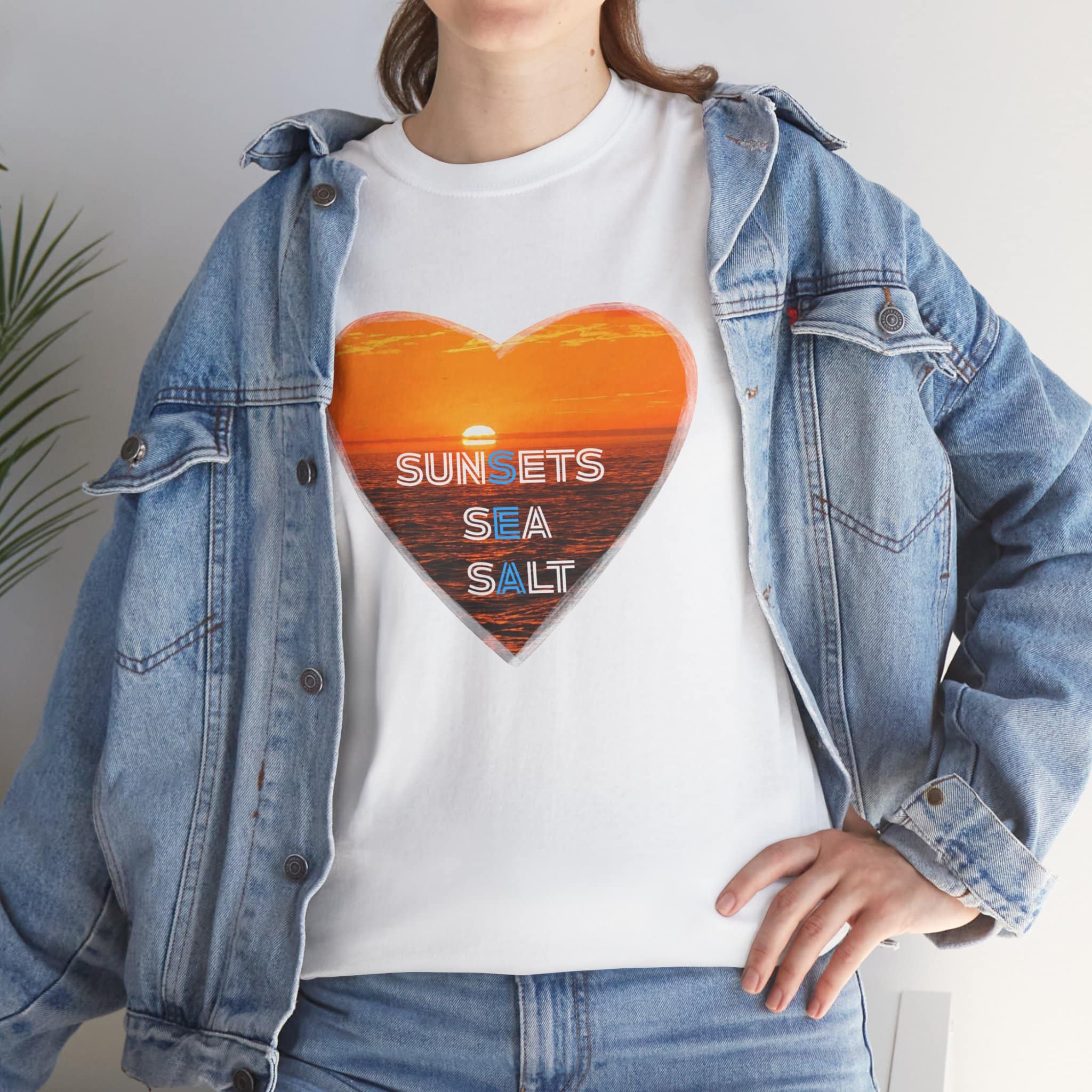 A romantic and serene Tee featuring a sunset over the ocean photo in the shape of a heart with the words Sunsets, Sea, Salt. Perfect for those who love nature and peaceful vibes. Ideal for beach lovers and sunset enthusiasts. Great for Valentine’s Day, beach vacations, or casual everyday wear.