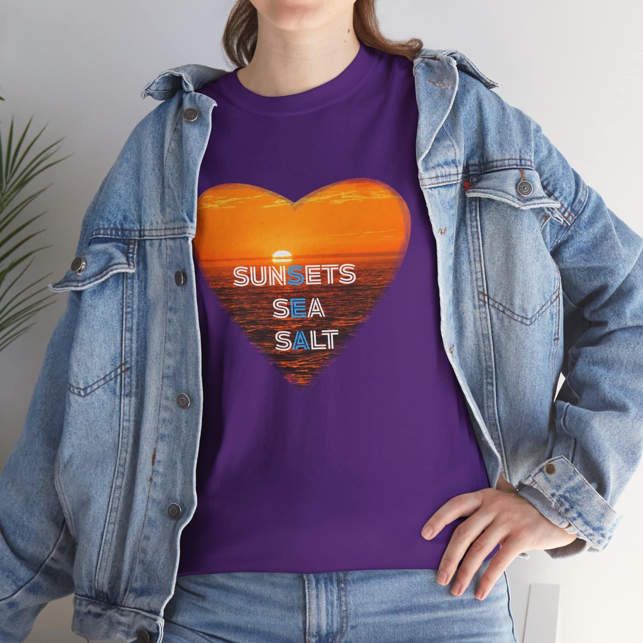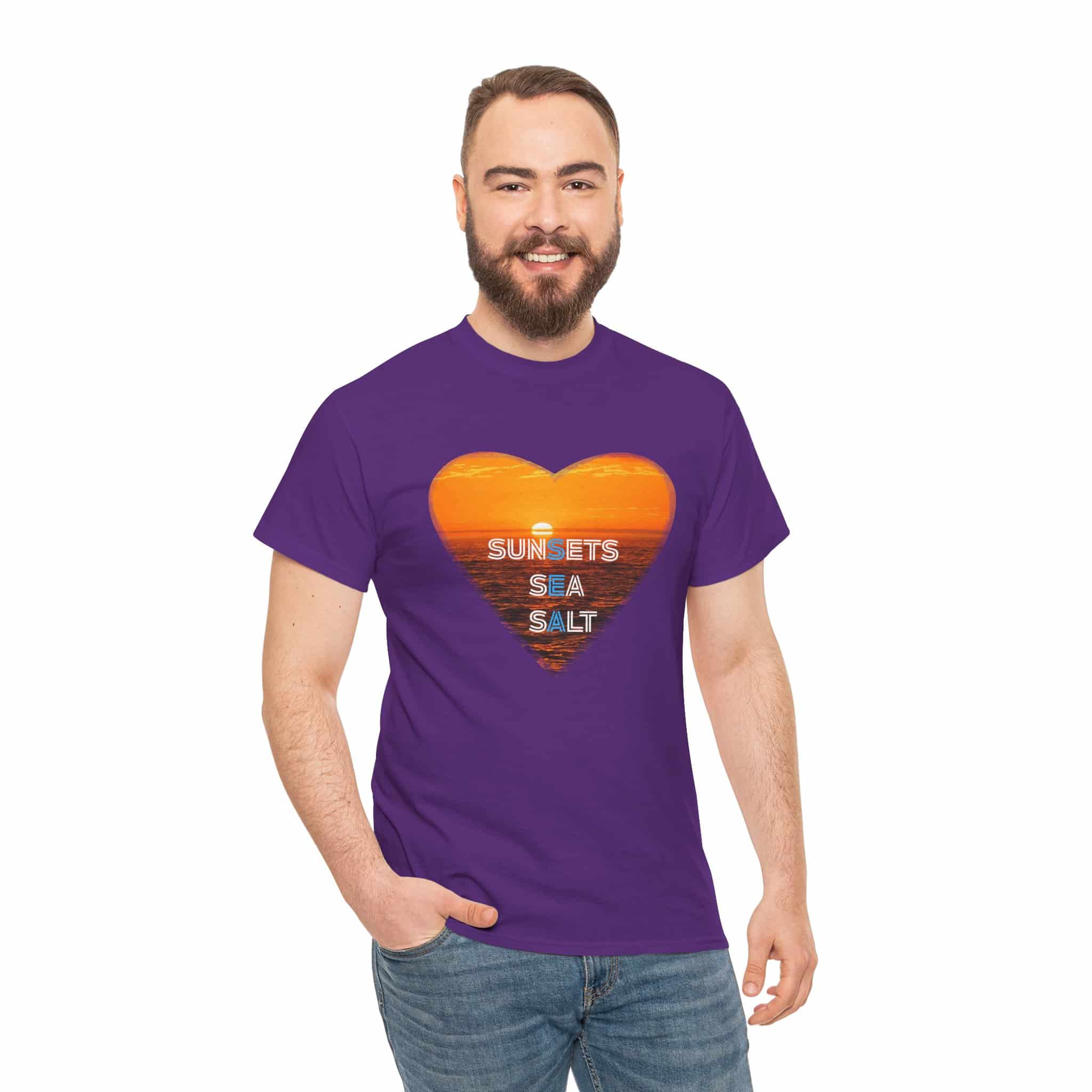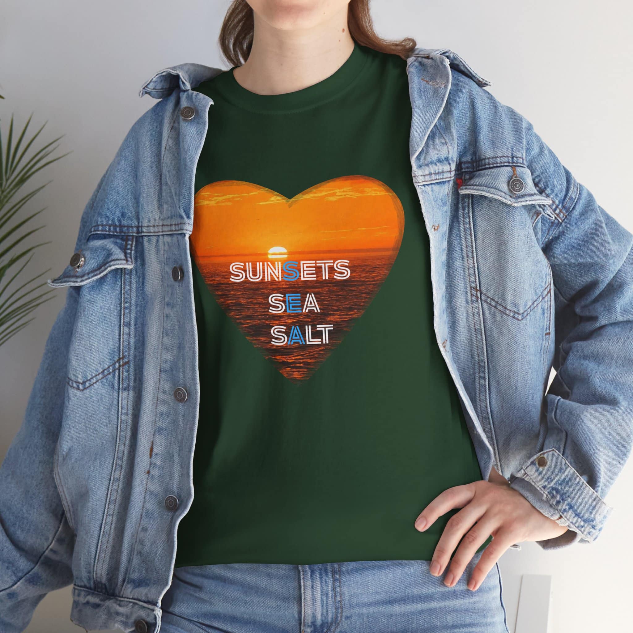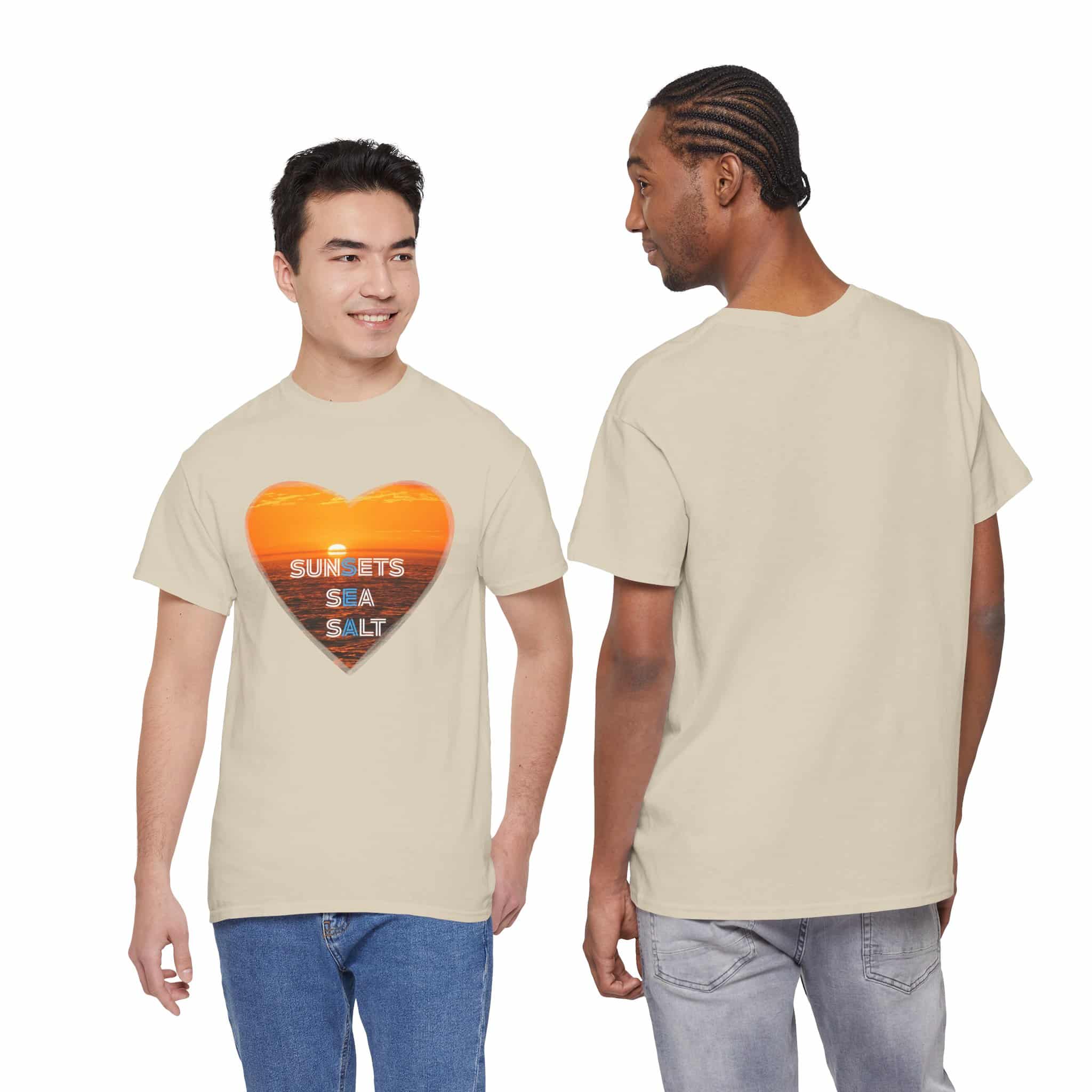 A romantic and serene Tee featuring a sunset over the ocean photo in the shape of a heart with the words Sunsets, Sea, Salt. Perfect for those who love nature and peaceful vibes. Ideal for beach lovers and sunset enthusiasts. Great for Valentine’s Day, beach vacations, or casual everyday wear.