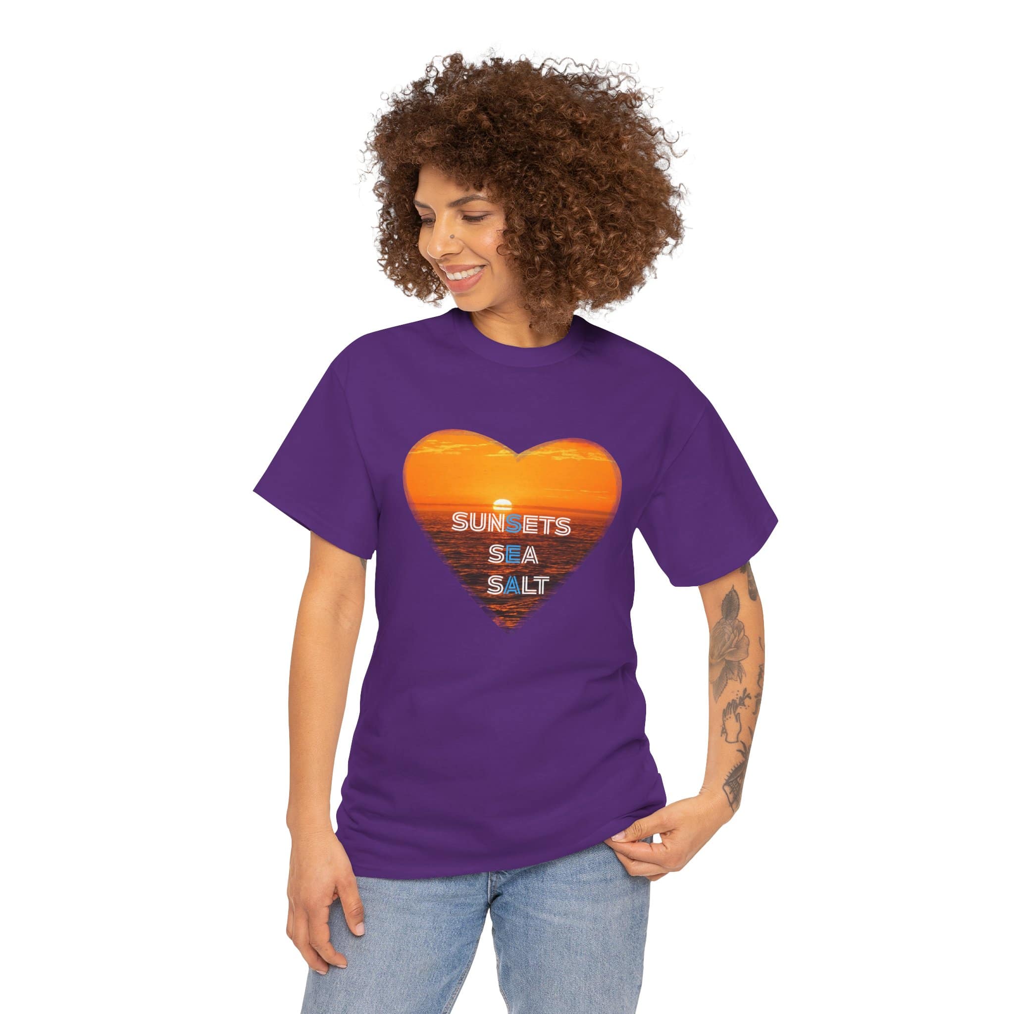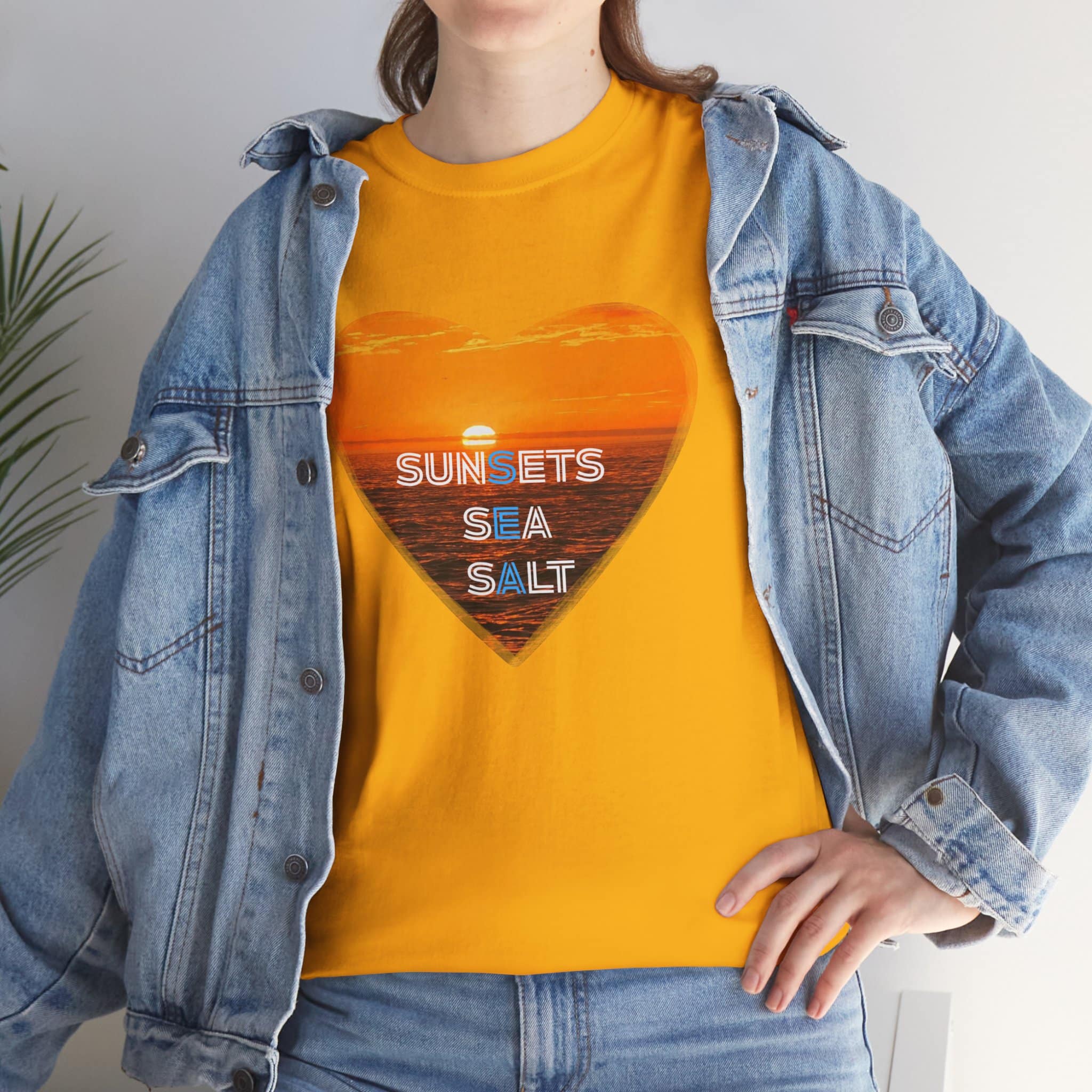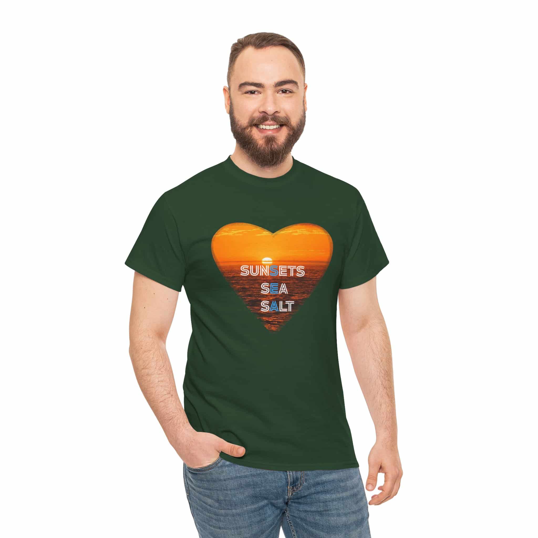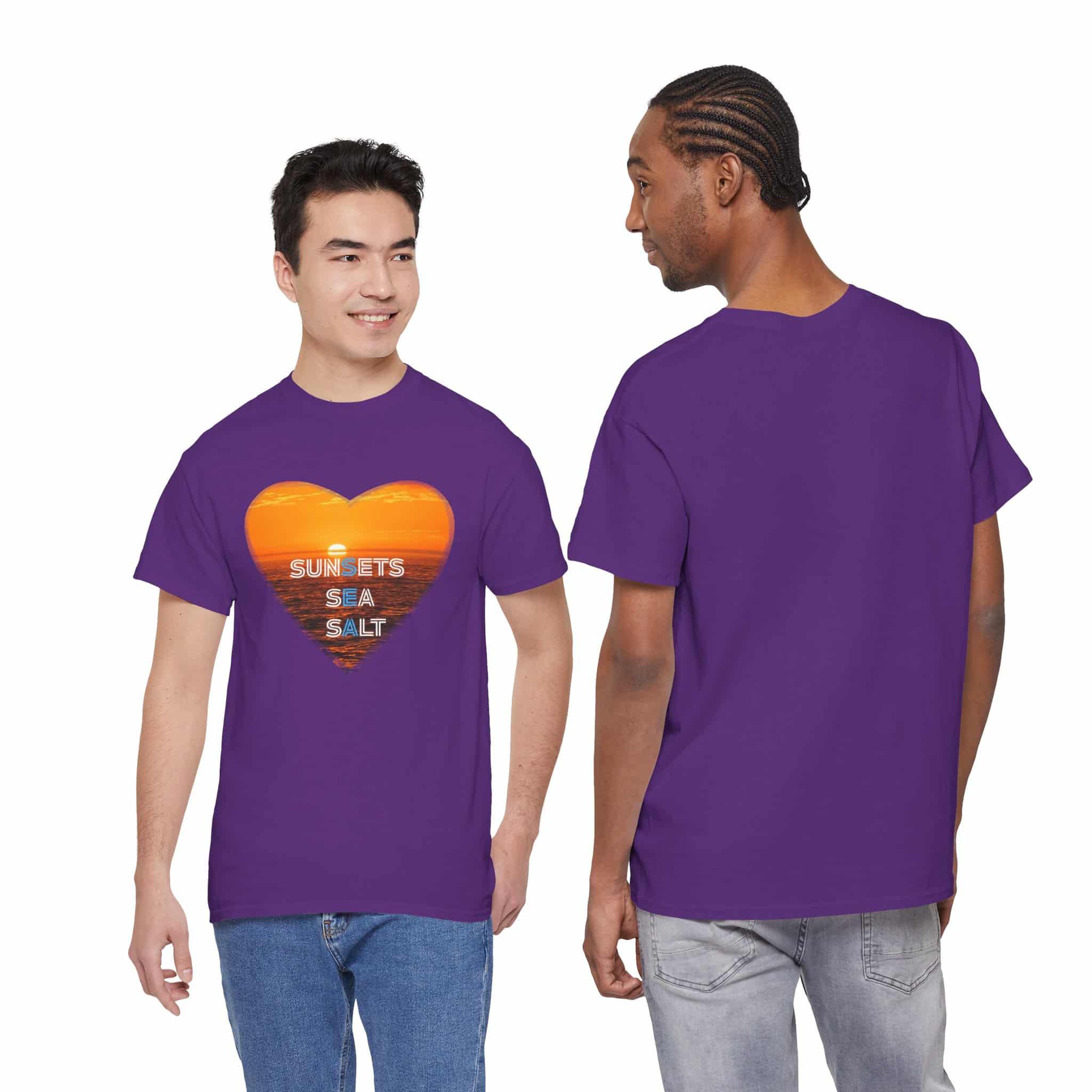 A romantic and serene Tee featuring a sunset over the ocean photo in the shape of a heart with the words Sunsets, Sea, Salt. Perfect for those who love nature and peaceful vibes. Ideal for beach lovers and sunset enthusiasts. Great for Valentine’s Day, beach vacations, or casual everyday wear.