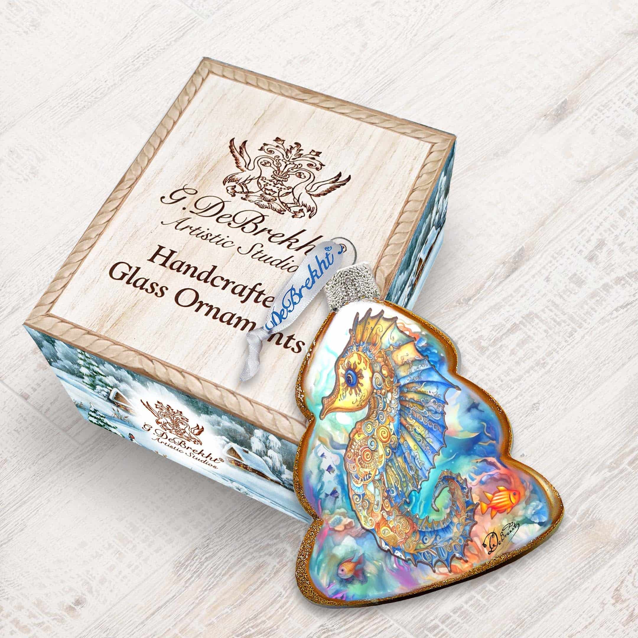 Enhance your coastal holiday Decor with these beautifully crafted Seahorse Keepsake Glass Ornaments by G. Debrekht. Made with exquisite details and quality materials; these ornaments are perfect for adding a touch of seaside charm to your home. Bring a piece of the ocean into your holiday celebrations.