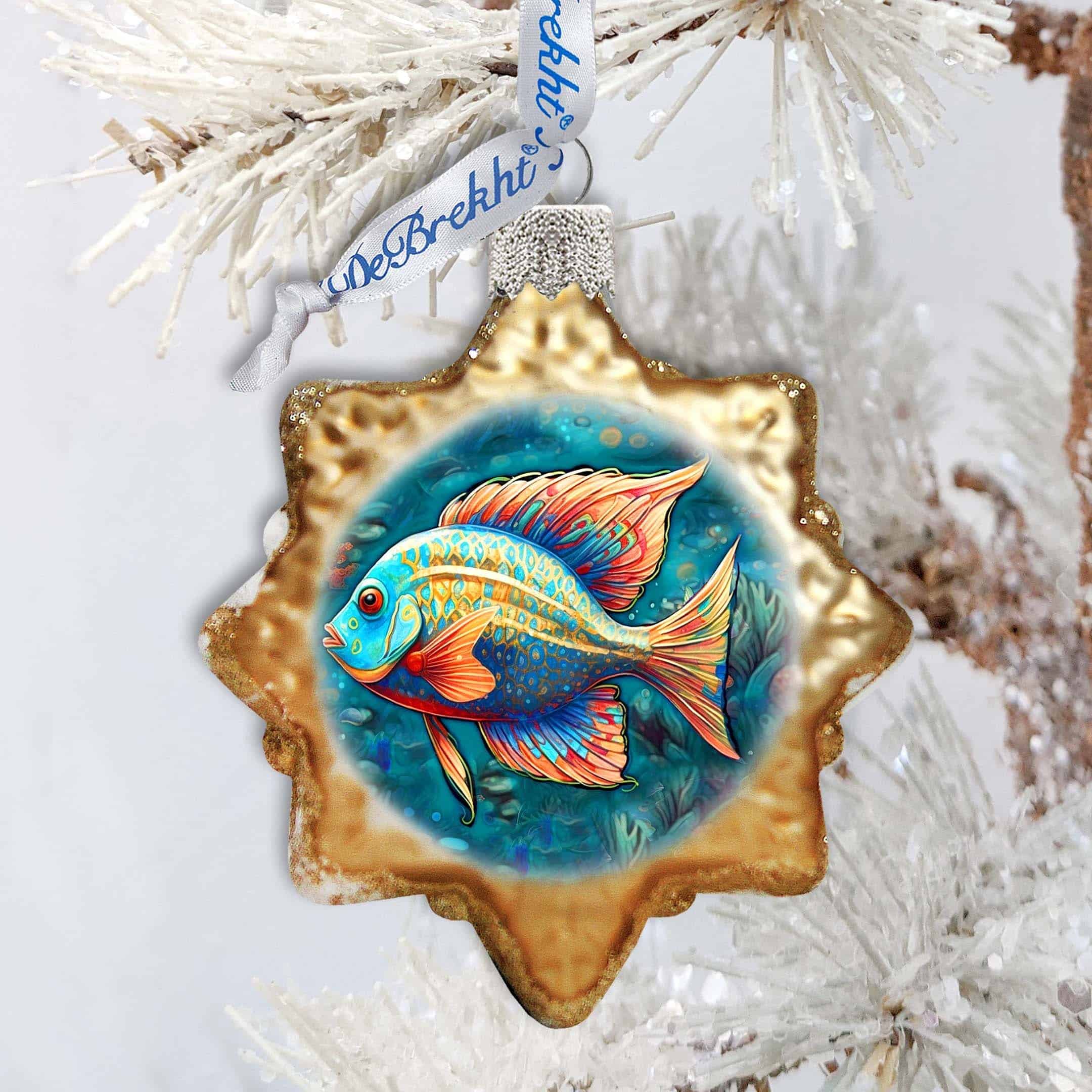 Enhance your coastal holiday Decor with our beautifully crafted Ocean Fish Keepsake Glass Ornaments by G. Debrekht. Handcrafted with intricate details, these ornaments add a touch of elegance and charm to your Christmas tree. Made from high-quality glass, these ornaments are durable and long-lasting.