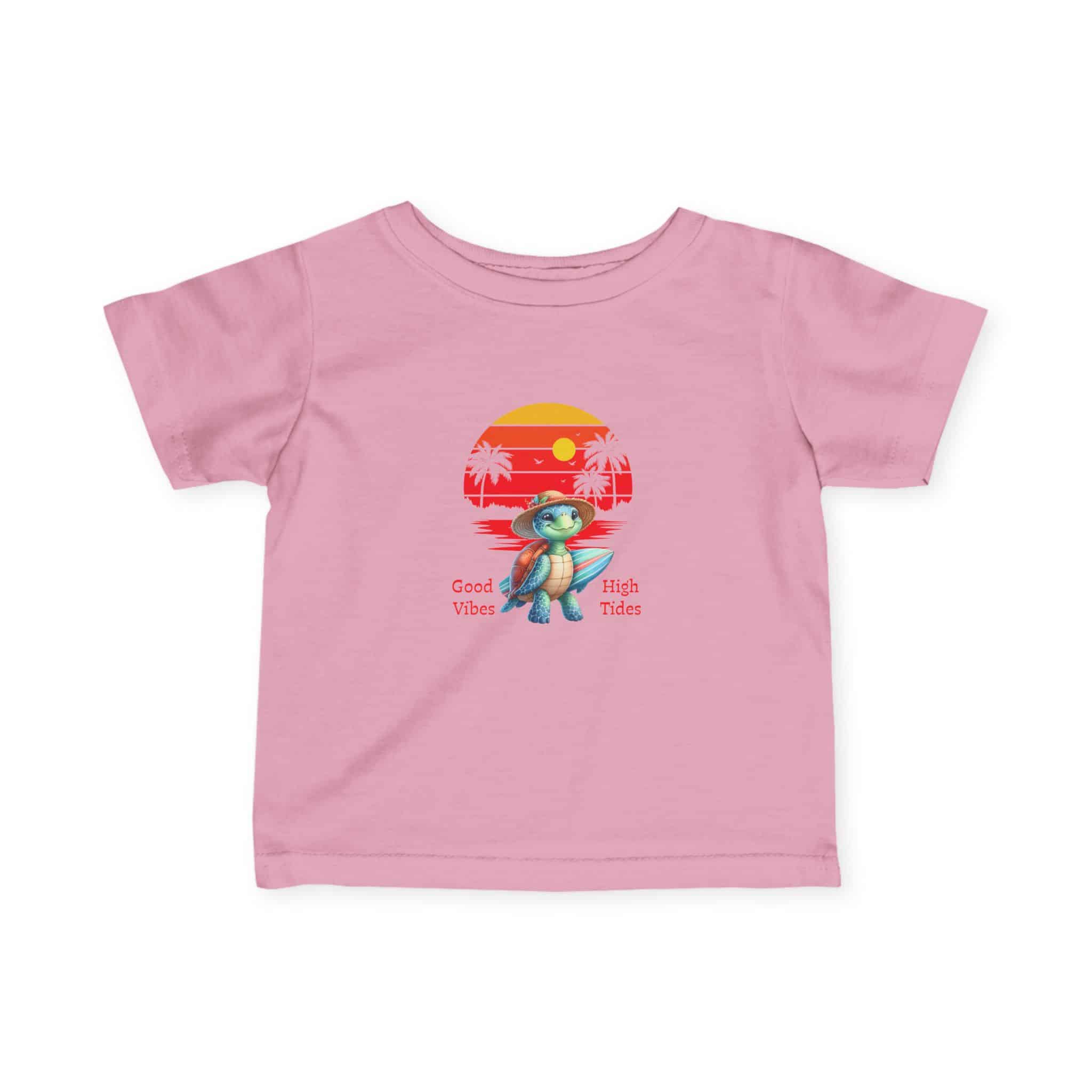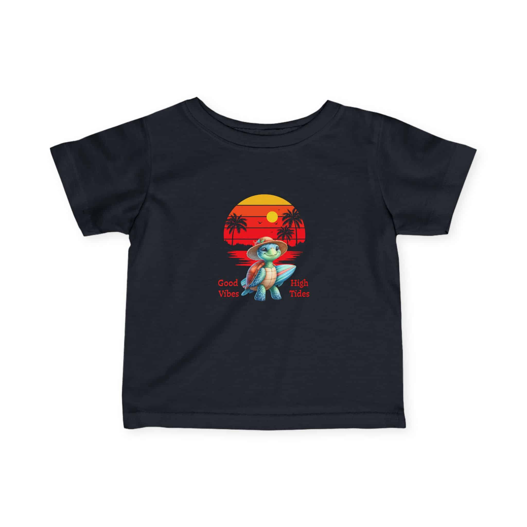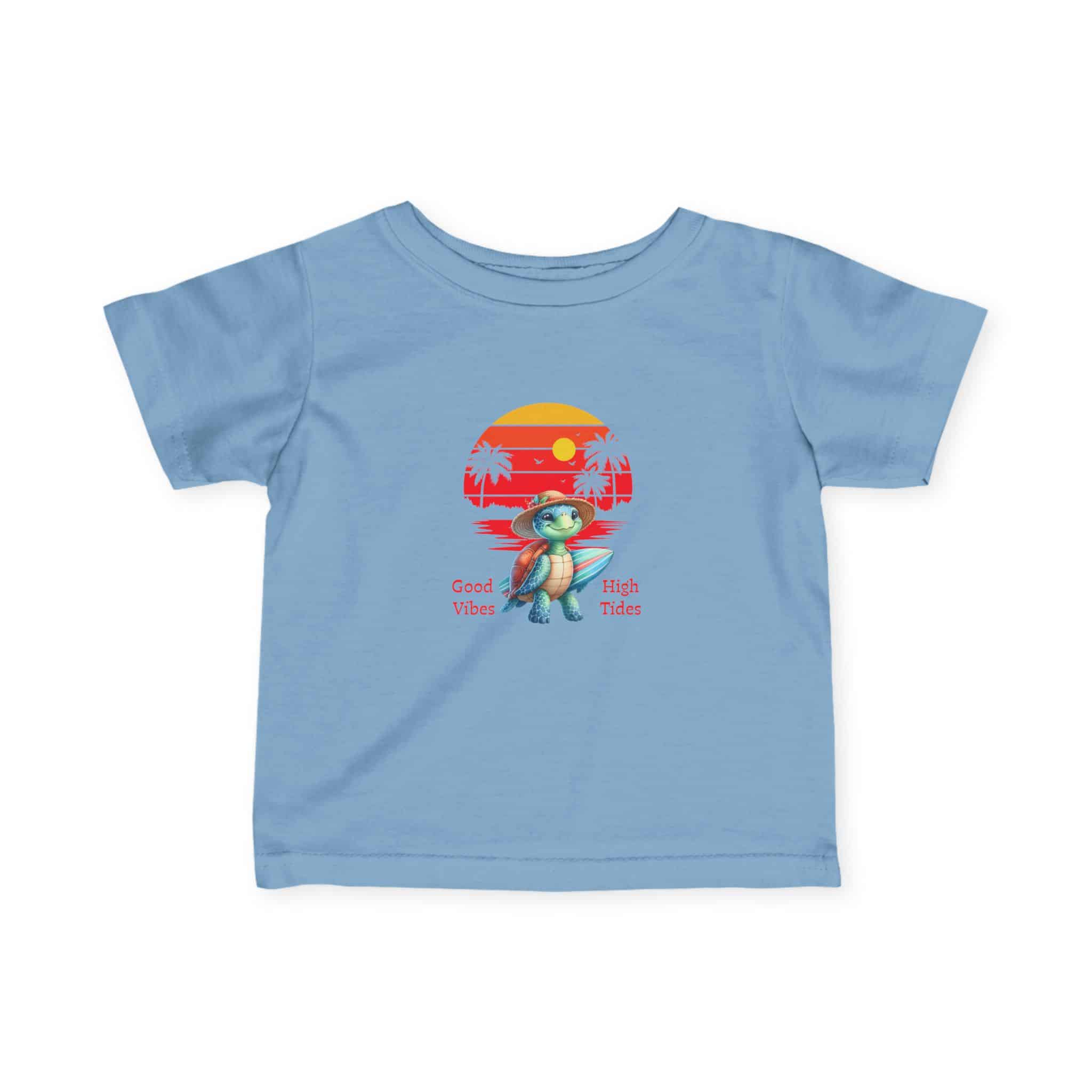 Soft, lightweight tee designed for little ones who love bright, playful days. The shirt features a small, retro-sunset graphic with a cheerful turtle and palm silhouettes, giving it a sunny, coastal vibe that pairs naturally with playtime and family outings. The classic fit and smooth, strong fabric keep the tee looking neat after repeated washes, while the elastic ribbed collar and shoulder tape help it hold shape through tumbles and adventures. Breathable and gentle on delicate skin, this tee settles into everyday wear — from park mornings to lazy beach afternoons — and carries a relaxed, happy energy that families will reach for again and again.