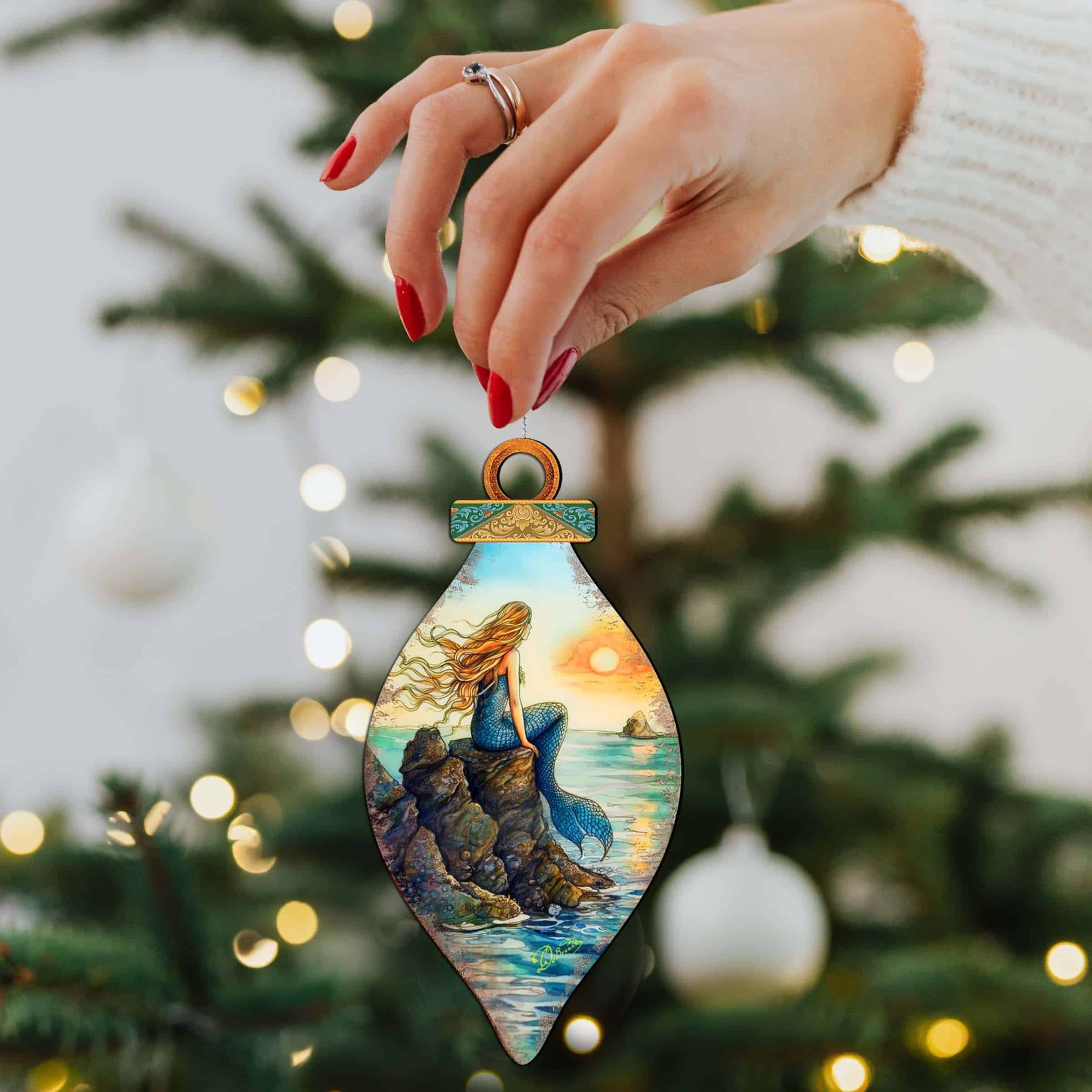 Enhance your coastal holiday decor with G. DeBrekht’s Mermaid Coastal Wooden Ornaments. Crafted with precision, these ornaments feature a beautiful mermaid sitting on a rock, adding a touch of marine magic to your holiday display. Bring the serene beauty of the ocean into your home this holiday season.