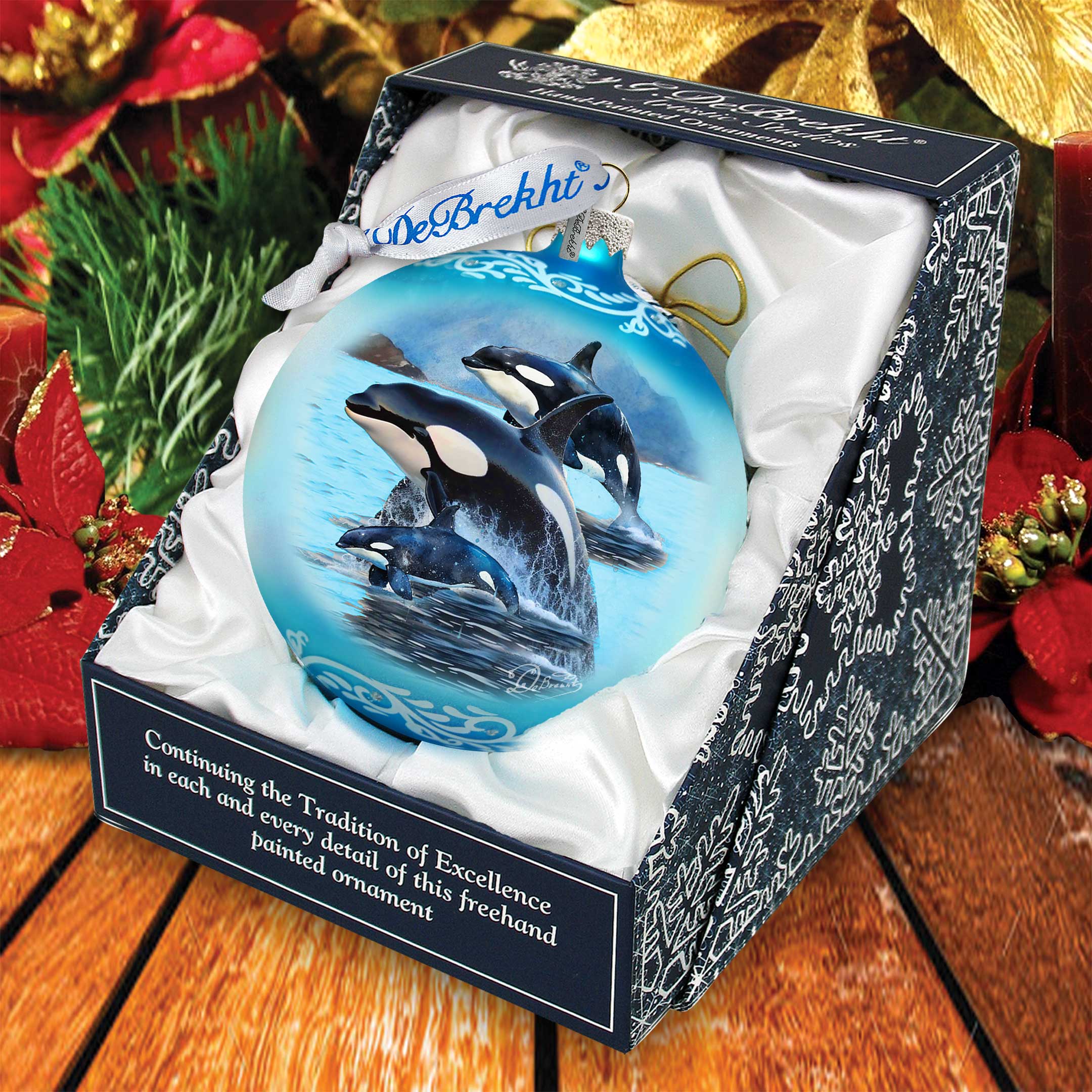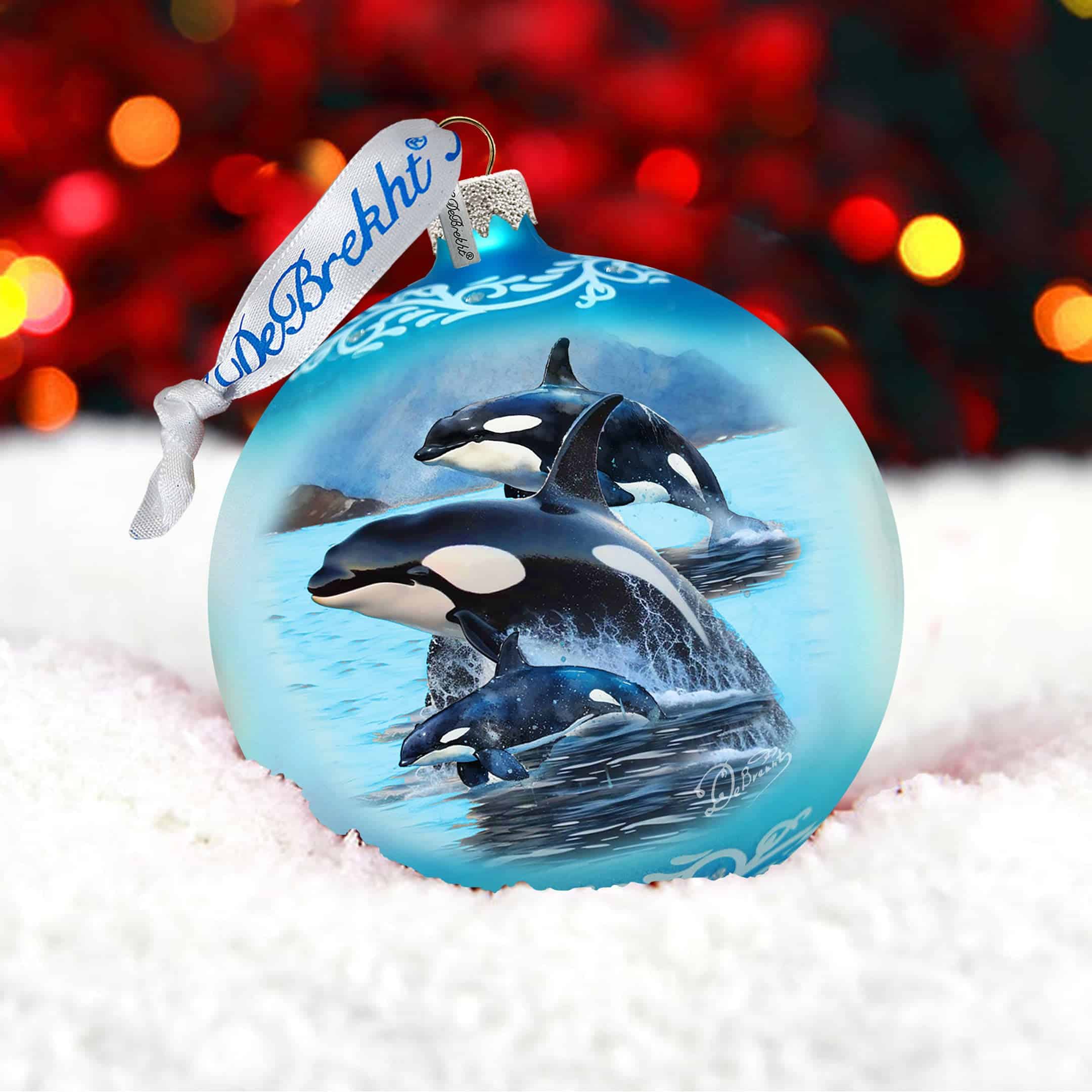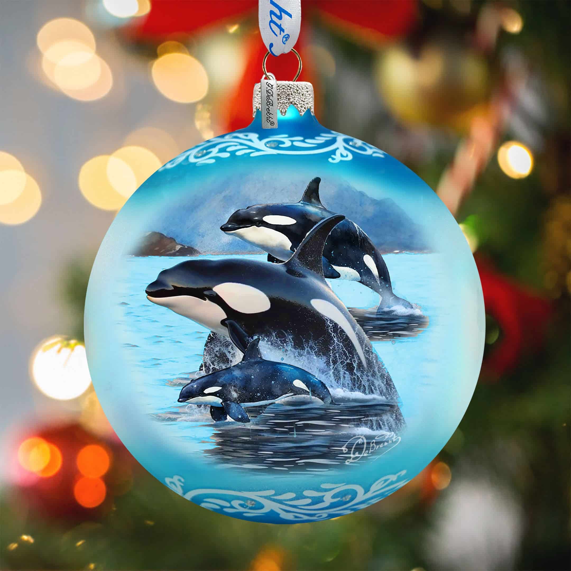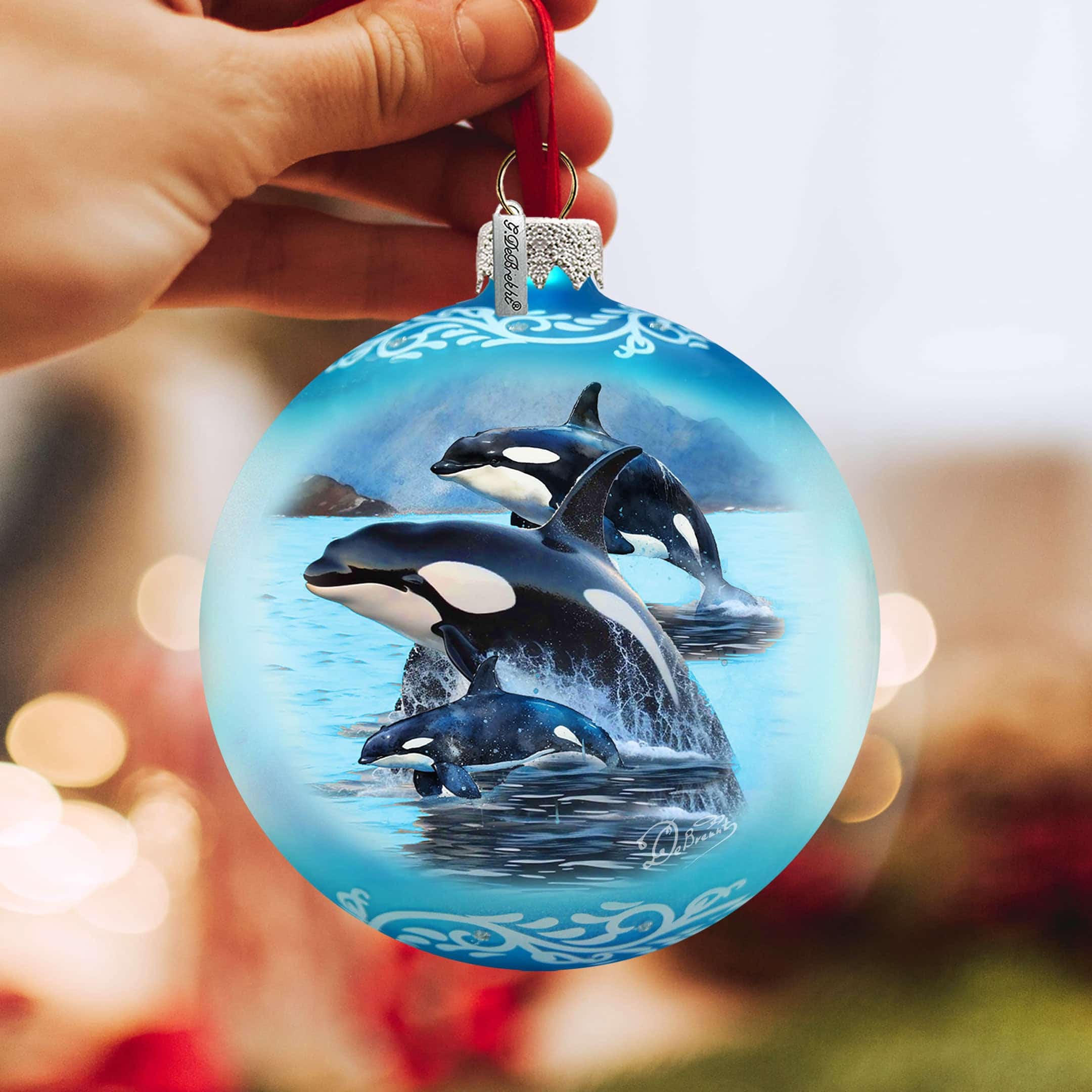 This stunning Orca Family Glass Ornament by G. DeBrekht captures the beauty, power, and grace of killer whales in their natural ocean habitat. Featuring a dynamic family of orcas leaping through crystal-blue waters, this hand-painted design celebrates the spirit of marine wildlife and coastal adventure.