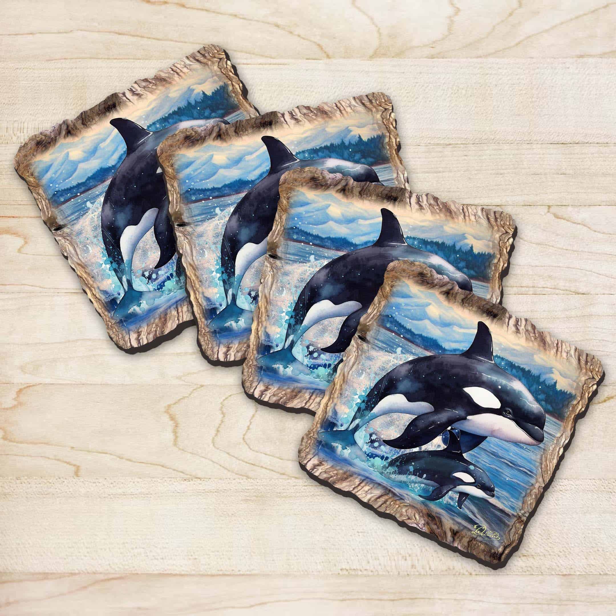 Orca Wooden Cork Coasters Gift Set of 4 by Nature Wonders Coastal Nature Wildlife Decor – 95396C-S4