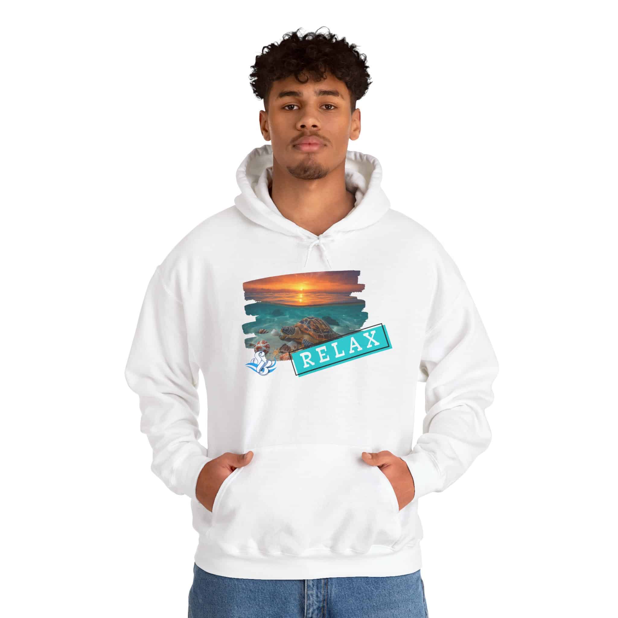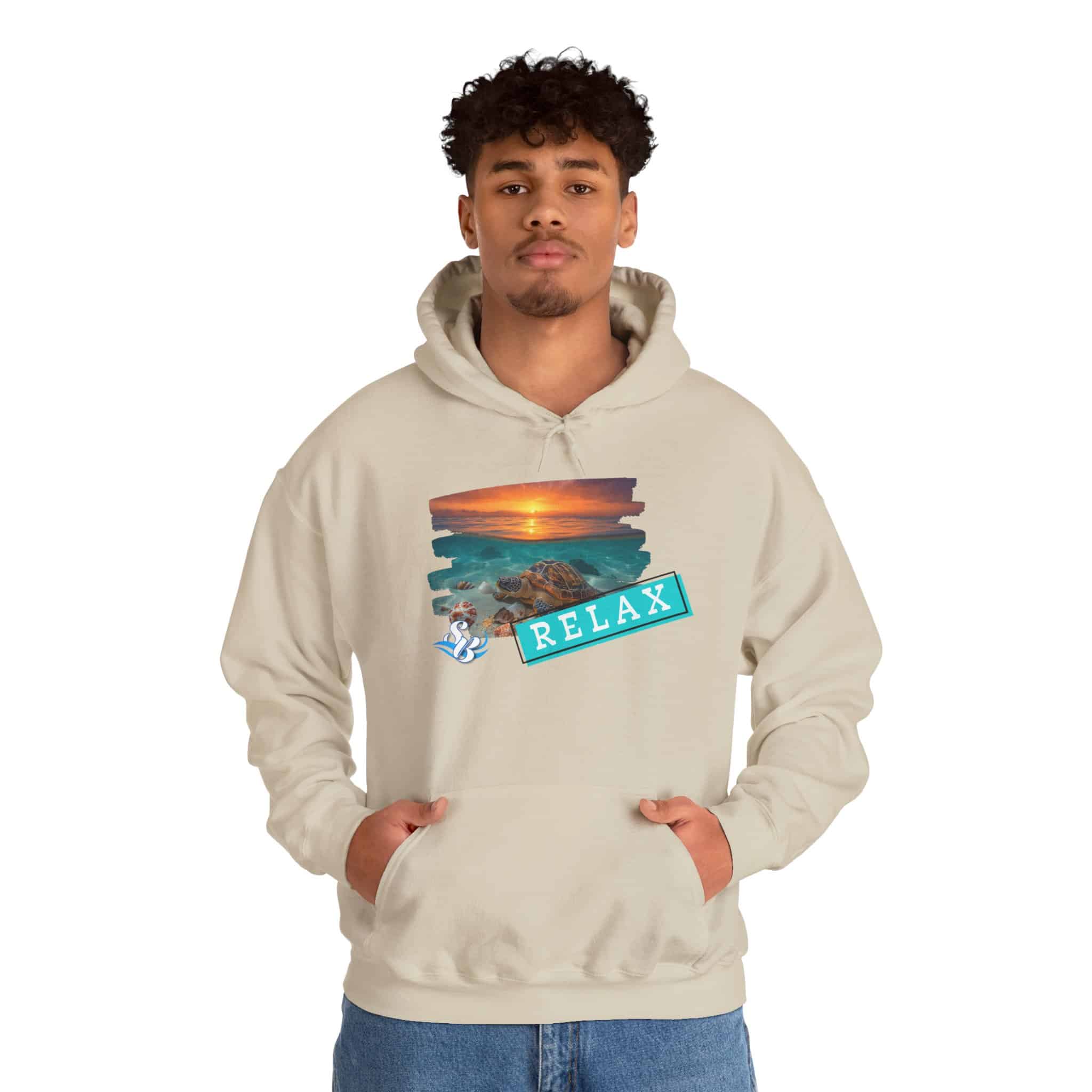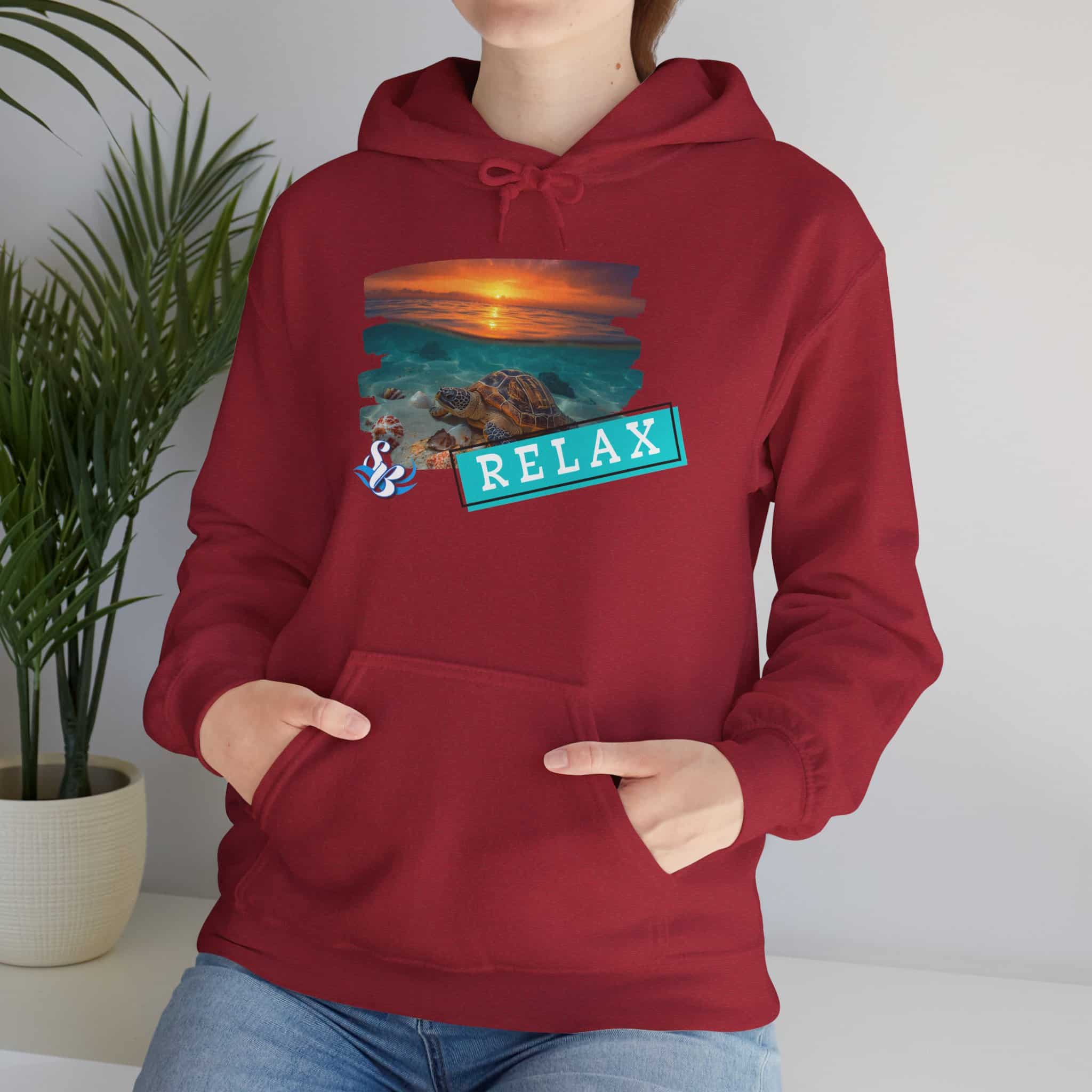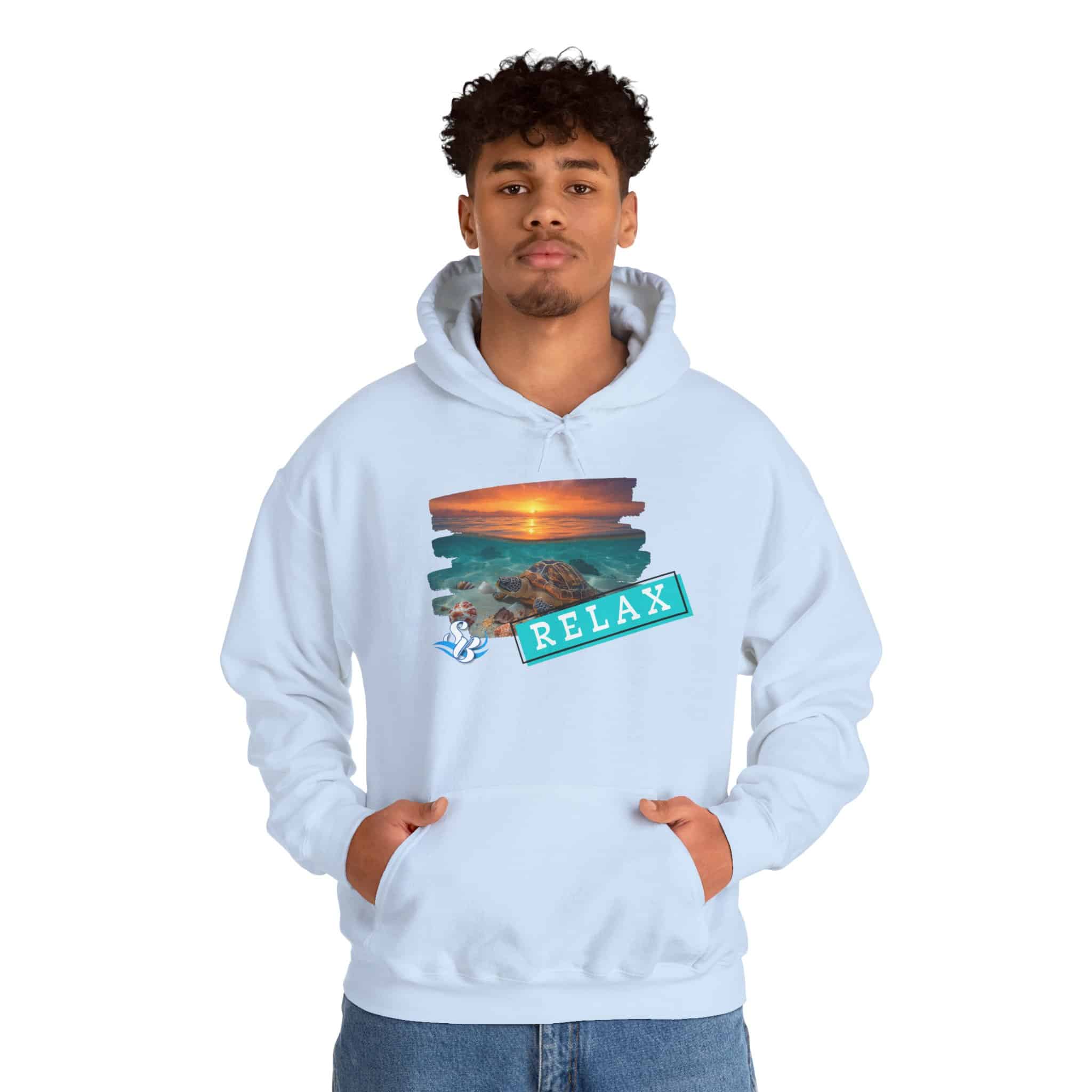 This cozy hooded sweatshirt brings a soft, beachside calm to chilly days. A layered sunset-and-rocks print sits over the heart, with a teal “RELAX” banner that reads like a small, steady reminder to breathe. The medium-heavy cotton/poly blend wraps you in warmth without feeling bulky. A roomy kangaroo pocket and double-lined hood add comfort and everyday utility, while color-matched drawcord and clean tubular knit give a smooth, wearable look. Wear it on slow mornings, post-surf evenings, or while winding down by a window with a warm drink—the design feels like a brief escape every time you pull the hood up.