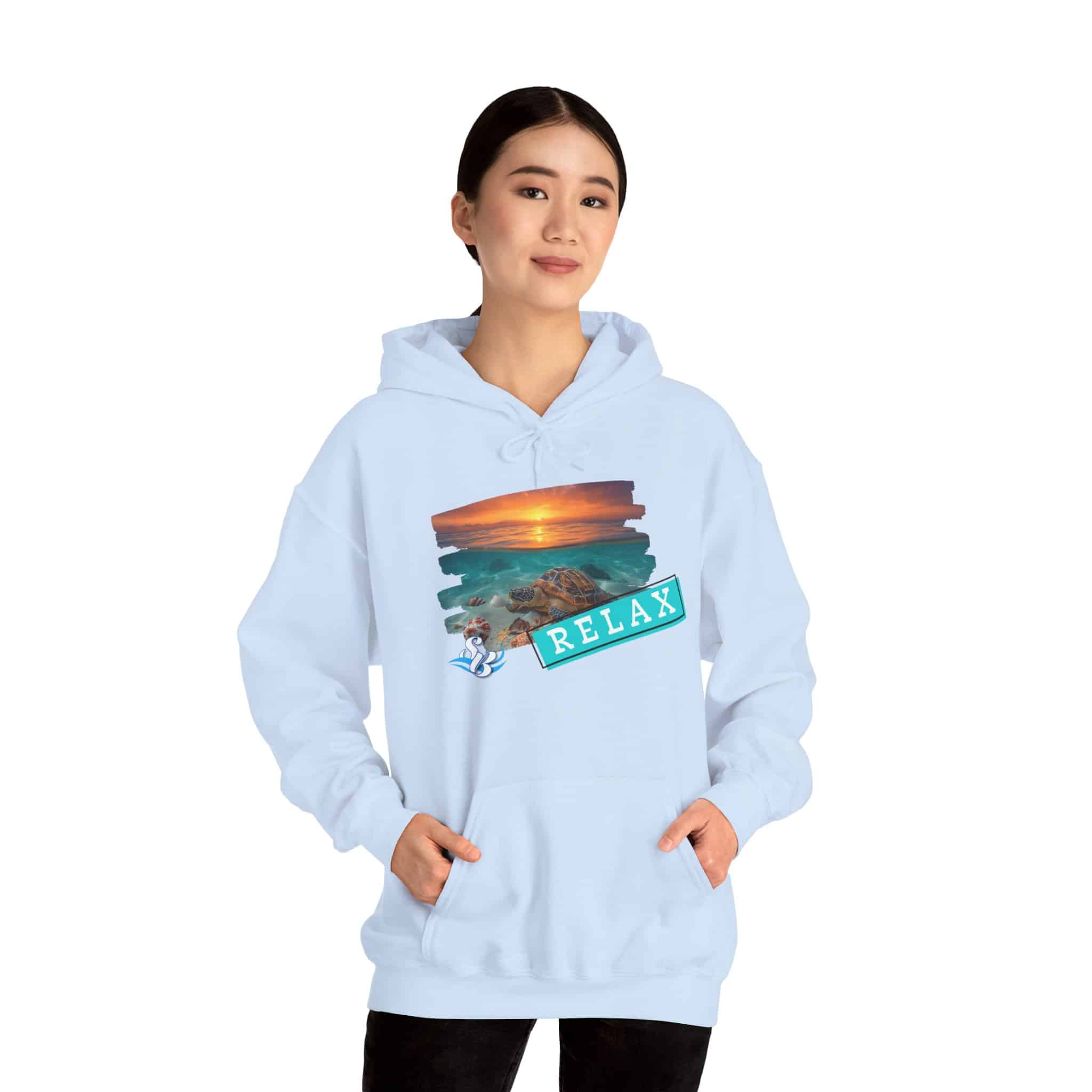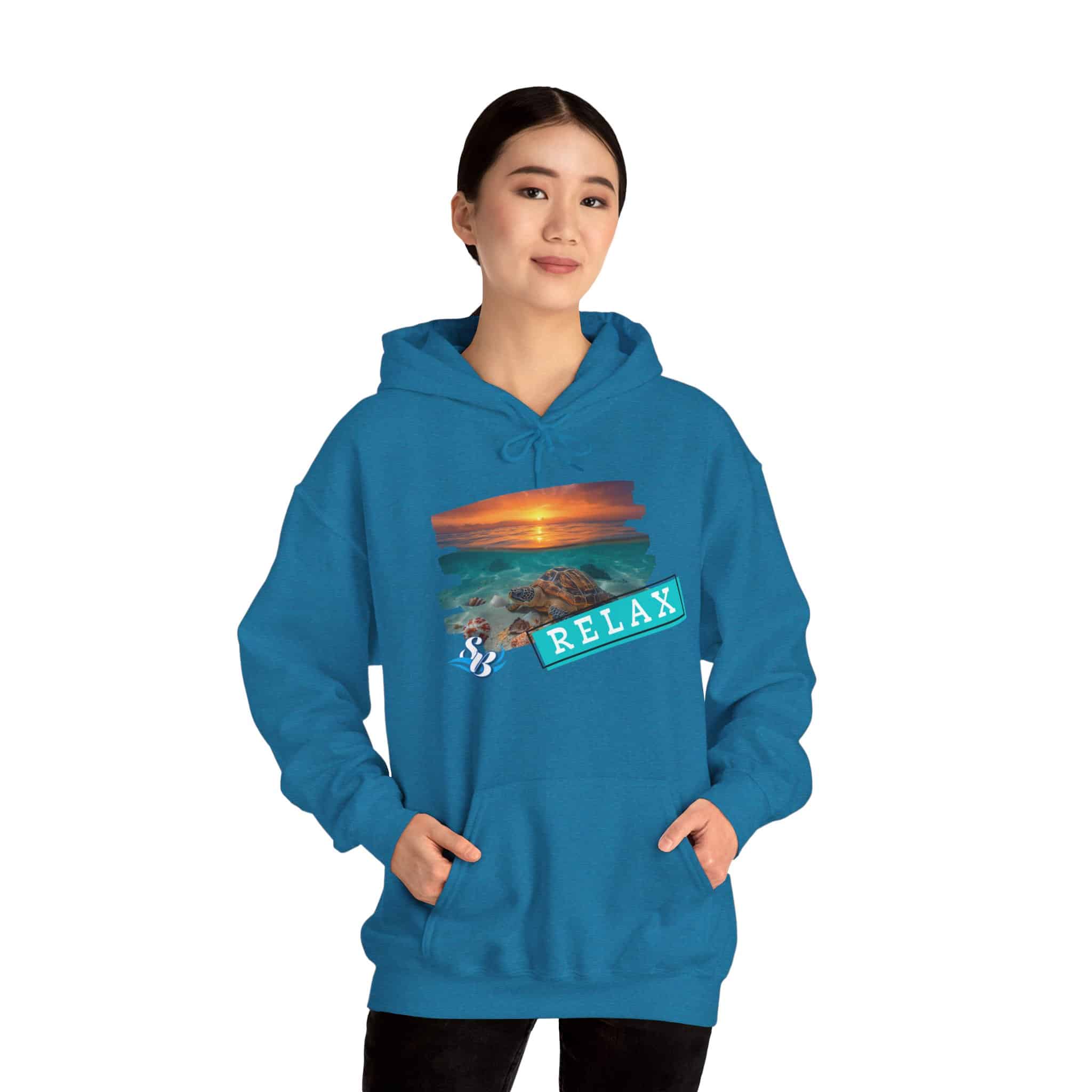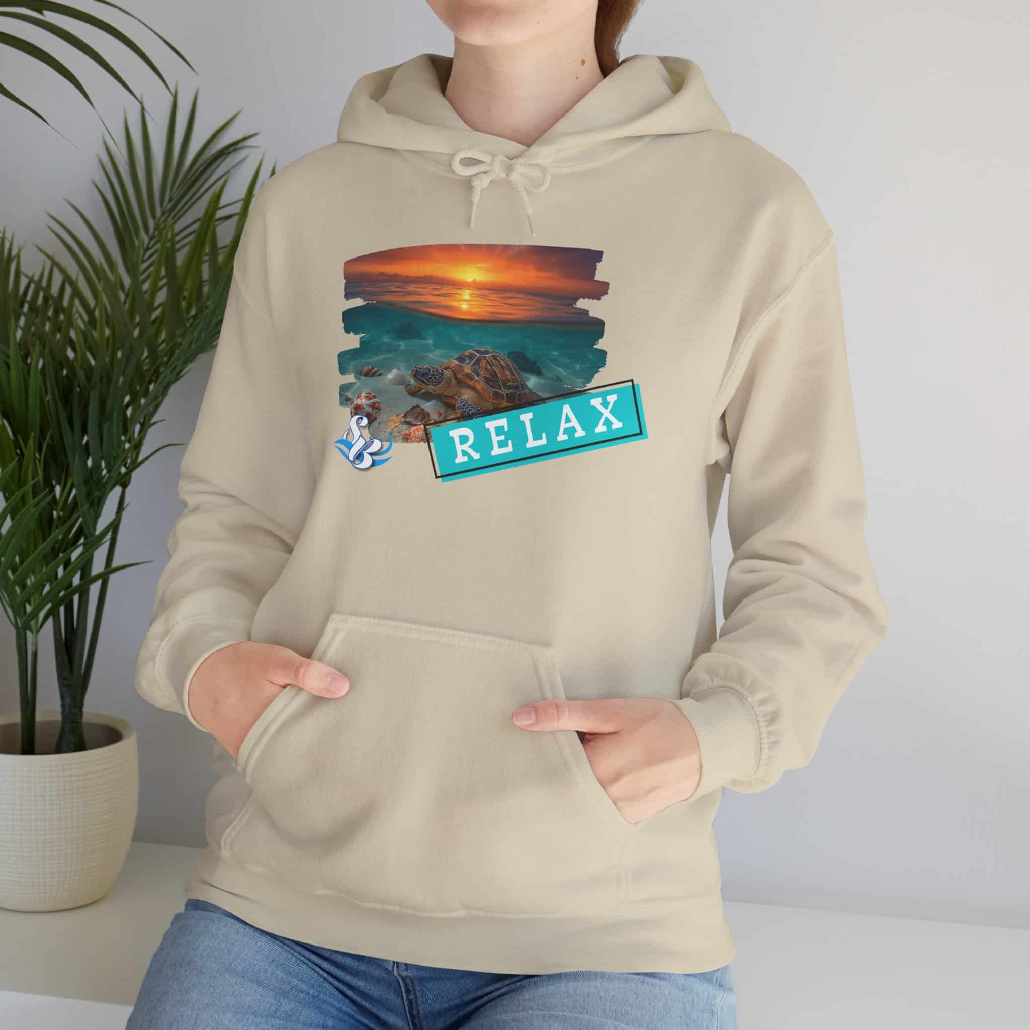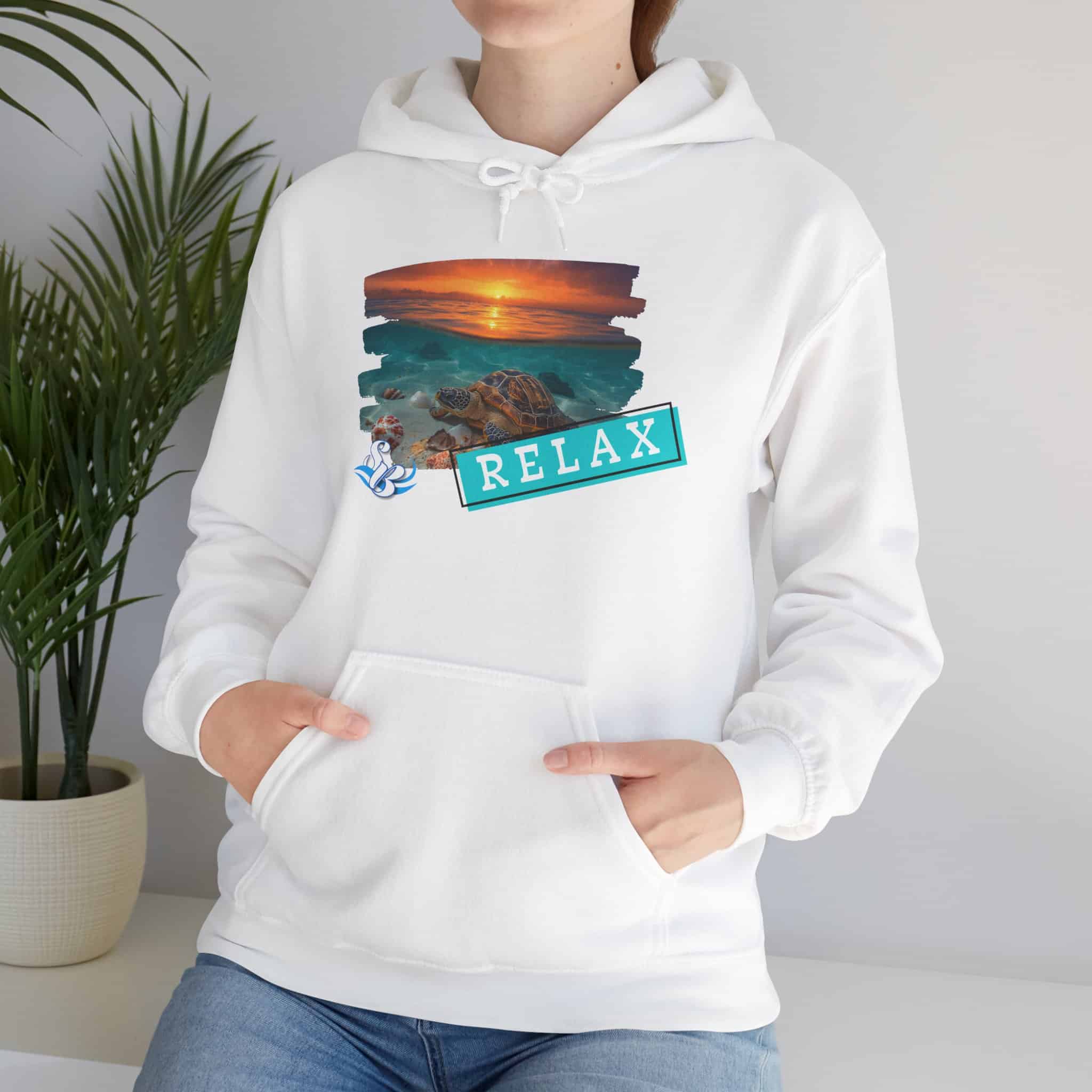 This cozy hooded sweatshirt brings a soft, beachside calm to chilly days. A layered sunset-and-rocks print sits over the heart, with a teal “RELAX” banner that reads like a small, steady reminder to breathe. The medium-heavy cotton/poly blend wraps you in warmth without feeling bulky. A roomy kangaroo pocket and double-lined hood add comfort and everyday utility, while color-matched drawcord and clean tubular knit give a smooth, wearable look. Wear it on slow mornings, post-surf evenings, or while winding down by a window with a warm drink—the design feels like a brief escape every time you pull the hood up.