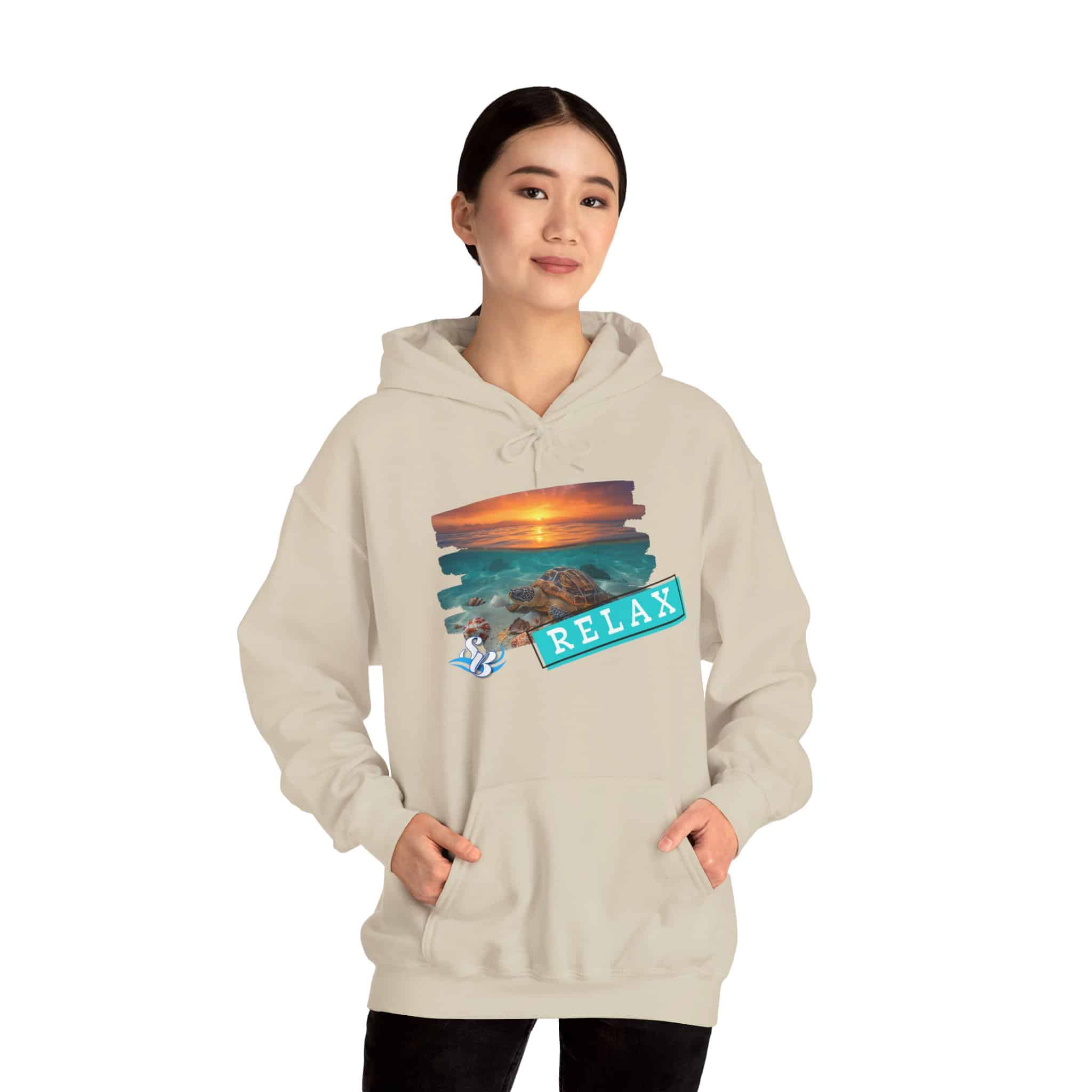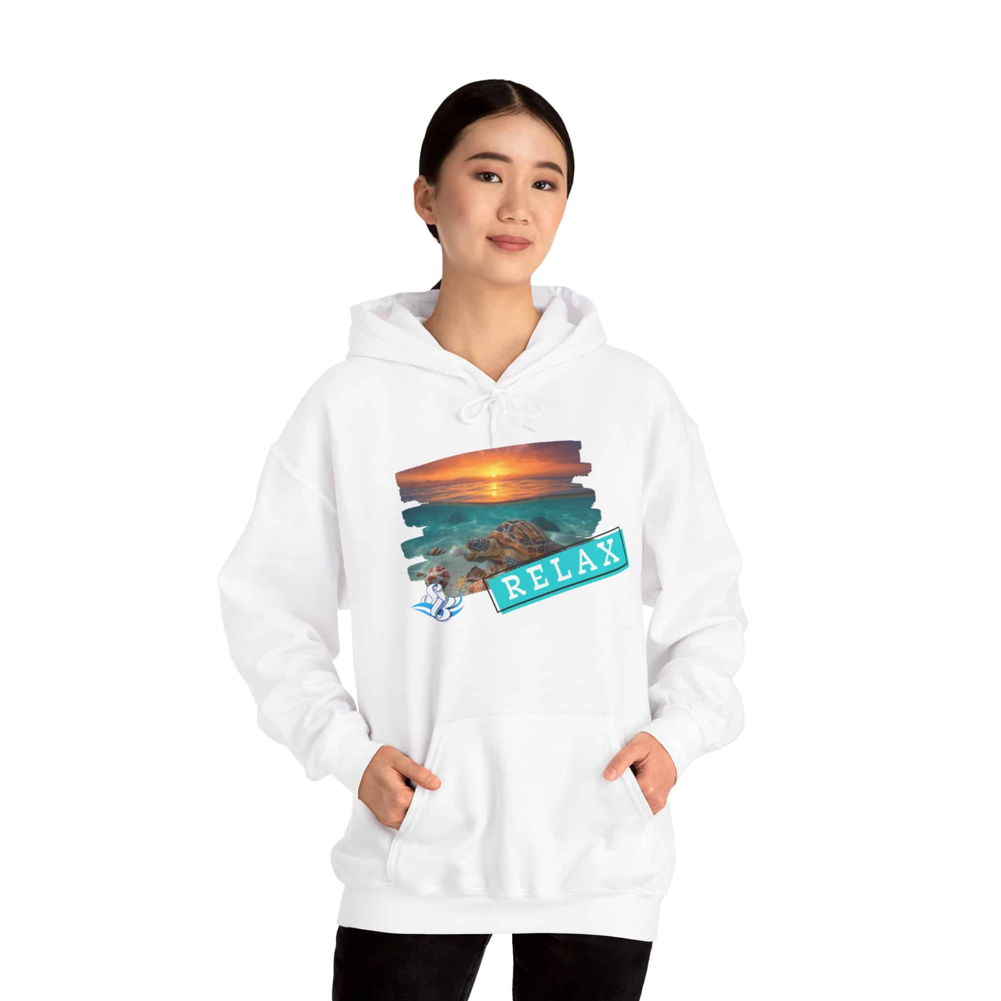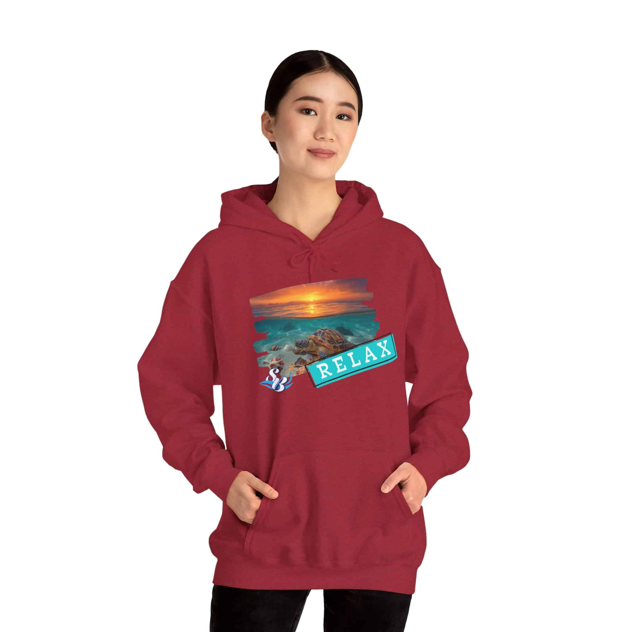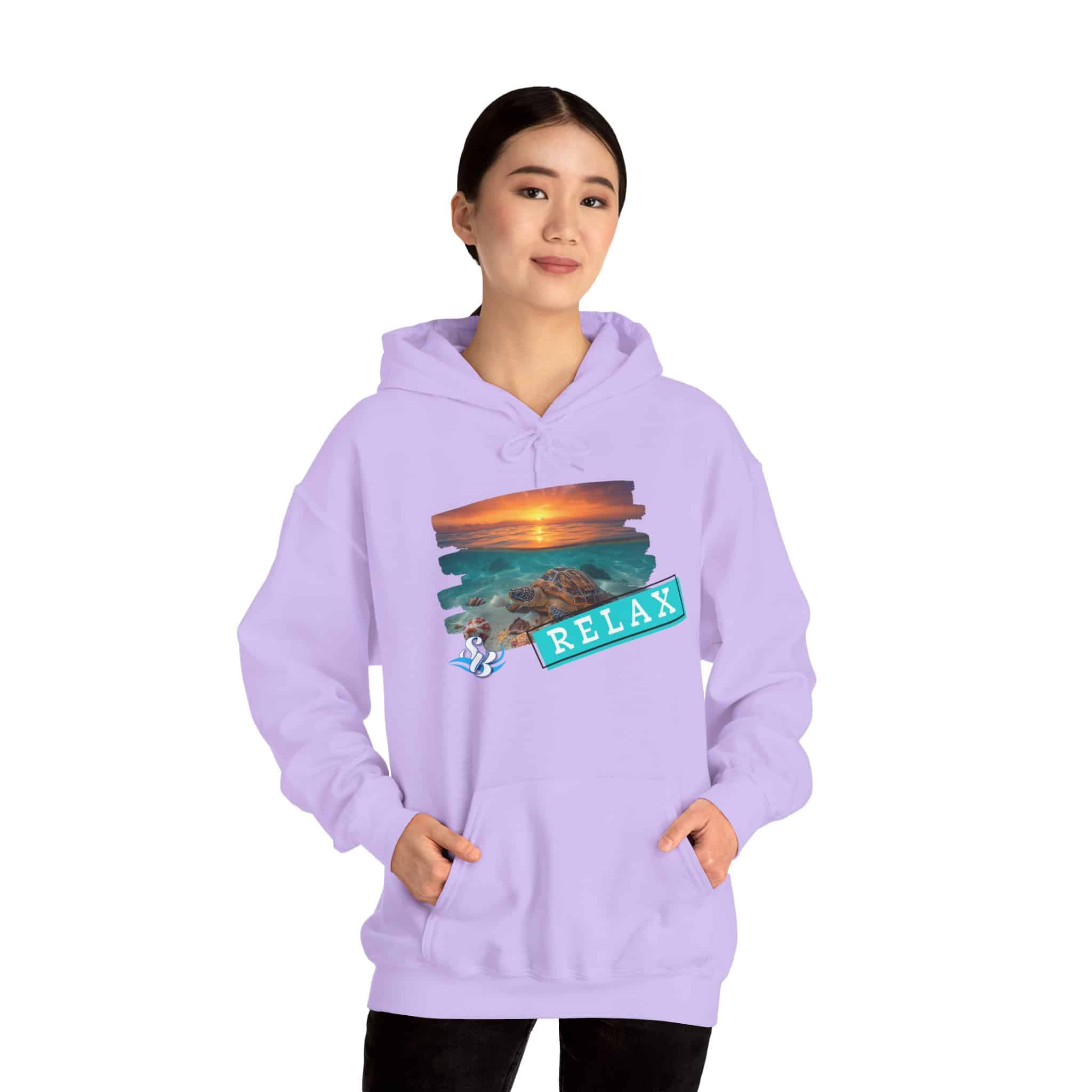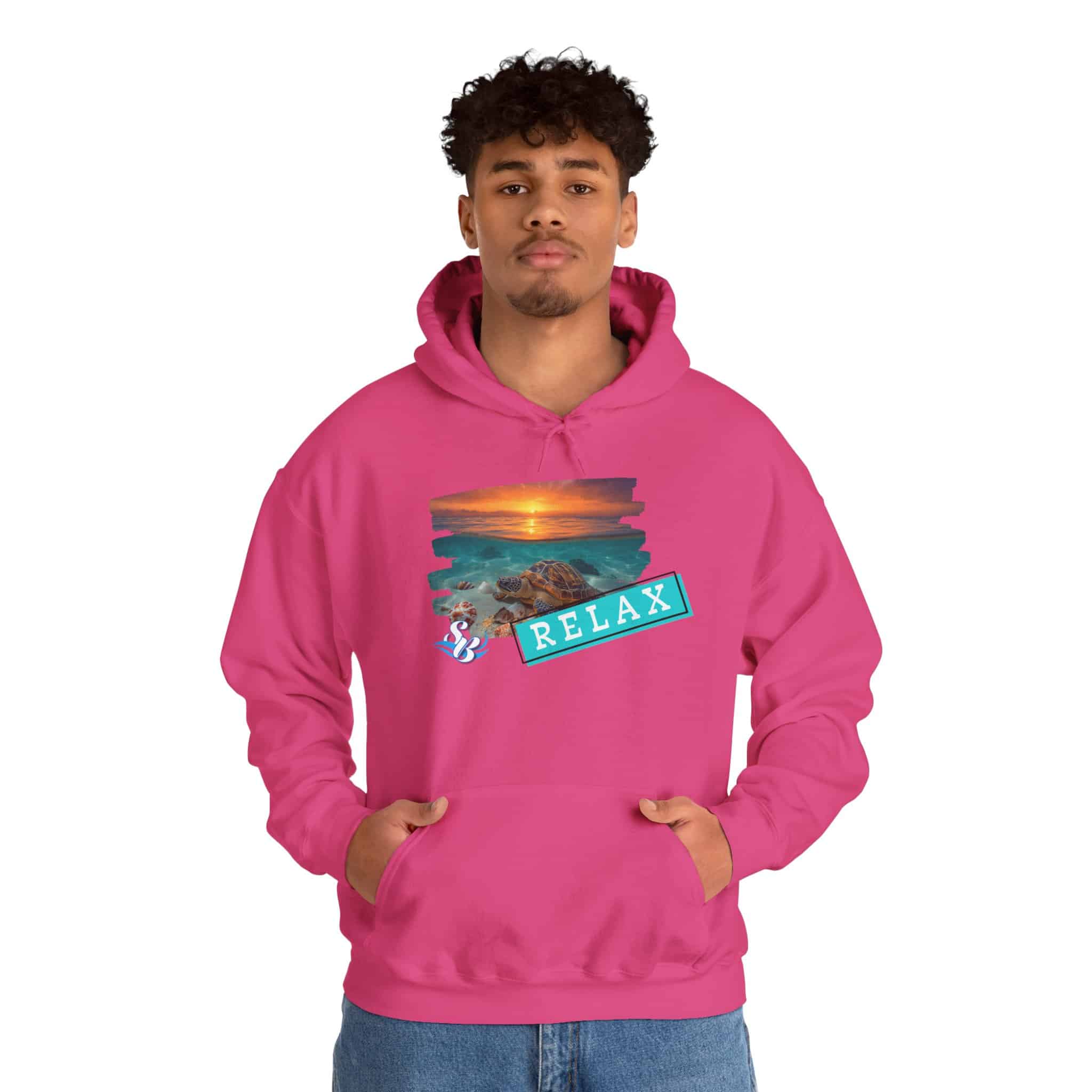 This cozy hooded sweatshirt brings a soft, beachside calm to chilly days. A layered sunset-and-rocks print sits over the heart, with a teal “RELAX” banner that reads like a small, steady reminder to breathe. The medium-heavy cotton/poly blend wraps you in warmth without feeling bulky. A roomy kangaroo pocket and double-lined hood add comfort and everyday utility, while color-matched drawcord and clean tubular knit give a smooth, wearable look. Wear it on slow mornings, post-surf evenings, or while winding down by a window with a warm drink—the design feels like a brief escape every time you pull the hood up.