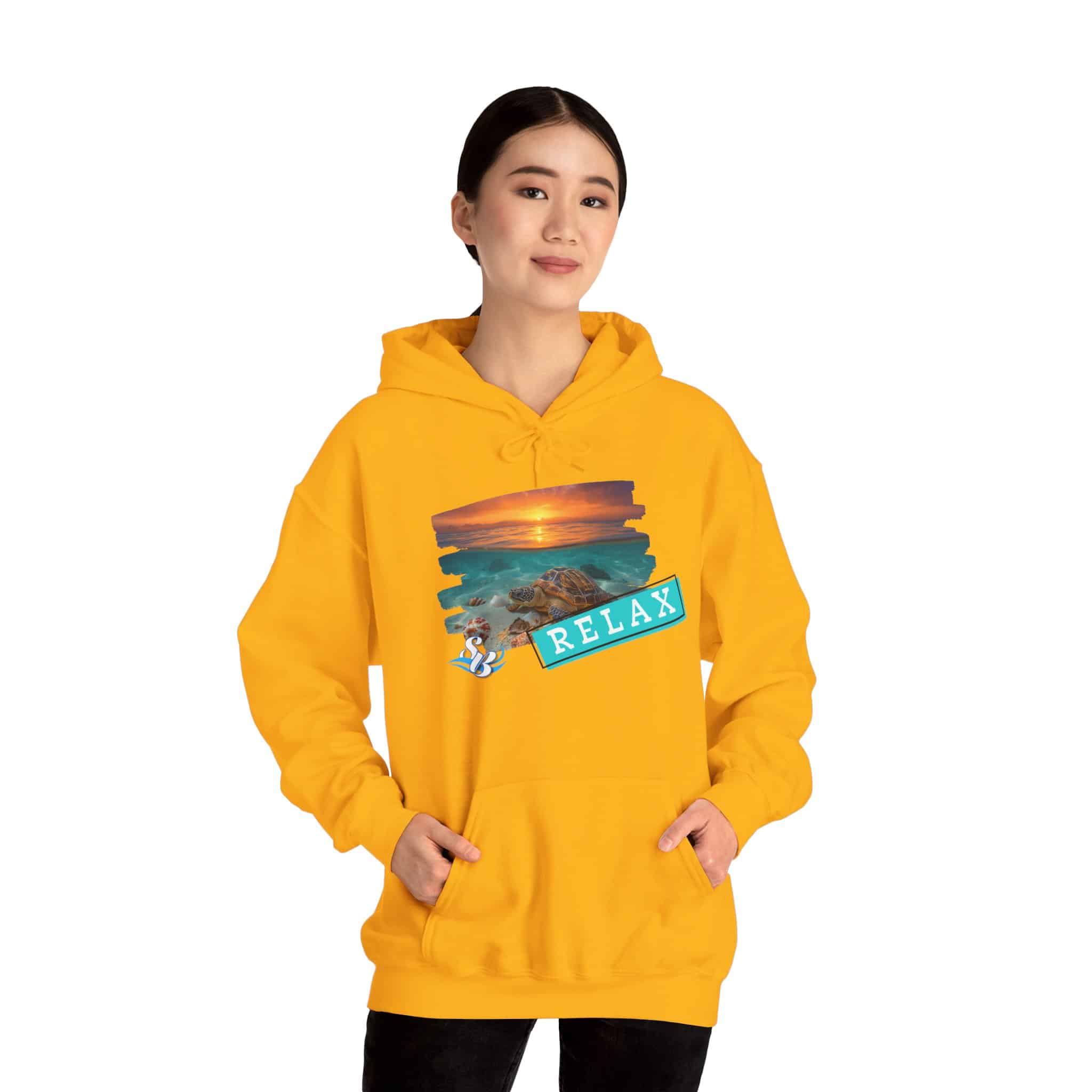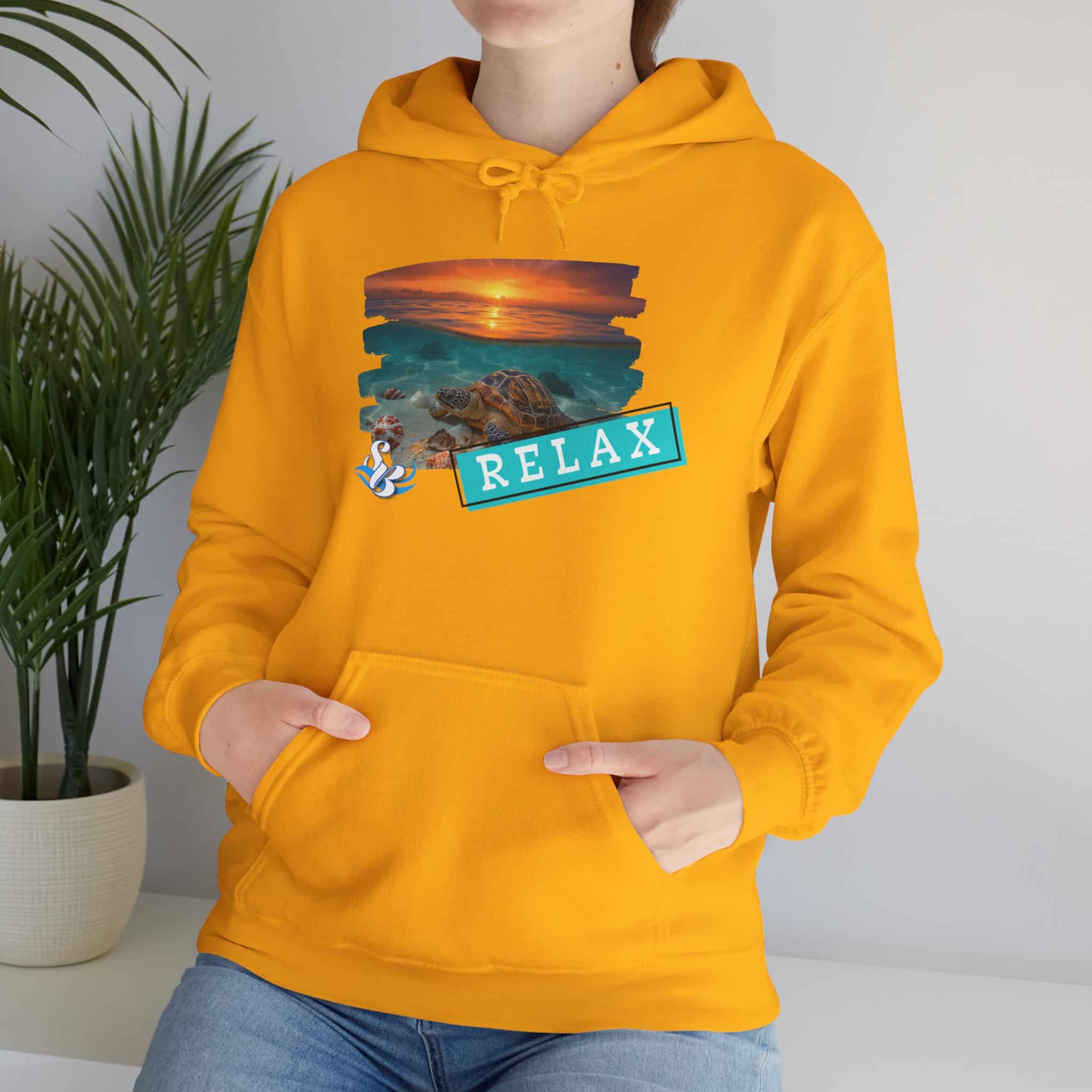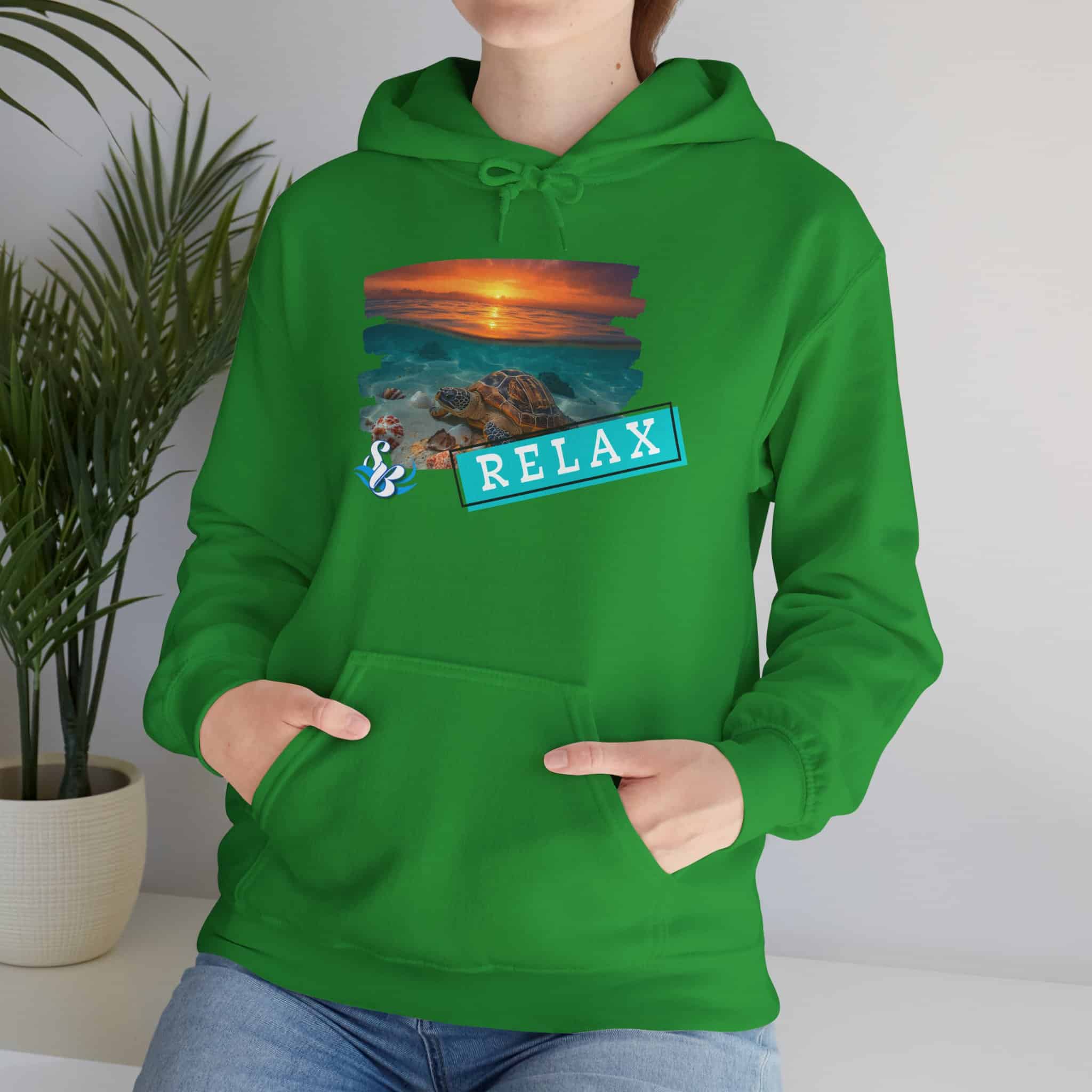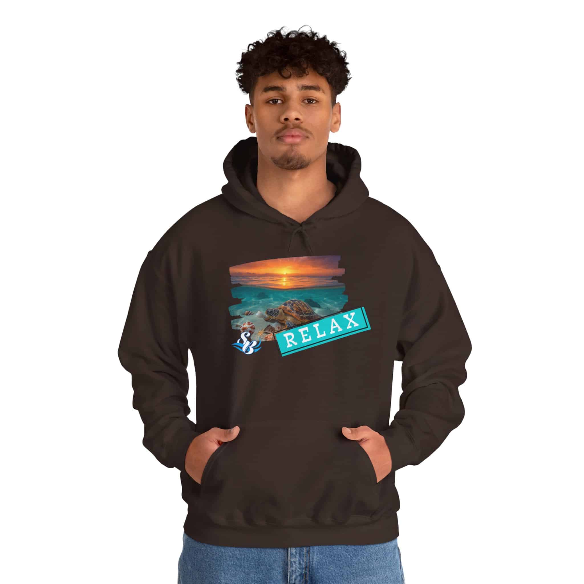 This cozy hooded sweatshirt brings a soft, beachside calm to chilly days. A layered sunset-and-rocks print sits over the heart, with a teal “RELAX” banner that reads like a small, steady reminder to breathe. The medium-heavy cotton/poly blend wraps you in warmth without feeling bulky. A roomy kangaroo pocket and double-lined hood add comfort and everyday utility, while color-matched drawcord and clean tubular knit give a smooth, wearable look. Wear it on slow mornings, post-surf evenings, or while winding down by a window with a warm drink—the design feels like a brief escape every time you pull the hood up.