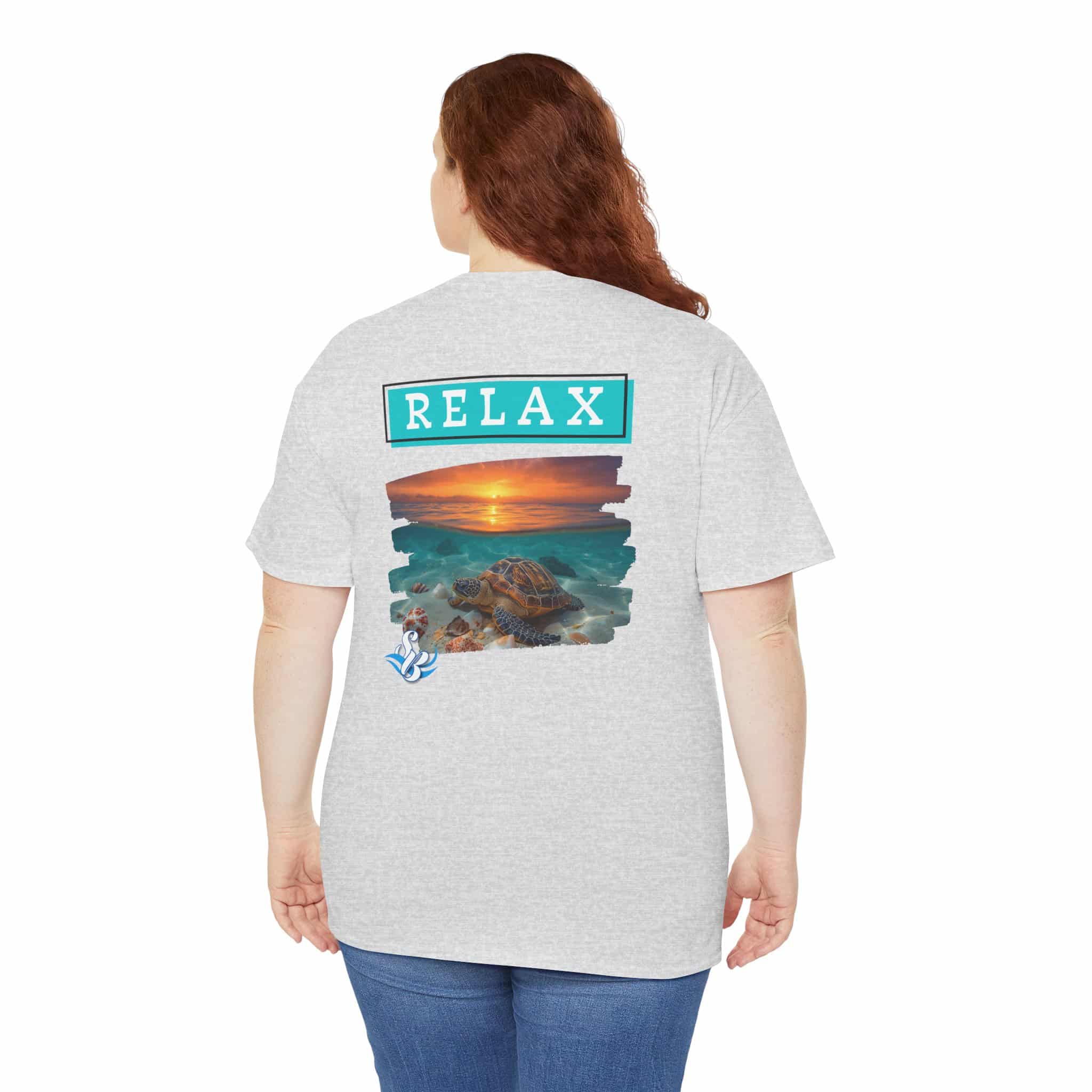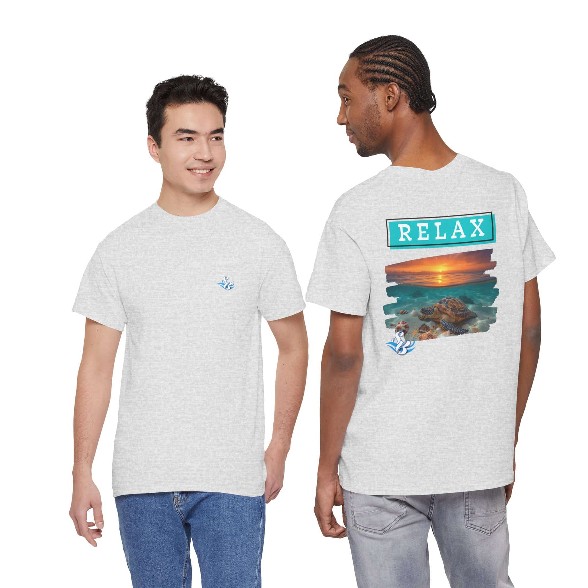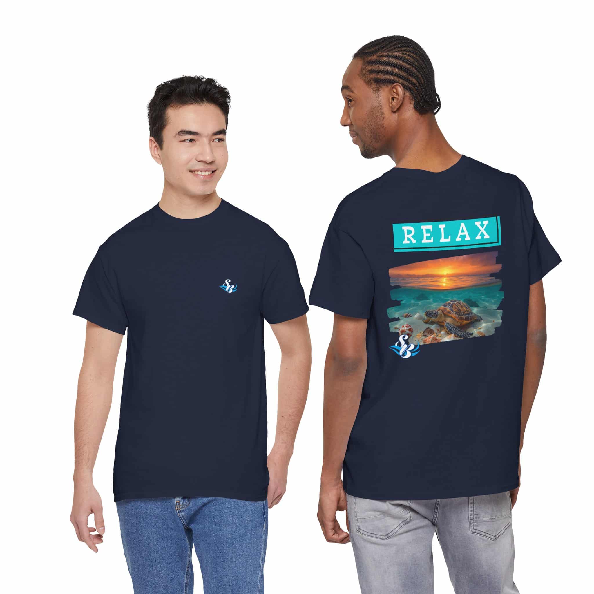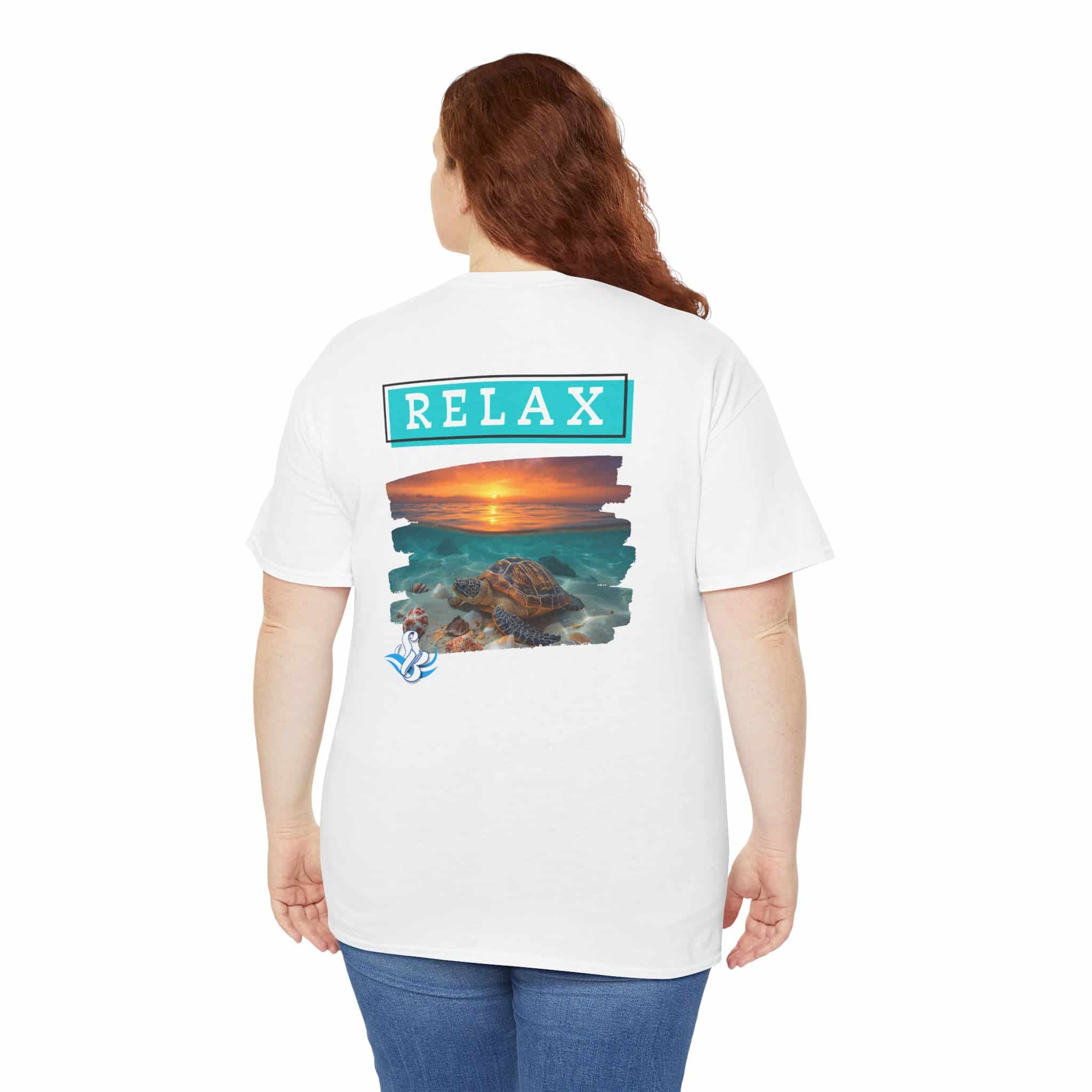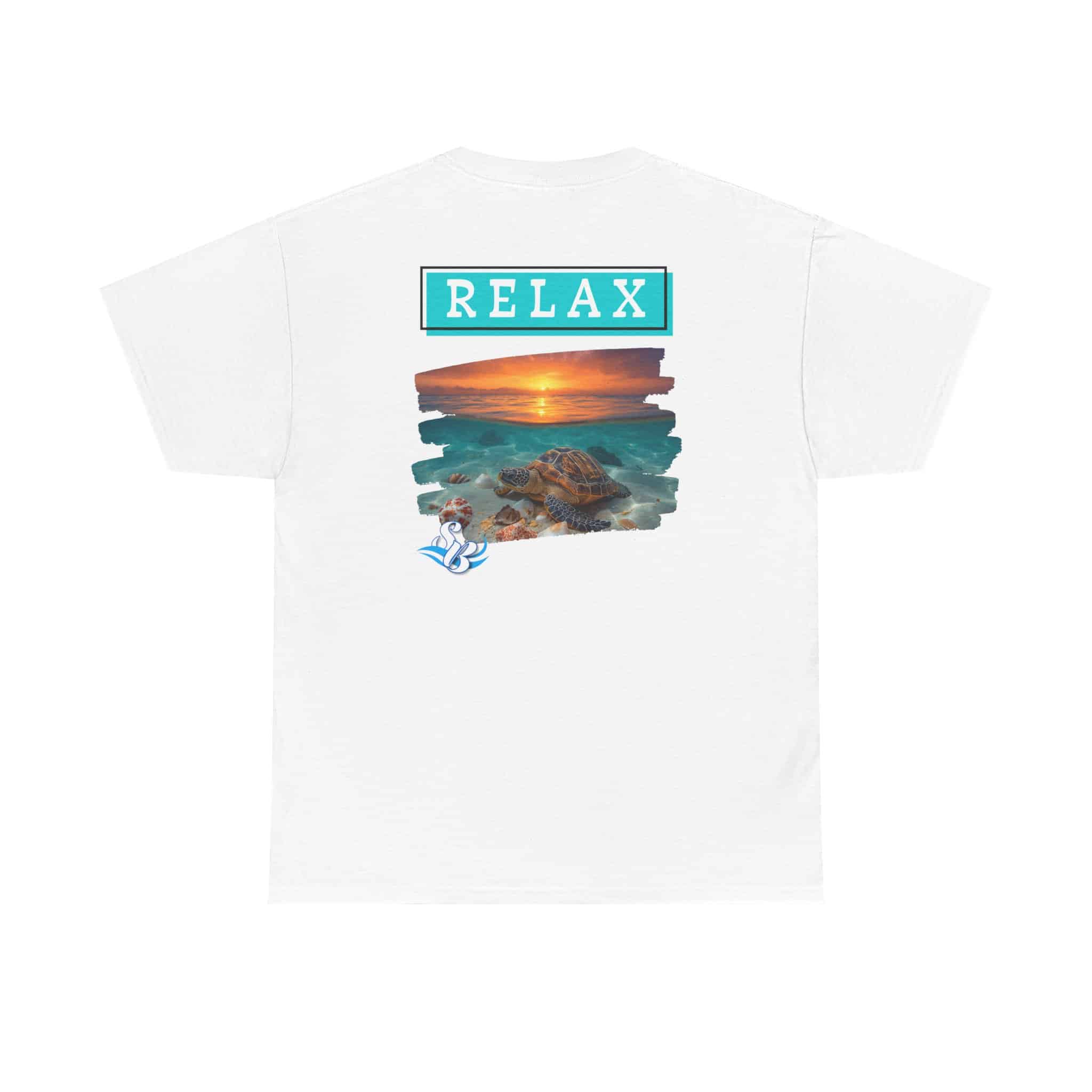 White cotton tee printed with a calming coastal scene that breathes easy energy into everyday wear. The front bears a small, subtle emblem over the heart while the back unfolds into a layered sunset-over-rocks photo with a bold ‘RELAX’ header and a tiny anchor motif — a quiet nod to shorelines and slow afternoons. The medium-weight cotton feels substantial without being stiff, and the classic crew cut sits relaxed across the shoulders for comfortable, all-day wear. This tee slips into morning coffee runs, weekend ferry rides, or slow walks along the boardwalk — wherever you go to unwind.