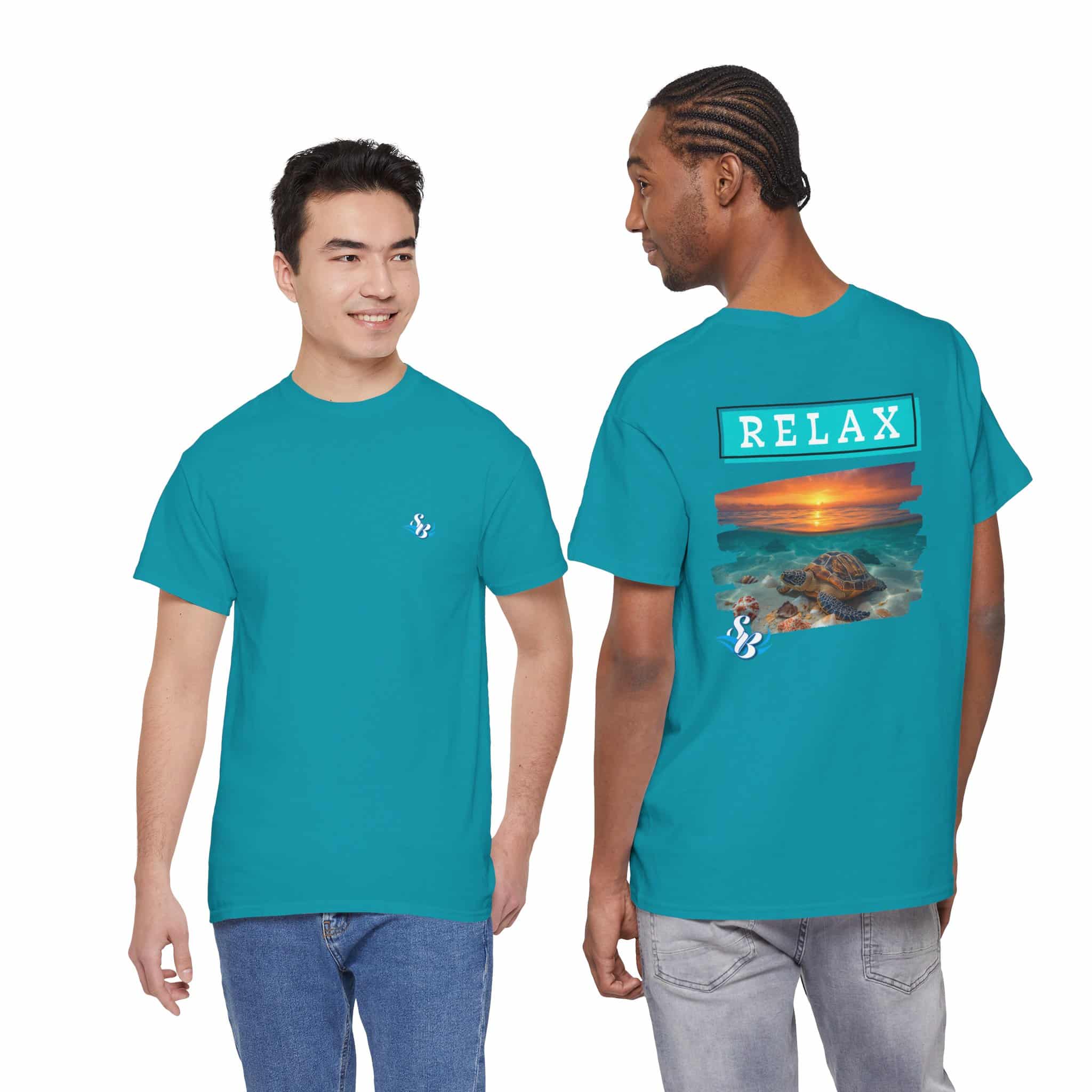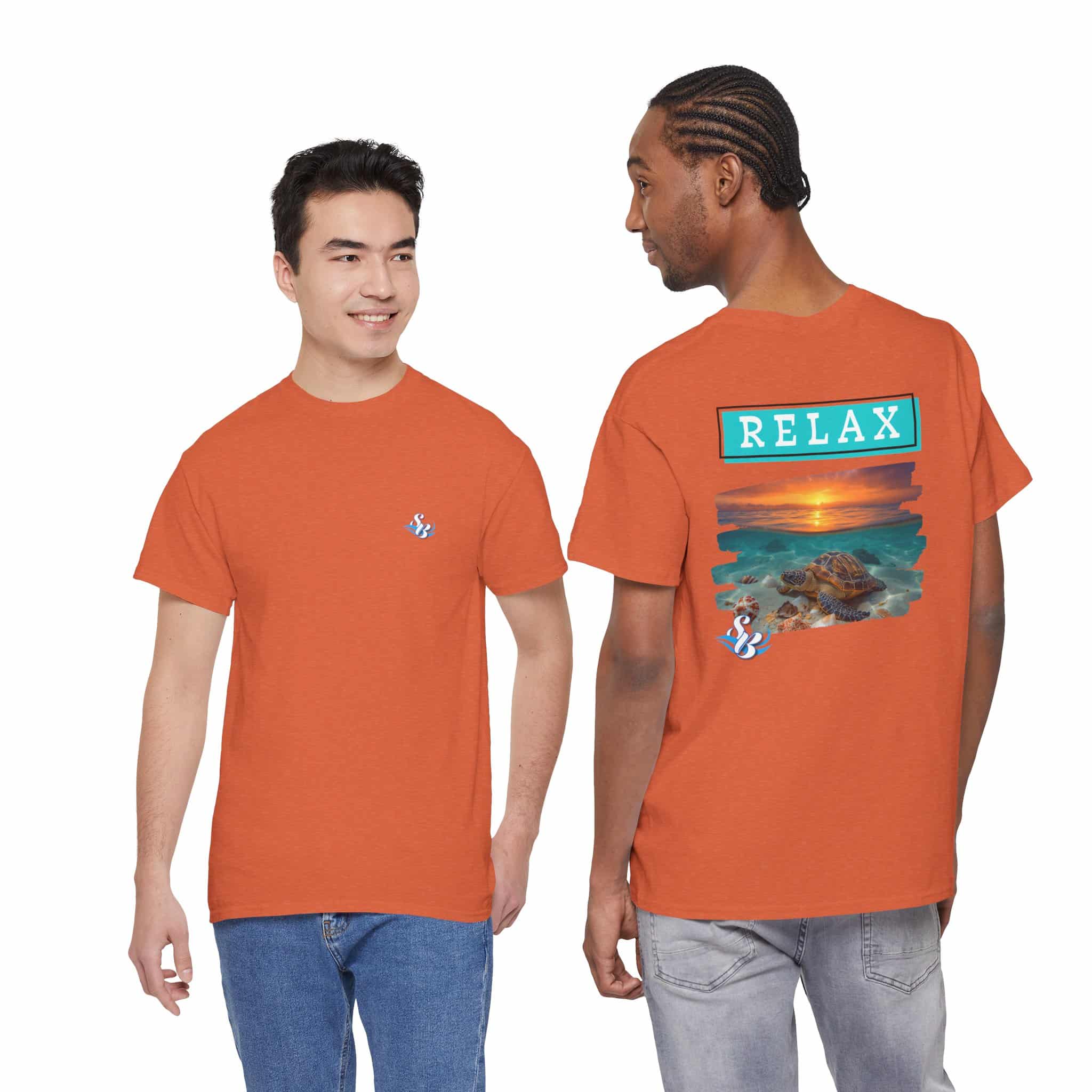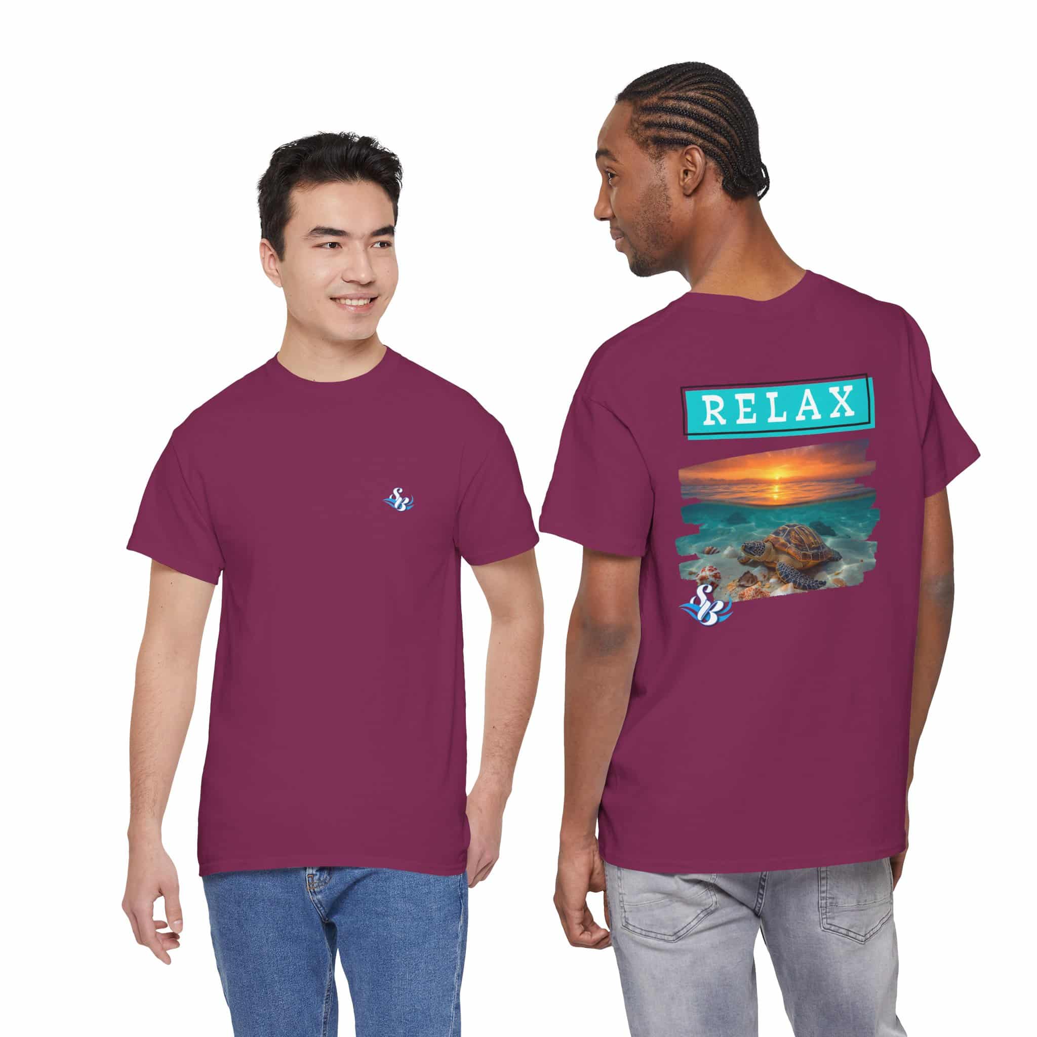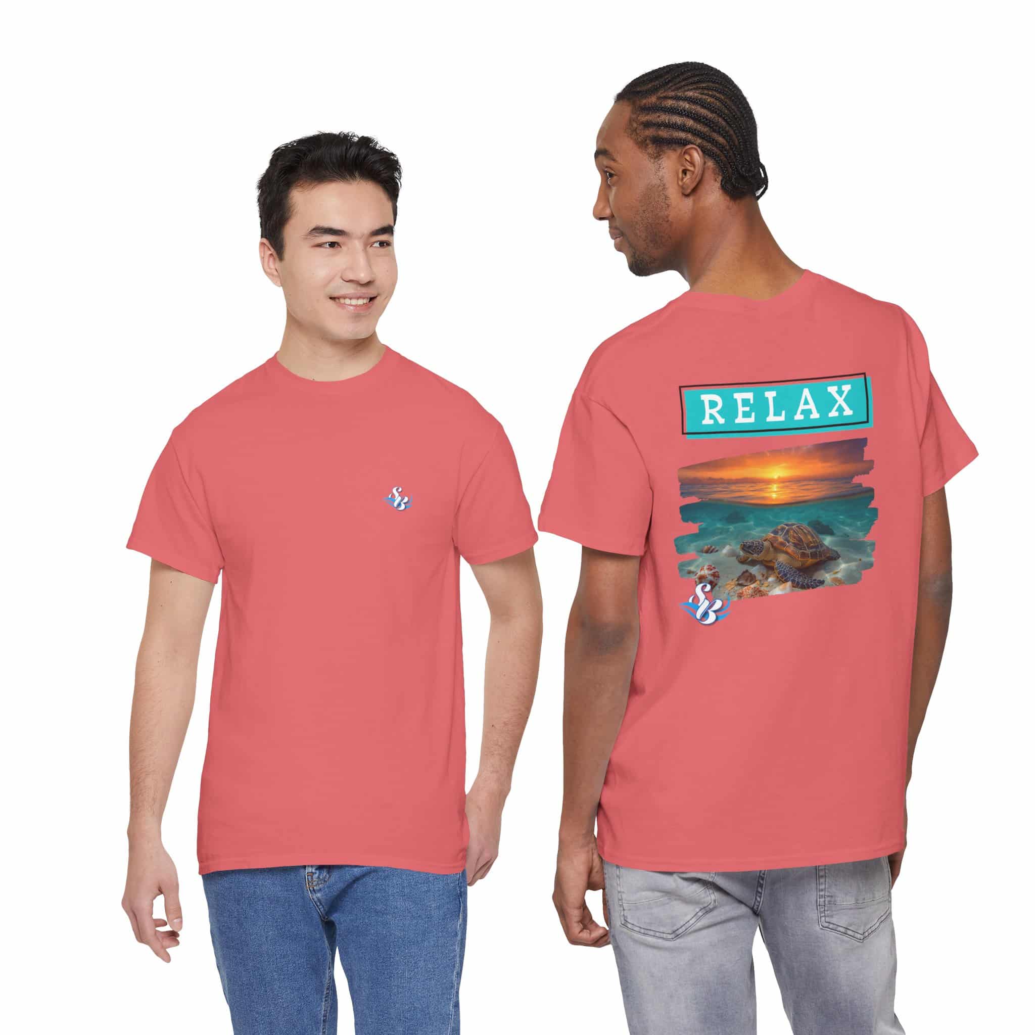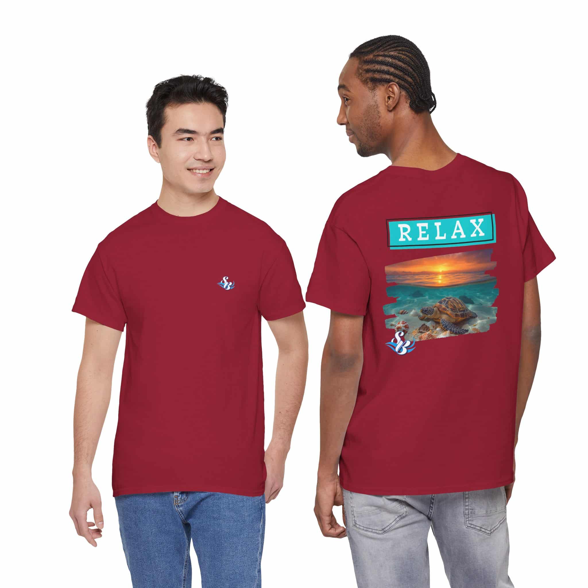 White cotton tee printed with a calming coastal scene that breathes easy energy into everyday wear. The front bears a small, subtle emblem over the heart while the back unfolds into a layered sunset-over-rocks photo with a bold ‘RELAX’ header and a tiny anchor motif — a quiet nod to shorelines and slow afternoons. The medium-weight cotton feels substantial without being stiff, and the classic crew cut sits relaxed across the shoulders for comfortable, all-day wear. This tee slips into morning coffee runs, weekend ferry rides, or slow walks along the boardwalk — wherever you go to unwind.