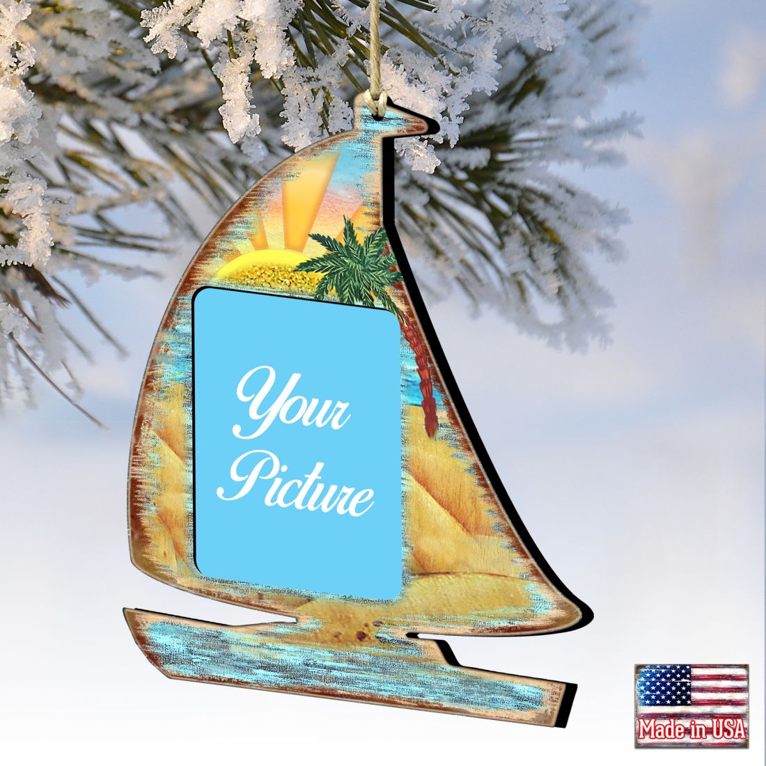 Festive holiday ornaments, Picture frame design – displays a photo with our Sailboat ornament. Shop today and discover unique styles for your home, office, Christmas tree, and more from G. Debrekht Ornaments Store.
