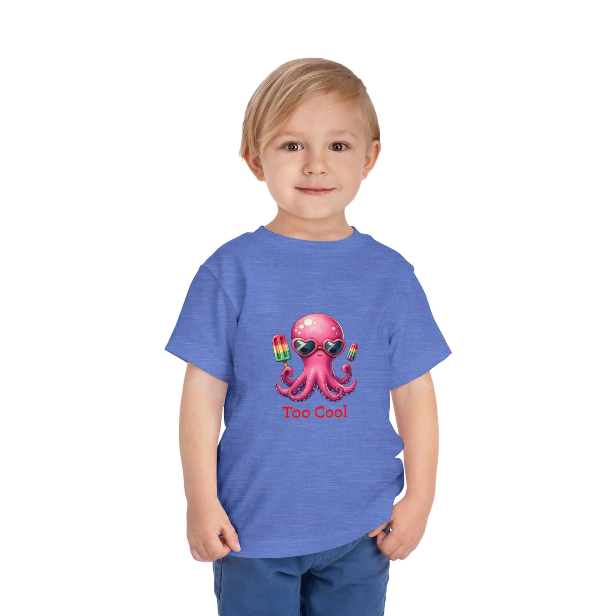 Lightweight, soft, and playfully cool — this toddler tee brings a splash of summer to everyday play. A bright pink octopus wearing sunglasses and holding colorful popsicles sits at the center, smiling with a cheeky “Too Cool” caption that adds personality without being loud. The fine jersey cotton feels gentle against delicate skin, and thoughtful construction (side seams, ribbed collar, shoulder tape) keeps the shirt looking neat wash after wash. It’s a simple, joyful piece that layers easily under sweaters or stands alone for sunny park days.