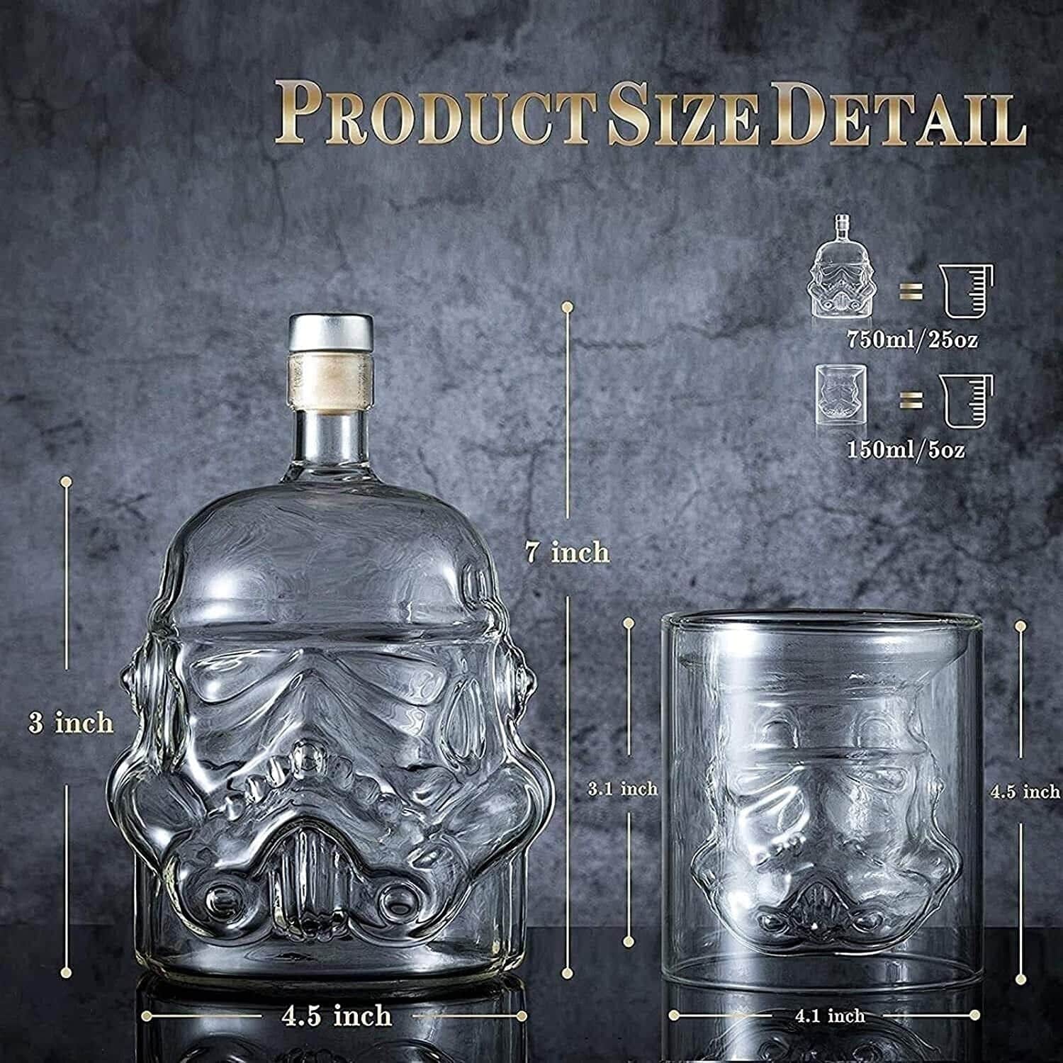 • includes a 750ml whiskey bottle, two 150ml wine glasses and a cork. Enjoy your favor scotch, bourbon, whiskey or other spirits in this beautiful craftsmanship style.